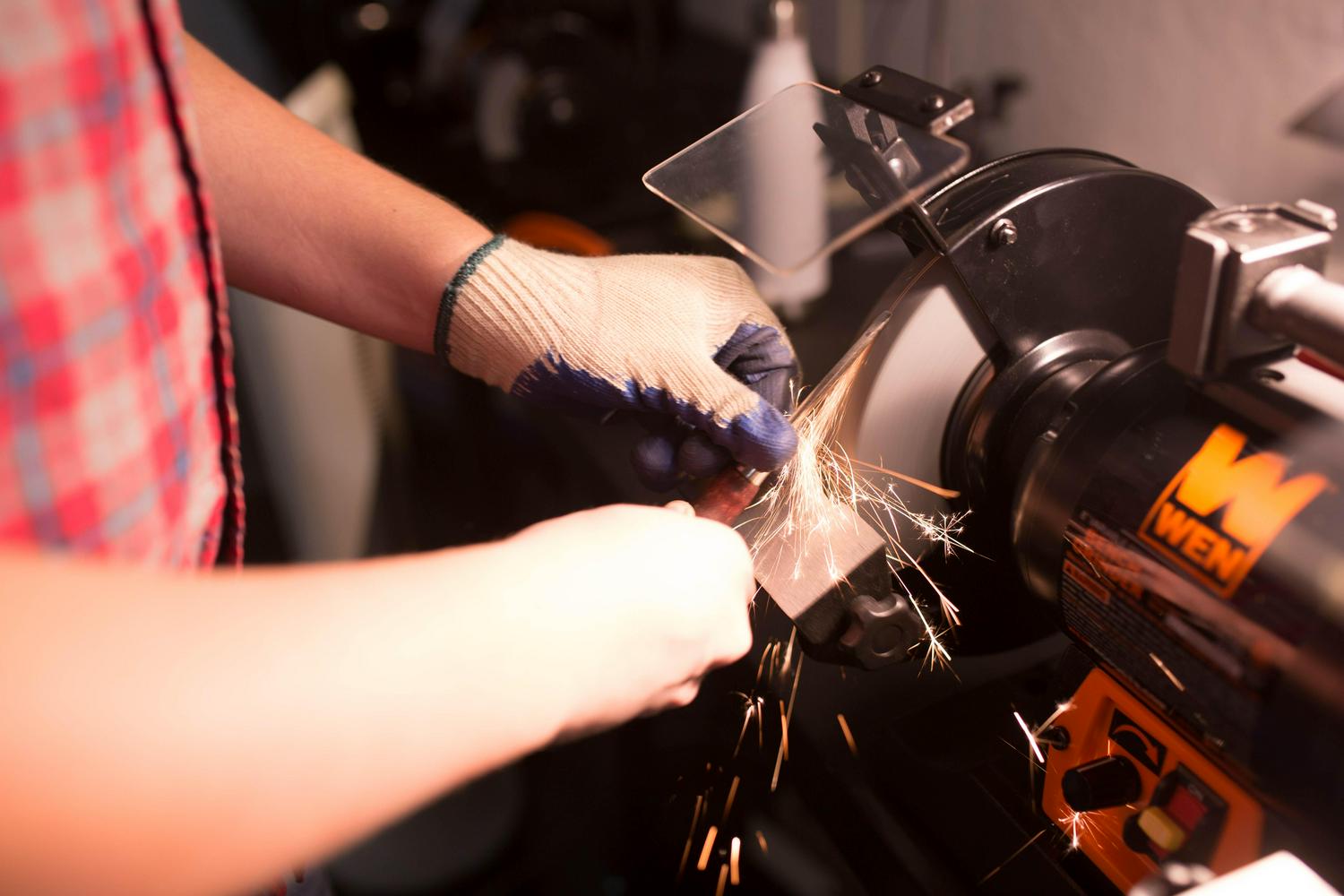 Deburr ragged edges, remove rust and sharpen blades. With a powerful 5A motor, it produces variable speeds, and a rotating knob offers easy adjustment to meet the needs of the task. Choose rates ranging from 2000 to 3400 RPM and use one of the two wheels included with this electric bench grinder. One is 36-grit for general use and the other 80-grit for quicker removal of excess material. Adjustable guards protect eyes from sparks while the flexible work light gives you a clear view of your work piece.
