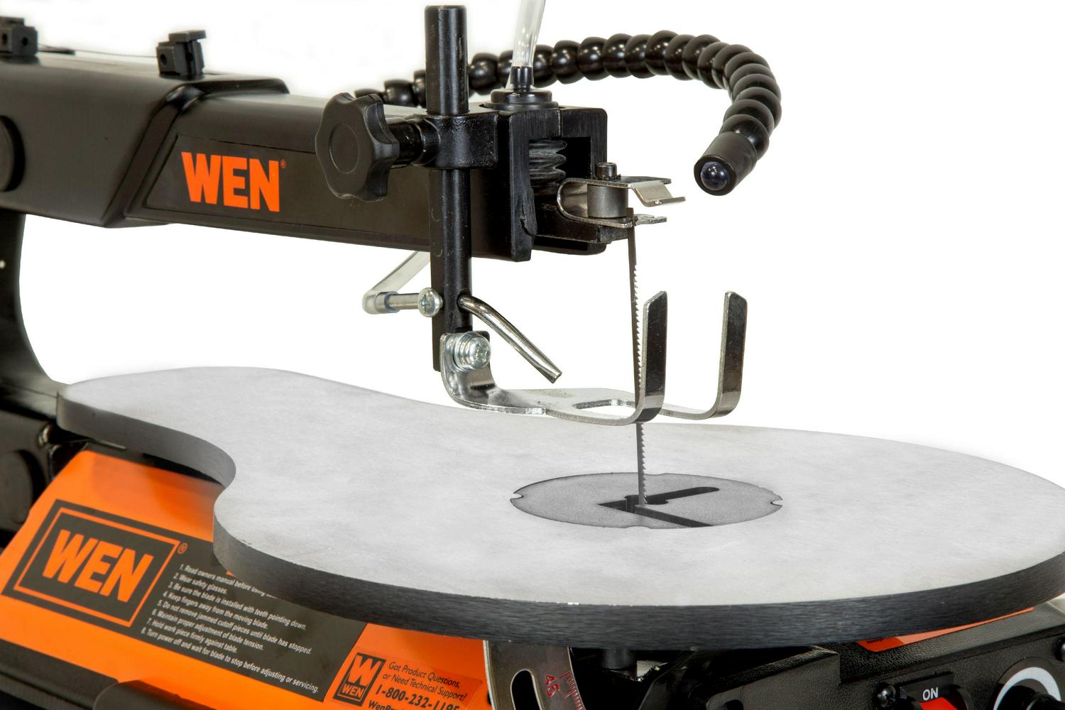Remember when your scroll saw could cut in two different directions. Take on the most intricate and artful cuts with the WEN 16-Inch Variable Speed Two-Direction Scroll Saw. The 9/16-inch stroke saws through hard woods up to two inches thick. Adjust the speed anywhere from 550 to 1600 strokes per minute with the simple turn of a knob. The cast iron base prevents vibration and walking during operation while the spacious 16-by-10-inch table bevels up to 45 degrees for angled cut. The adjustable air pump clears saw dust from your work area to give you a clear line of vision as you cut. This combined with the 1-1/2-inch dust port keeps your work area clean so you can focus on your woodworking. The saw also includes a hold-down foot clamp for securing your project in place along with a flexible work light that bends and adjusts to whatever position your heart desires. This unique blade holder accepts both pinned and pinless blades while also allowing users to change the direction of their cut to accommodate their workpiece. For pinned blades, simply pop the pins out of the front holder and turn the blade 90 degrees. Now, your cuts are no longer confined by the 16-inch throat of the scroll saw. On top of that, our removable pinless blade holder design tightly grips blades to prevent them from coming loose during operation. Onboard blade and holder storage creates simple organization solutions between jobs. And because it’s a WEN product, your scroll saw comes backed by a two-year warranty, a nationwide network of skilled service technicians and a friendly customer help line, all to make sure you remember WEN.