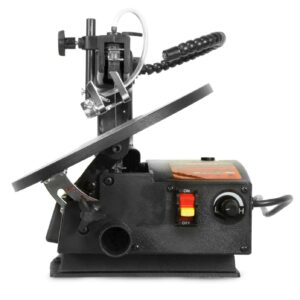 – Features a thumb screw blade adapter for tool-free blade changes, a cast iron base, an air pump, a flex light, a dust port, a foot lock clamp, onboard storage, and three blades