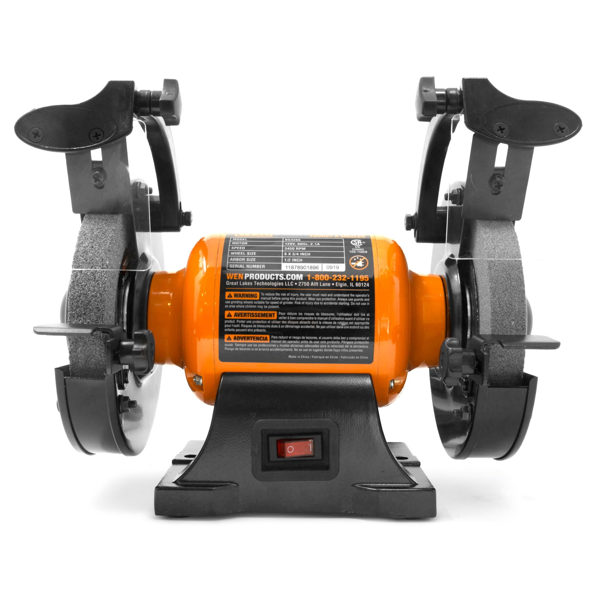 Remember when you spent all that money replacing dull rusty tools from deburring ragged edges to cleaning objects to sharpening blades, the WEN 6-Inch Bench Grinder helps resuscitate old worn down knives, tools, and bits, saving you time and money. Our package includes two 6-inch by 3/4-inch wheels with 1/2-inch arbors: a 60-grit wheel for general purpose grinding and a coarse 36-grit wheel for faster material removal. With our quiet 2.1-amp motor, expect quick startups and smooth performance at speeds of up to 3450 rotations per minute. Built with you in mind, our design makes wheel guard removal as simple as possible for easy wheel changes. Adjustable work rests pivot to allow for angled grinding applications. And because its a WEN product, your 6-Inch Bench Grinder comes backed by a two year warranty, a stocked inventory of replacement parts, and a friendly customer phone line. No need to waste anymore money on new tools. The WEN 6-Inch Bench Grinder revives all of your tools back to their sharp original state. Remember when your blades could actually cut through something. Remember WEN.