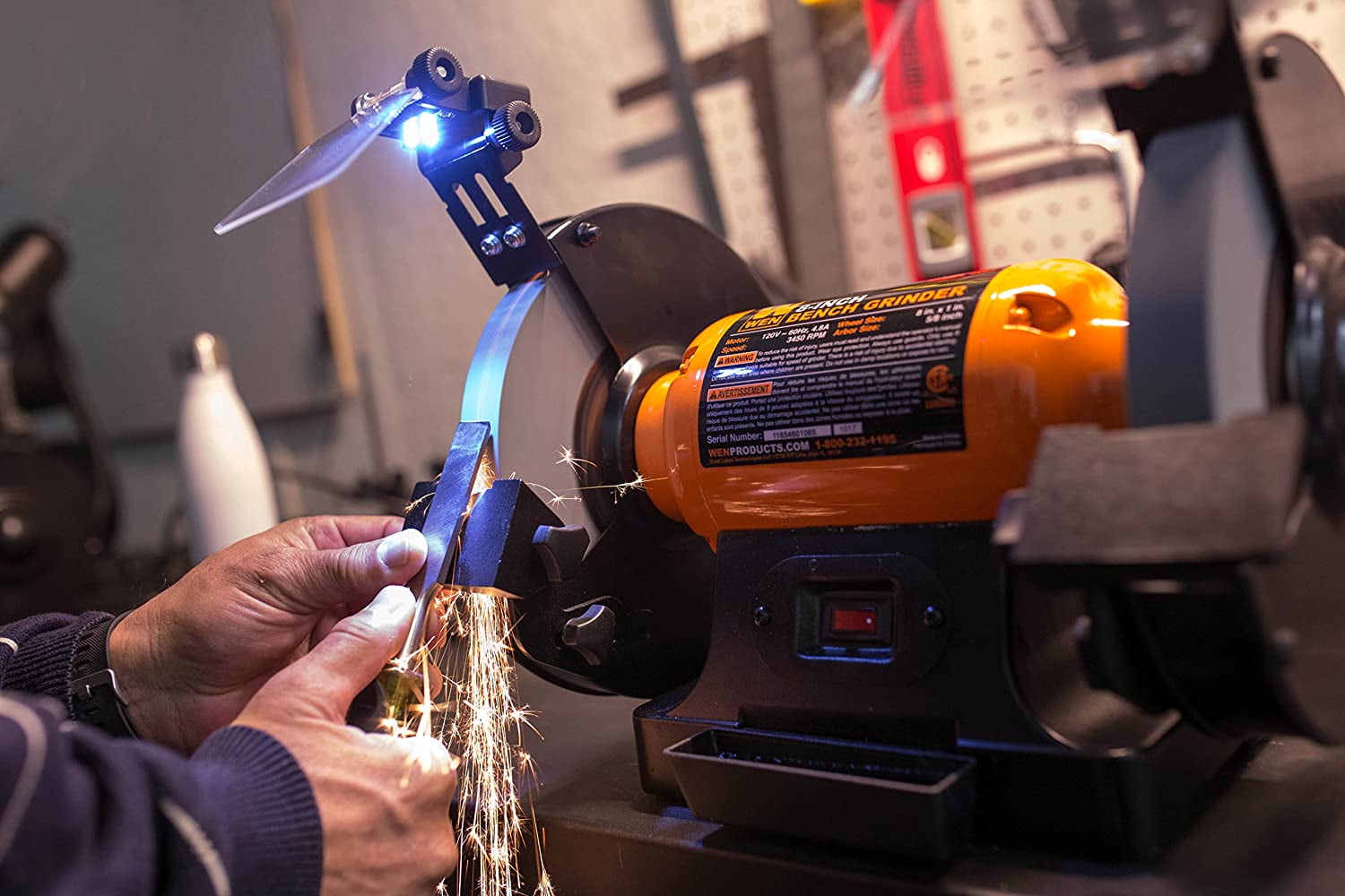 4.8-amp motor turns the 8-by-1-inch grinding wheels at speeds of up to 3450 RPM Perfect for reviving old tools, knives, bits and more Adjustable eye guards include built-in LED lights to keep your workpiece illuminated