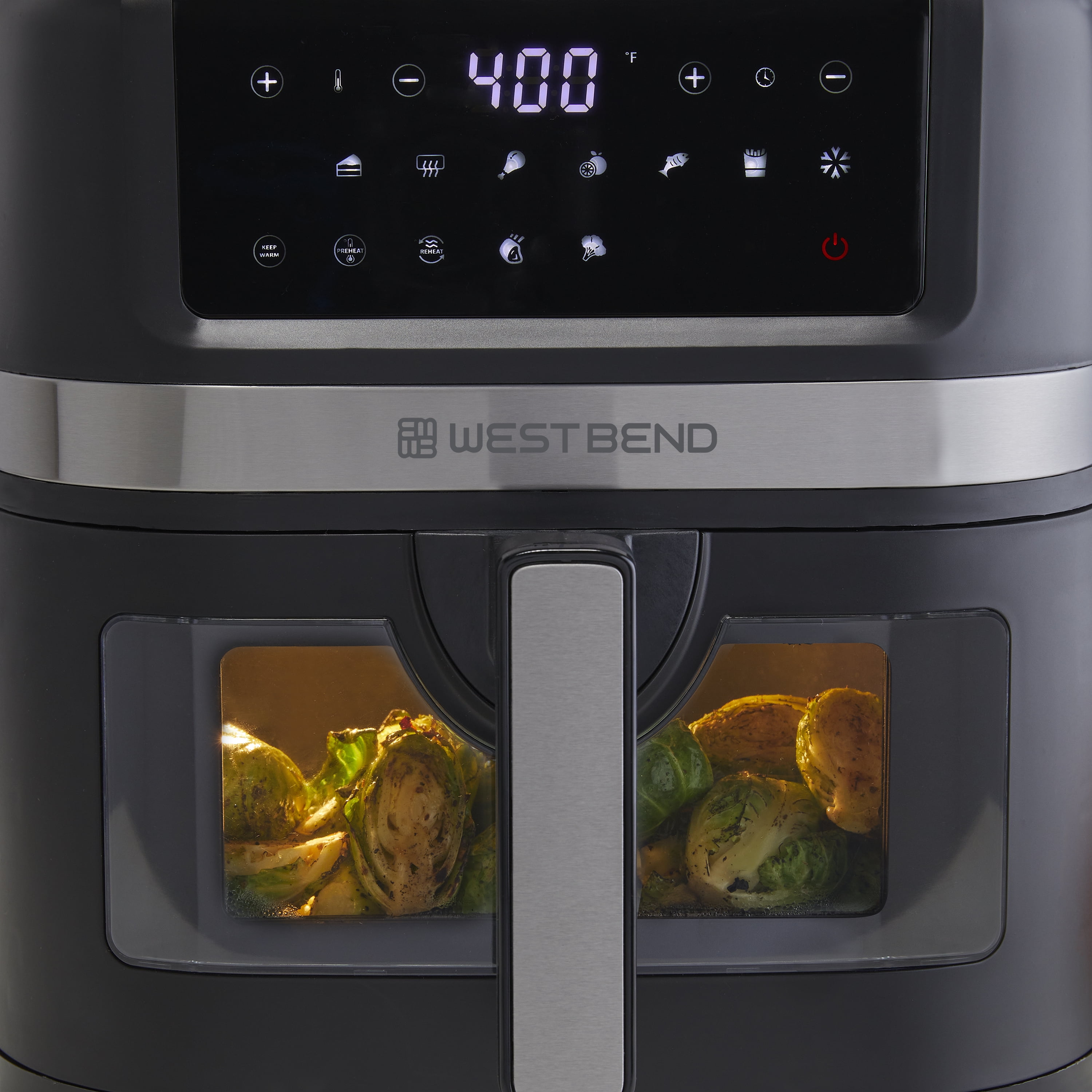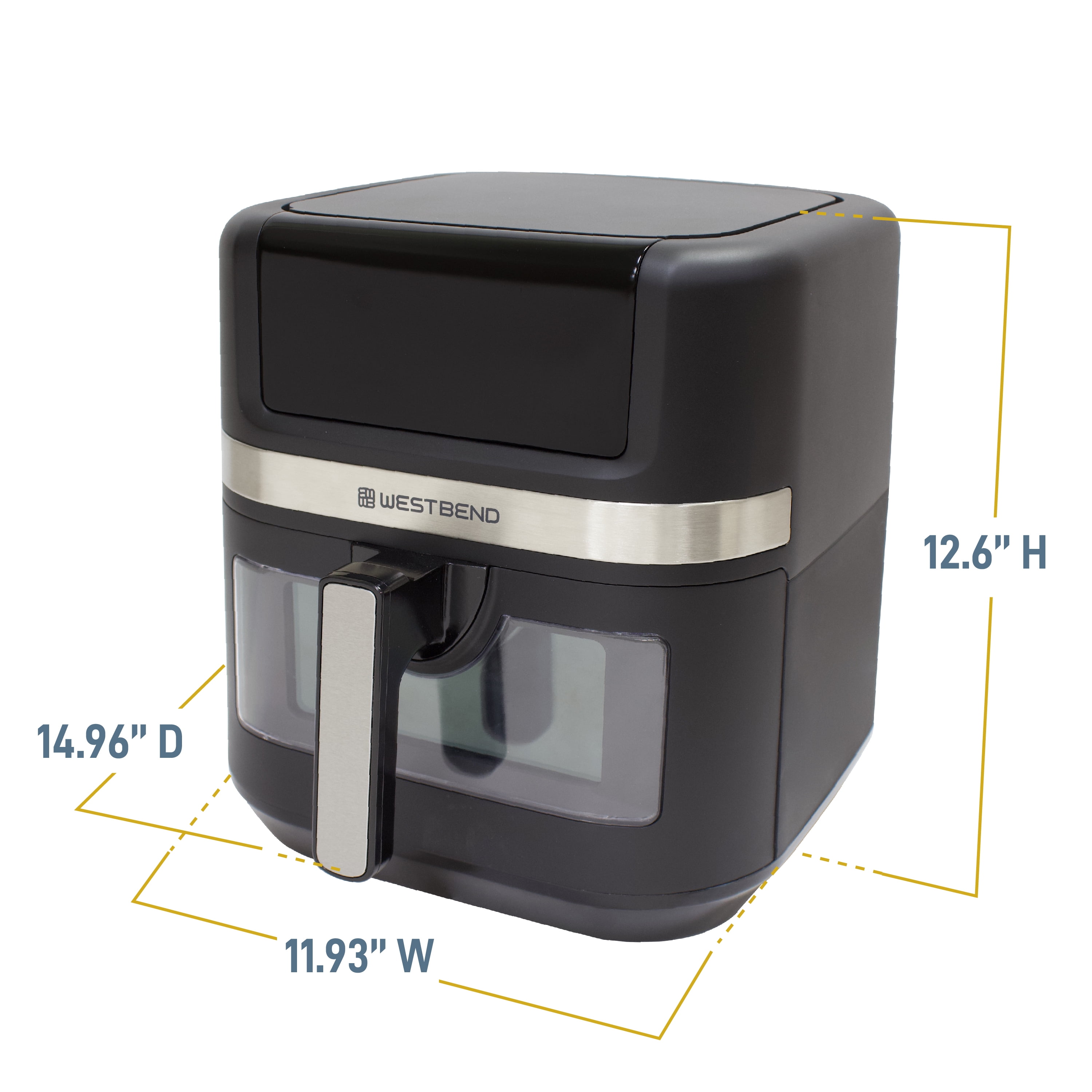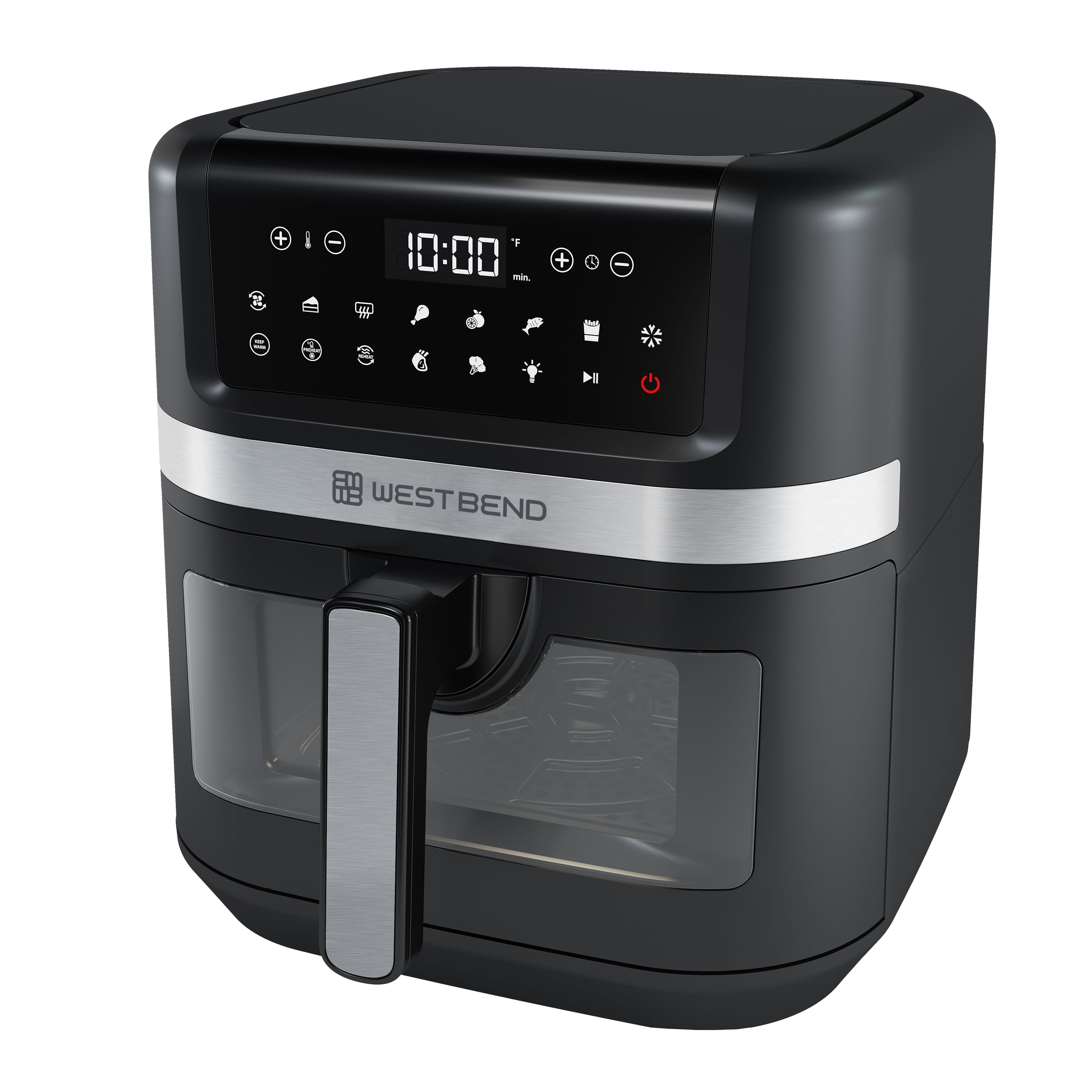 Large 7-quart capacity, ideal for feeding a whole family 13 convenient presets allow you to cook your favorite recipes with a touch of one button: Air Fry, Bake, Broil, Chicken, Dehydrate, Fish, Fries, Frozen, Keep Warm, Preheat, Roast, Reheat and Vegetables Enjoy guilt-free cooking with 75% less fat than traditional deep frying The basket features an easy-view window so you can watch as your favorite recipe is cooked to perfection PTFE-free Diamond Shield™ infused non-stick coated basket for enhanced durability and easy cleanup Touchscreen LED digital interface provides easy access while in use on your countertop Easy-to-grip, ergonomic, cool-to-the-touch handle Dishwasher safe basket and tray for easy clean up 1700 watts of power Covered by the West Bend 12-Month Limited Warranty