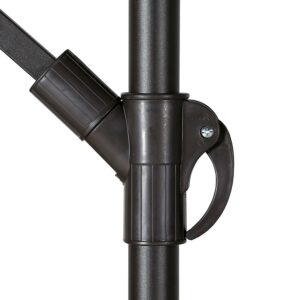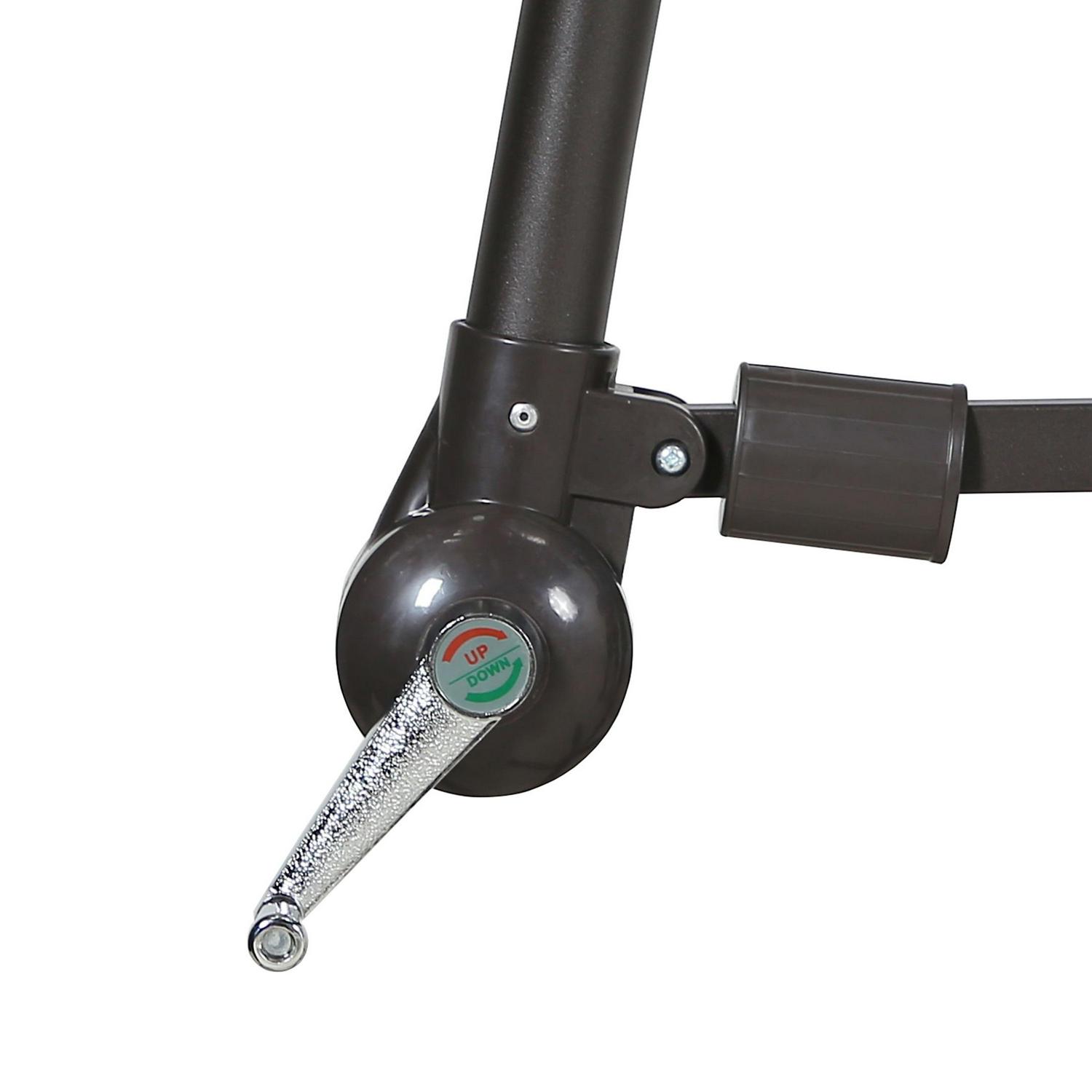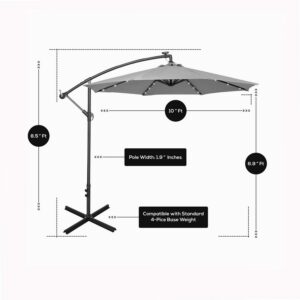 Give your guest a comfortable outdoor shade with this UV & weather resistant solar powered led cantilever patio umbrella. A perfect option because it includes a heavy duty 4-piece weighted base to keep the cantilever umbrella in its upright position when in use. The energy efficient solar powered LED lights continue to provide a smooth light at night. Easy to crank open mechanism and rust resistant materials makes it a great option for any outdoor patio. Everything you need for your poolside, patio, or lounge area.