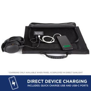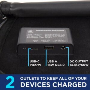 Features a light-weight, tri-fold design with an incorporated accessory pouch. Reinforced grommets provide additional mounting and tie-down capabilities. Powerful monocrystalline solar cells generate up to 60-Watt and 14.85-Volt of power. Solar cells are 23% efficient and are protected by a highly durable layer of ETFE lamination. Charge phones, tablets, computers, and more using an onboard Quick Charge 3.0 USB outlet and USB-C outlet. Simply set up the WSolar60p and plug in your compatible devices for instant on-the-go charging. Includes a convenient, plug-and-play 4-way power cord that incorporates adapters that allow any Westinghouse portable power station to be turned into a self-sustaining solar generator. Features an XT60 plug compatible with the iGen1000s, an 8 mm DC7909 plug compatible with the iGen200s, iGen300s, and iGen600s, a 5.5 mm DC5521 plug compatible with the iGen160s, and a 5.5 mm DC5525 plug for paralleling the WSolar60p with a WSolar100p.