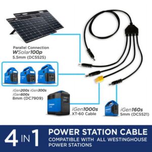 – Includes a convenient, plug-and-play four-way power cord that incorporates adapters that allow any Westinghouse portable power station to be turned into a self-sustaining solar generator.