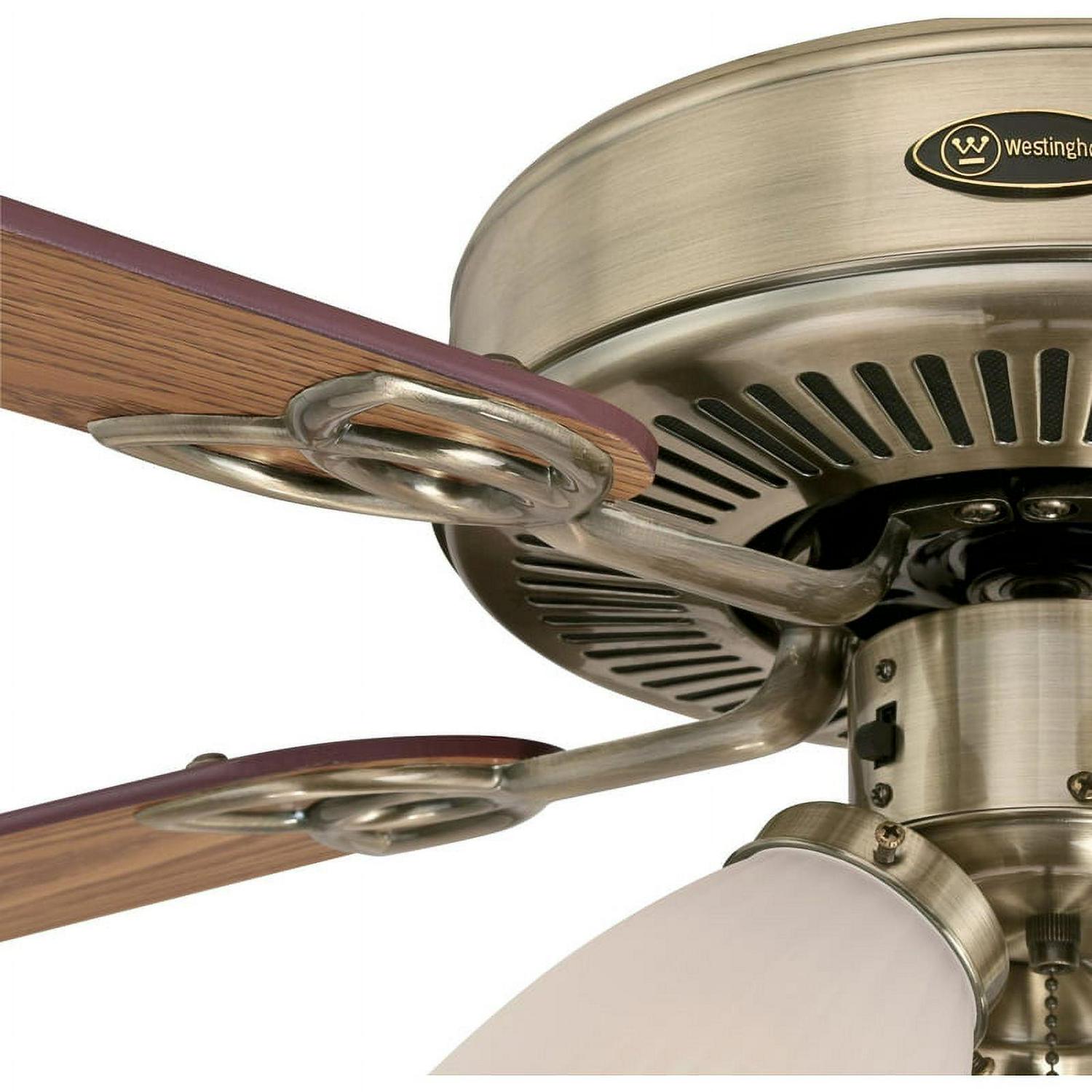 The Westinghouse Vintage 52 inch ceiling fan with light adds traditional style in larger rooms. Featuring a light kit with frosted ribbed glass shades and dimmable LED light bulbs, this LED ceiling fan provides bright, energy-efficient lighting, in addition to year-round comfort. The antique brass finish and coordinating reversible wood finish blades will enhance any room. Choose oak or walnut blade finish to complement your decor. Westinghouse is a trusted, global brand. Westinghouse knows lighting and offers products with exceptional quality, reliability and functionality.