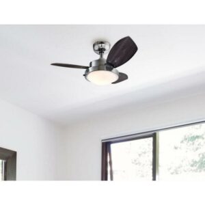 The compact Westinghouse Wengue 30-inch LED ceiling fan combines bold, casual style with high-quality performance. A chrome finish with reversible Wengue and beech finish blades offers a modern ceiling fan aesthetic. This small ceiling fan with light from integrated LED features opal frosted glass for bright, long-lasting illumination. Westinghouse is a trusted, global brand. Westinghouse knows lighting and offers products with exceptional quality, reliability and functionality.