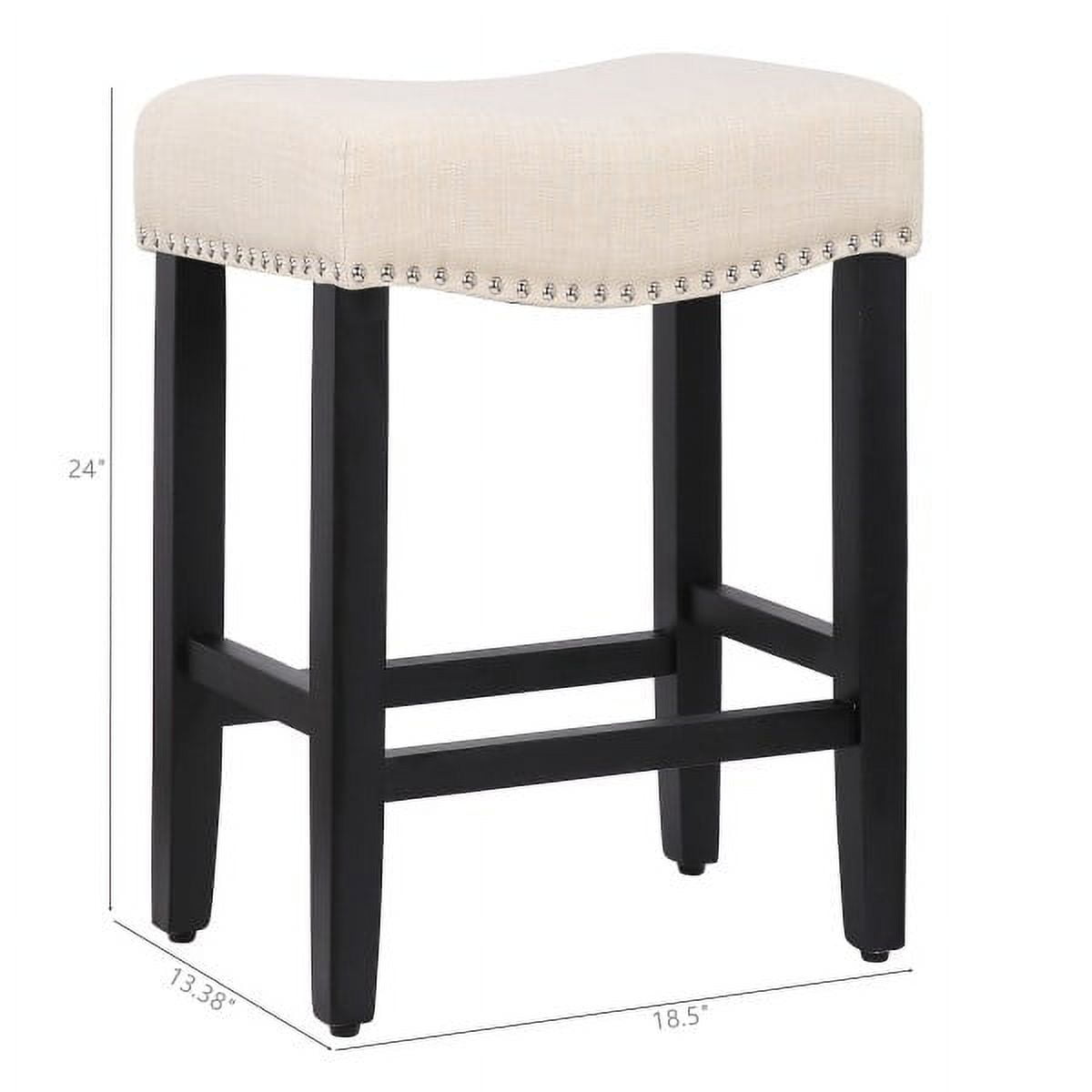 Saddle Stool Seat Cushion – 3.74 inch thick padded counter stools provide with more comfortable sitting posture. The ergonomic design bar stools cushion fits the hip line, perfect sitting experience. Bear up 250 pounds – Solid rubberwood frame features excellent sturdiness, not easy to deform. The legs made of solid rubber wood are sturdy enough to offer firm and reliable support for you, which can bear up to 250 lbs. Stylish Design – The black wood grain finish and various bronze rivets around the seat that add aesthetic beauty to the bar stool. Stylish appearance makes it a perfect complement to either your dining table or kitchen counter. Easy to Store – The 24″ height barstools are suitable for 34″-40″ height tables.You can slide the stool right under the bar or counter. Backless barstools are properly stored and tucked under counter, saving space for your house. Easy Assemble: 15 minutes assembly with easy-to-follow instructions, tools, and hardware included. 1 Year manufacturer warranty – try for 30 days.