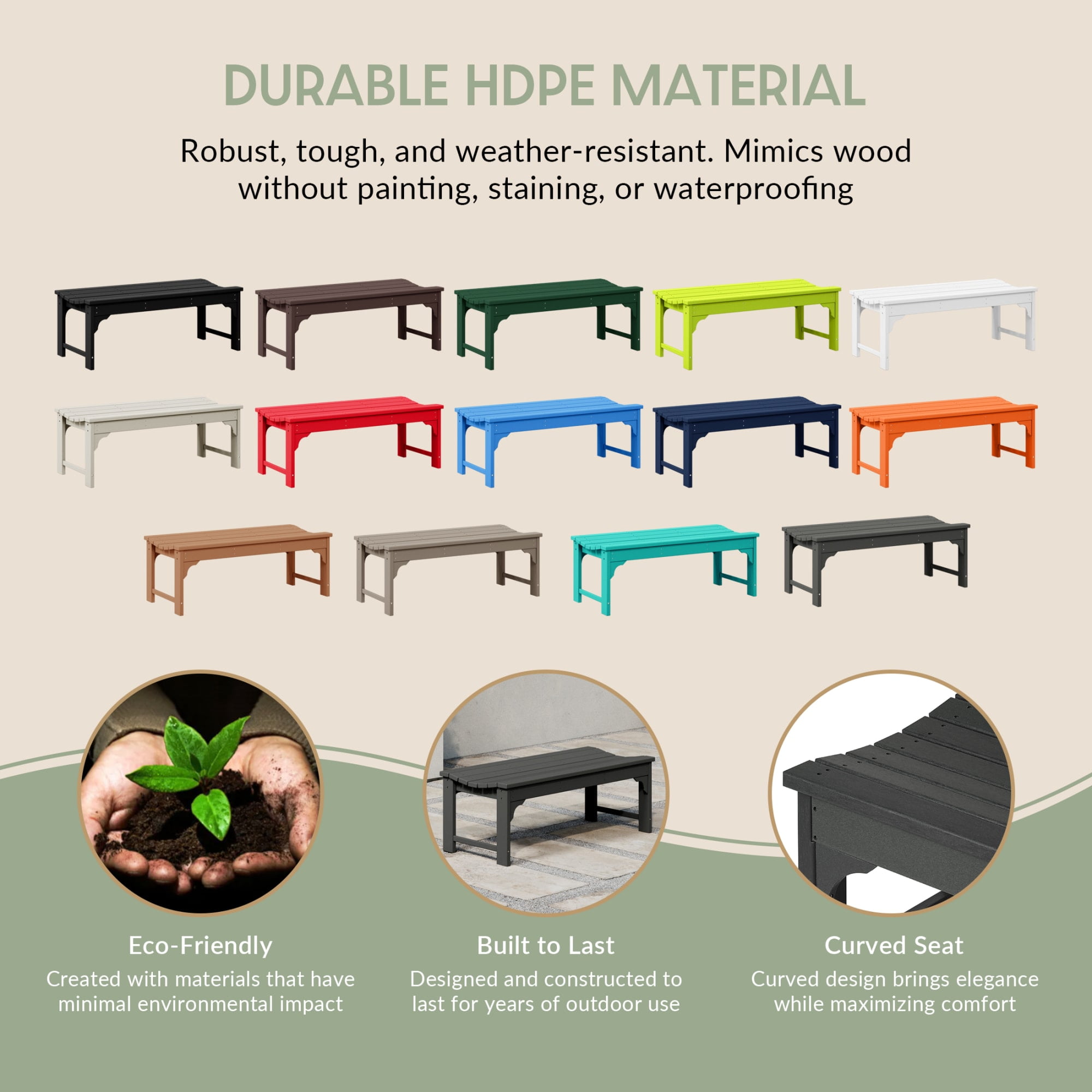 Make your backyard or garden a bit more magical with this amazing bench. Create a place of comfort and relaxation on this 46-inch-long bench, which has a contoured seat that makes it comfortable to sit on for hours. Built to last with HDPE material that reinforces and adds durability, as well as a weather and UV resistant treatment that keeps the vibrant color and material looking new season after season.