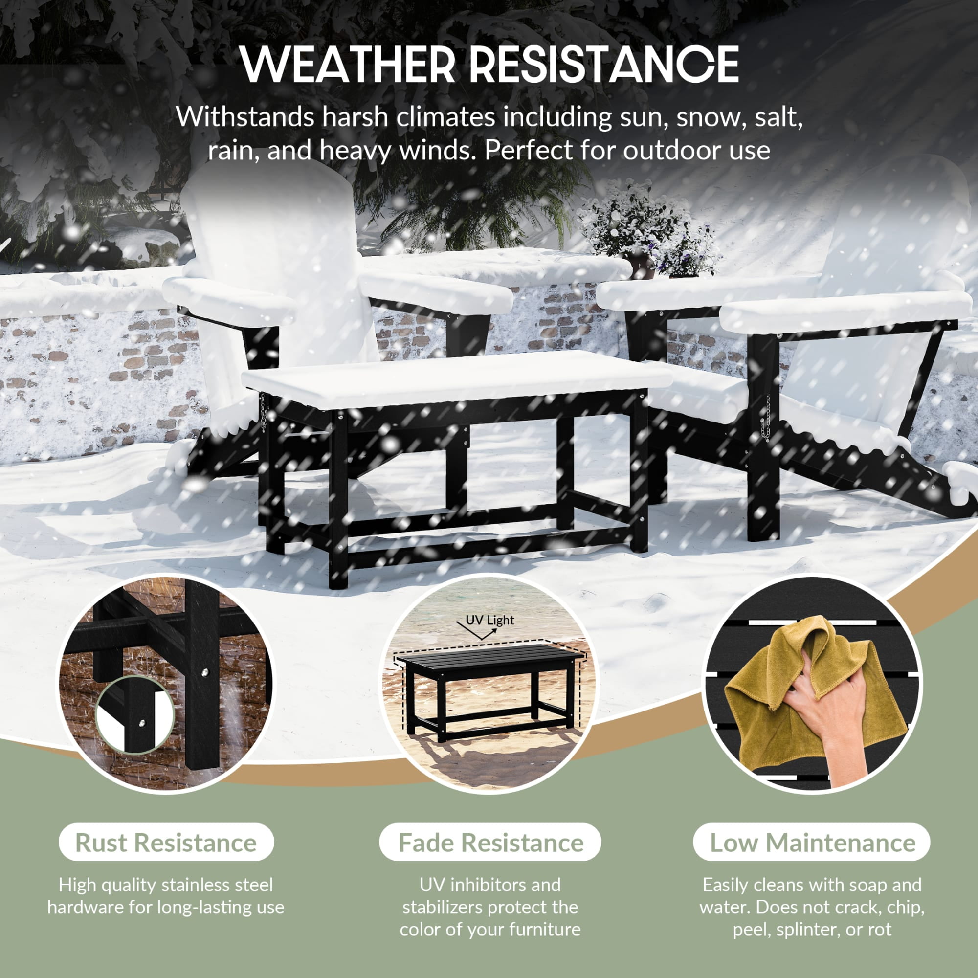 Adirondack Coffee Table: This trendy coffee table will cover all your outdoor lounging needs. Use it as an ottoman or storage spot for snacks and beverages. This coffee table is the perfect companion for adirondack chair, chaise lounge and rocking chair. All Weather Resistant: The patio coffee table are made of HDPE plastic, its weather resistant and UV fade resistant material can withstand in various enviromental pressure and not easy to dent, crack, peel or rot as wood. Multi-Use Appearance: The slatted top infuses a rustic style, farmhouse-inspired touch that naturally sheds rainwater. Dynamic use in patio, garden, lawn, porch, pool area to complement your adirondack chairs for party and picnic, also suitable in living room, bedroom. Maintenance Free: Requires no painting, staining, waterproofing, or similar maintenance. You can clean easily with soap, water, a soft-bristle brush or sanding sponge. 90% Pre-Assembled: This adirondack coffee table will come with 3 parts, clear instructions and necessary hardware provided. Only need 3 steps according to the manual included, and you will get a outdoor table.