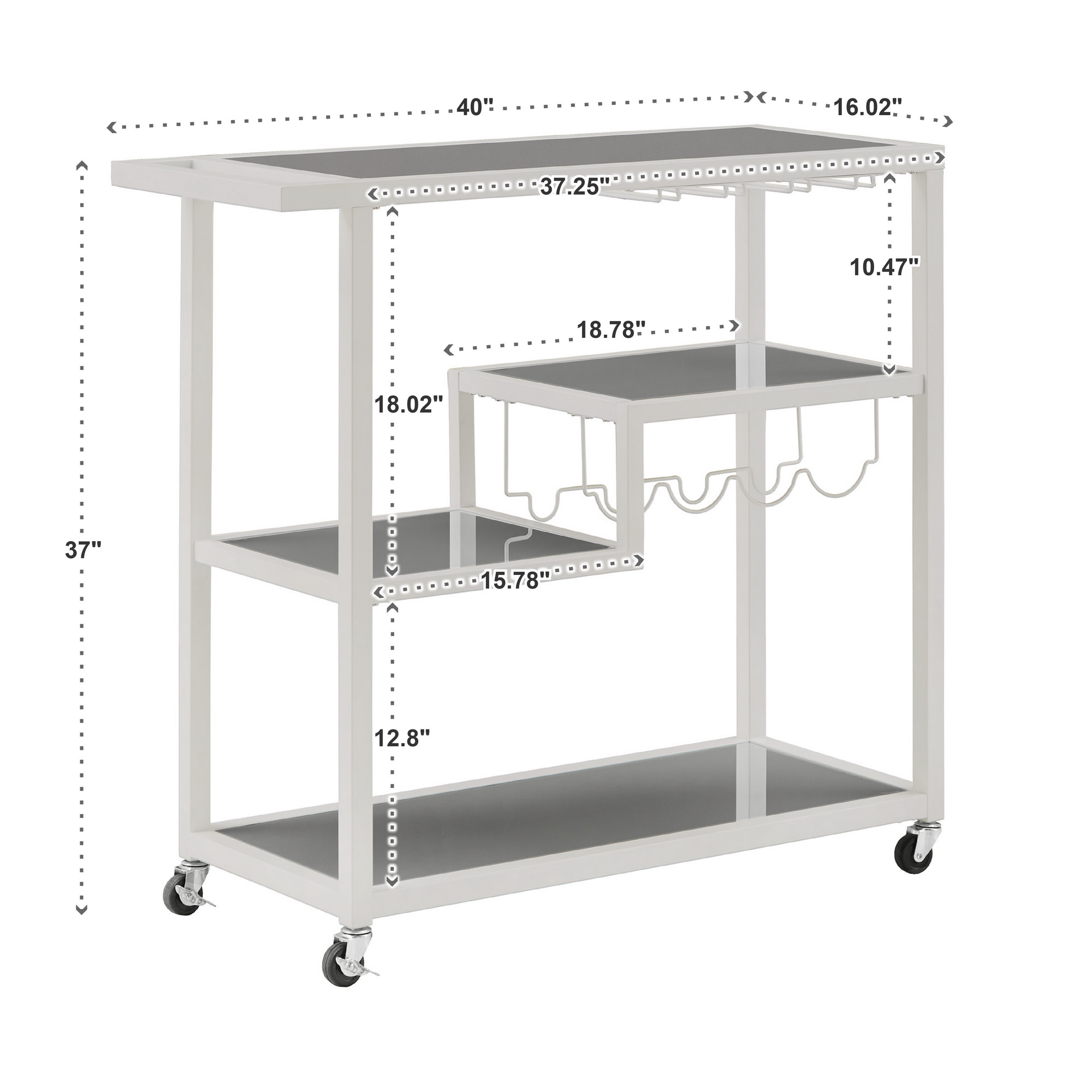 Overall dimensions: 40 in. width x 16 in. depth x 37.4 in. height Clearance under cart: 5.2 in. Includes one (1) bar cart Metal frame Four (4) glass shelves with black backing Wire rack holds up to four (4) bottles Features four (4) stemware racks for glasses Two locking wheels keep cart in place Constructed with steel, glass, plastic, and plywood White finish metal frame Tempered glass shelves