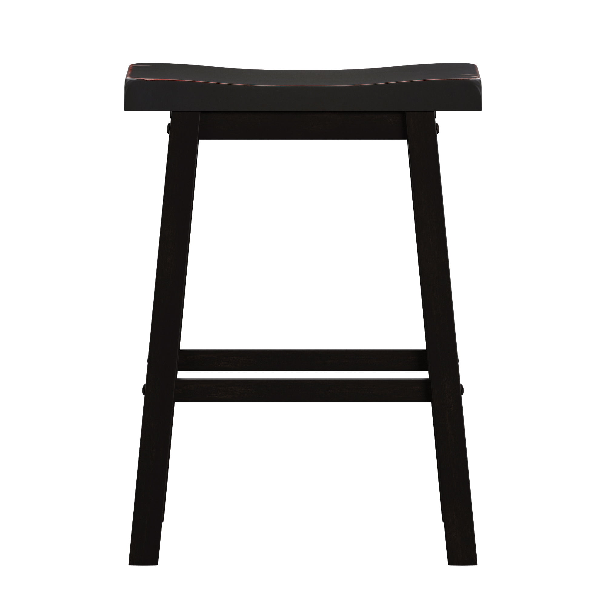 Set includes two (2) black finish backless barstools Overall dimensions: 18 in. width x 15.63 in. depth x 28.62 in. height Ideal for 40–42-inch table heights Individually hand distressed for a unique look so no two pieces are identical Saddleback seat design Made with solid rubberwood 29″ seat height Ships in one (1) box Assembly required