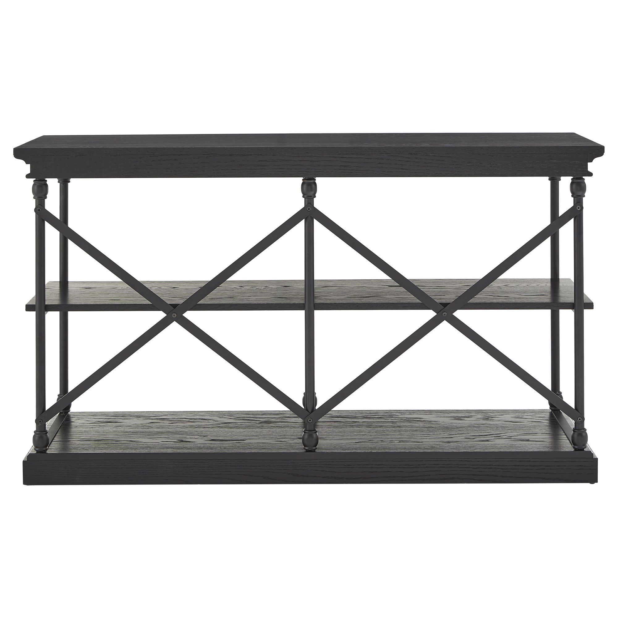 Includes one (1) black finish console table with two (2) shelves Can hold Tv’s up to 65″ Features an X-Back Overall dimensions: 60 in. width x 19.4 in. depth x 34 in. height Bottom shelf: 55 in. width x 15.9 in. depth x 13.5 in. height Middle shelf: 58.1 in. width x 15.9 in. depth x 13.5 in. height Height from inner bottom shelf to bottom of the top shelf: 27.7 in. Powder-coated black metal finish Visible wood grain finish shelves The underside of the shelves is not finished Constructed with wood, veneer, and iron tube Assembly required Ships in one (1) box Available in black, brown, grey and ivory white finishes