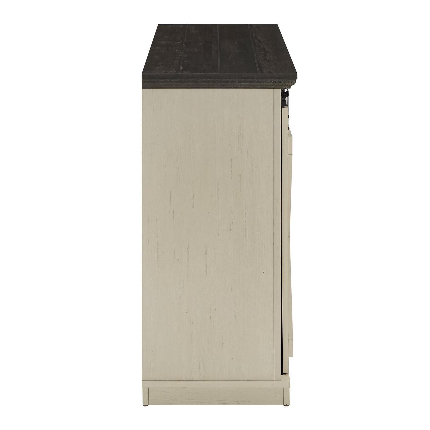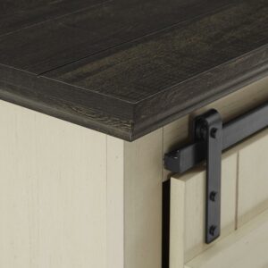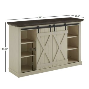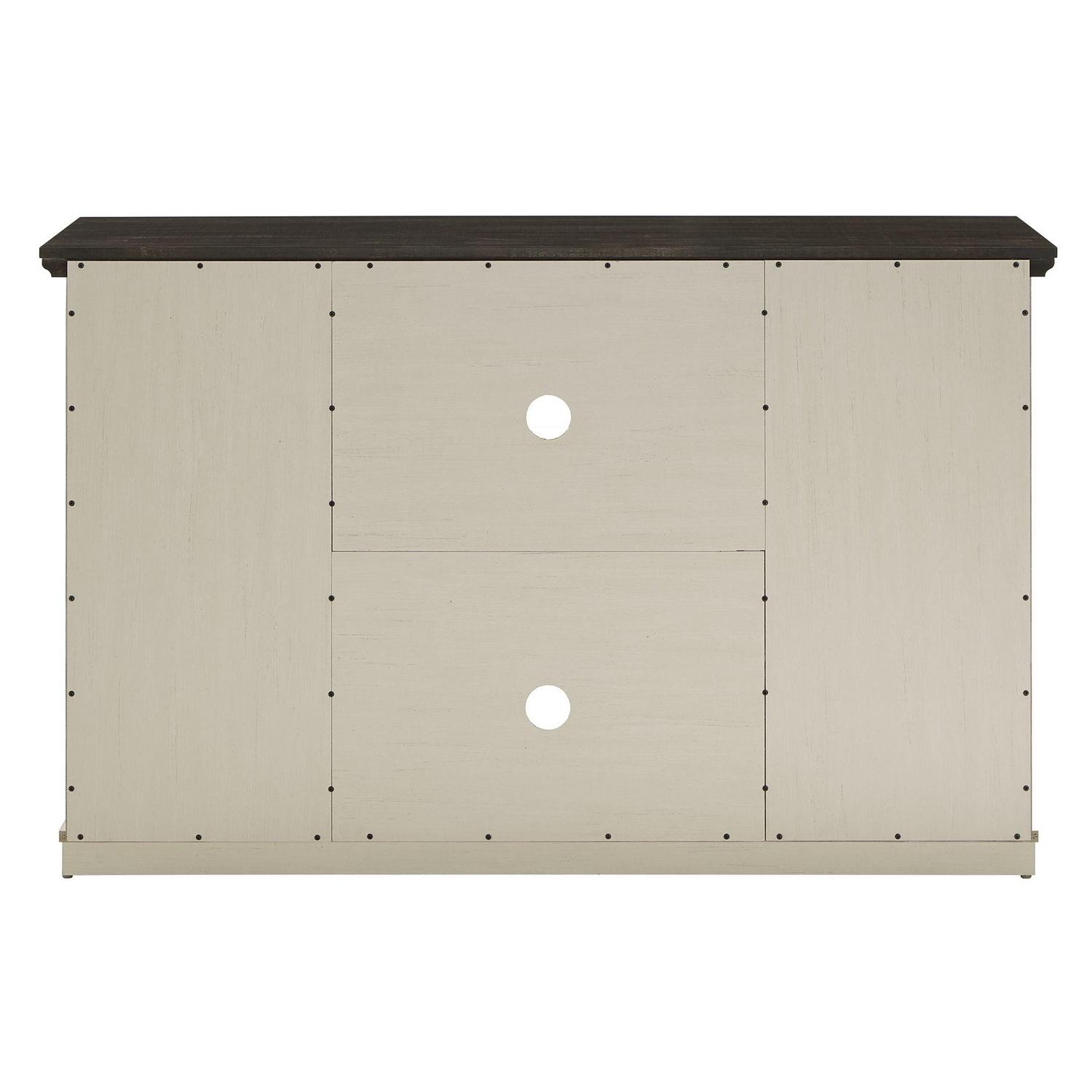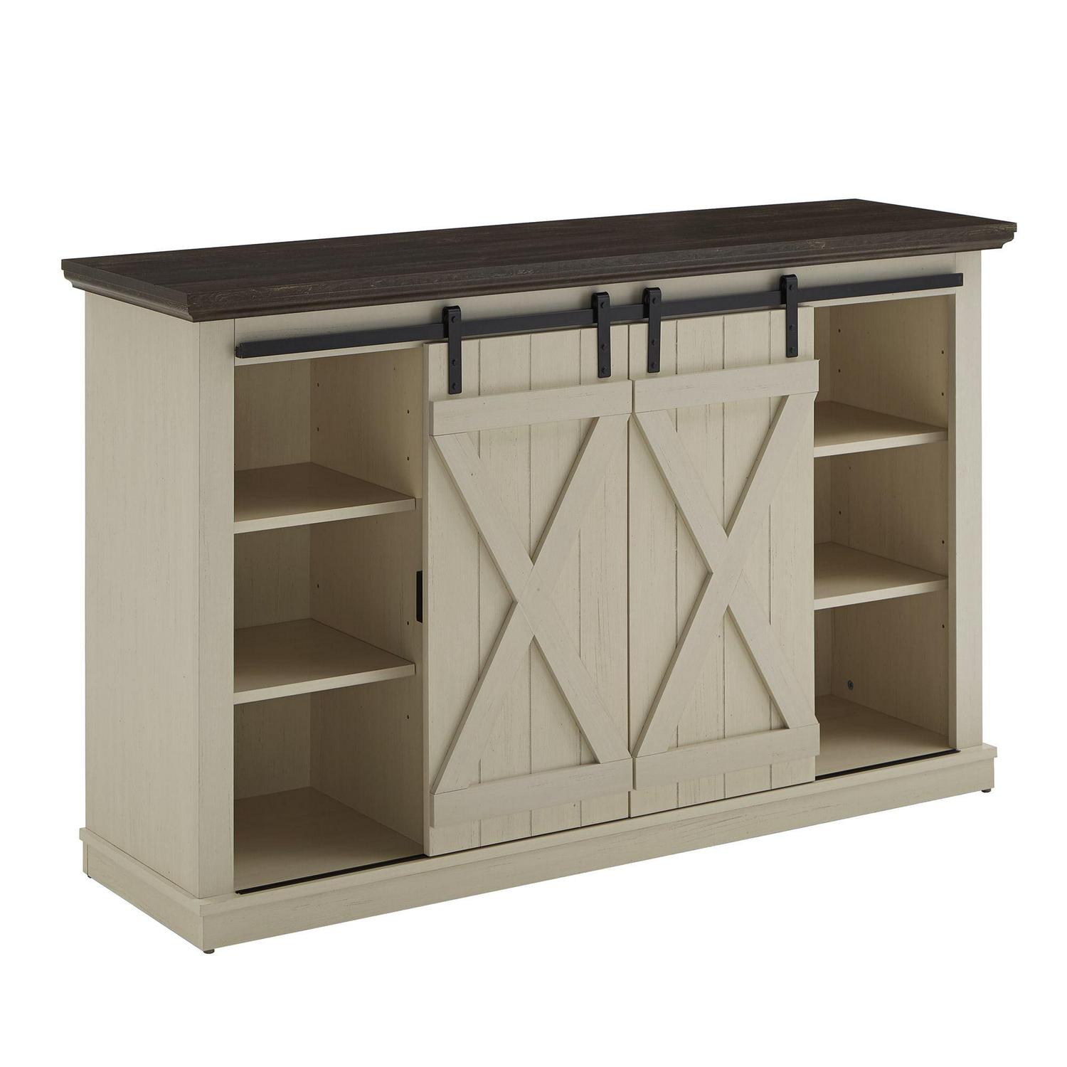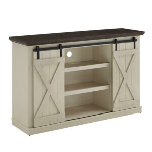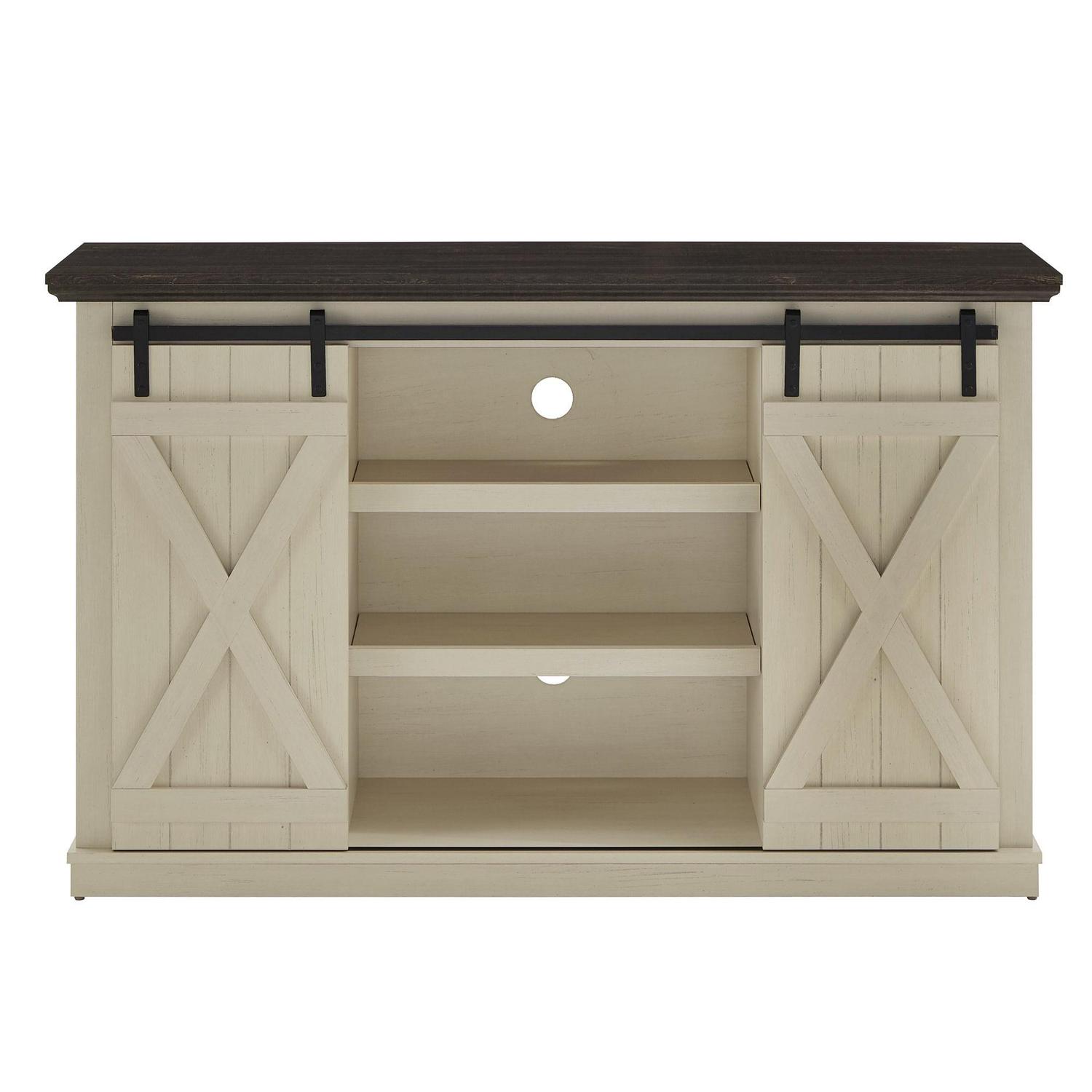 Timeless farmhouse barn doors add a rustic element to this two-tone white & black finish tv stand-by Weston Home. This stand is fixed with two (2) holes to allow cords to have easy access to outlets. Perfect for those with traditional tastes, each barn door can move from left to right to allow you to showcase keepsakes, or to store your items neatly hidden and out of sight. Add a touch of vintage charm to your classically styled living room with this detailed piece.