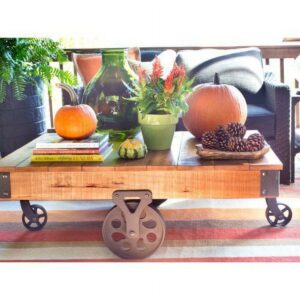 The Clayton Cocktail Table combines wood touches mixed with metal for a contemporary retro feel. The table is composed of sturdy wood and has a gorgeous woodgrain texture. Wheels make it easy to reposition the table.