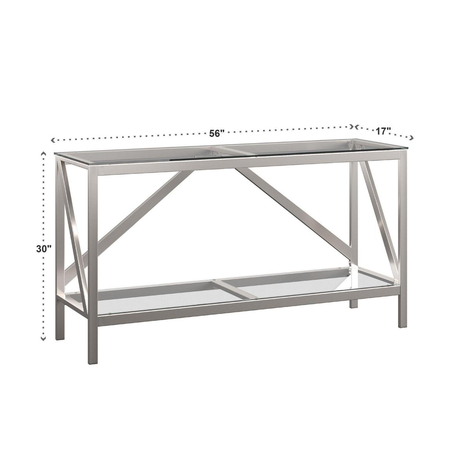 Weston Home | Beautiful and modern, the Erika brushed nickel TV stand or entertainment center adds unique style to your living space. Accommodates TVs up to 60 inches. Prominently display your home décor and accessories on the two glass shelves that add simple, luxurious detail to the piece. An open style frame features a visually attractive brushed nickel that adds major style points and stability to the piece. Please allow slight color and scale of the pattern deviation due to light and display. Size may vary a little due to manual measurement.