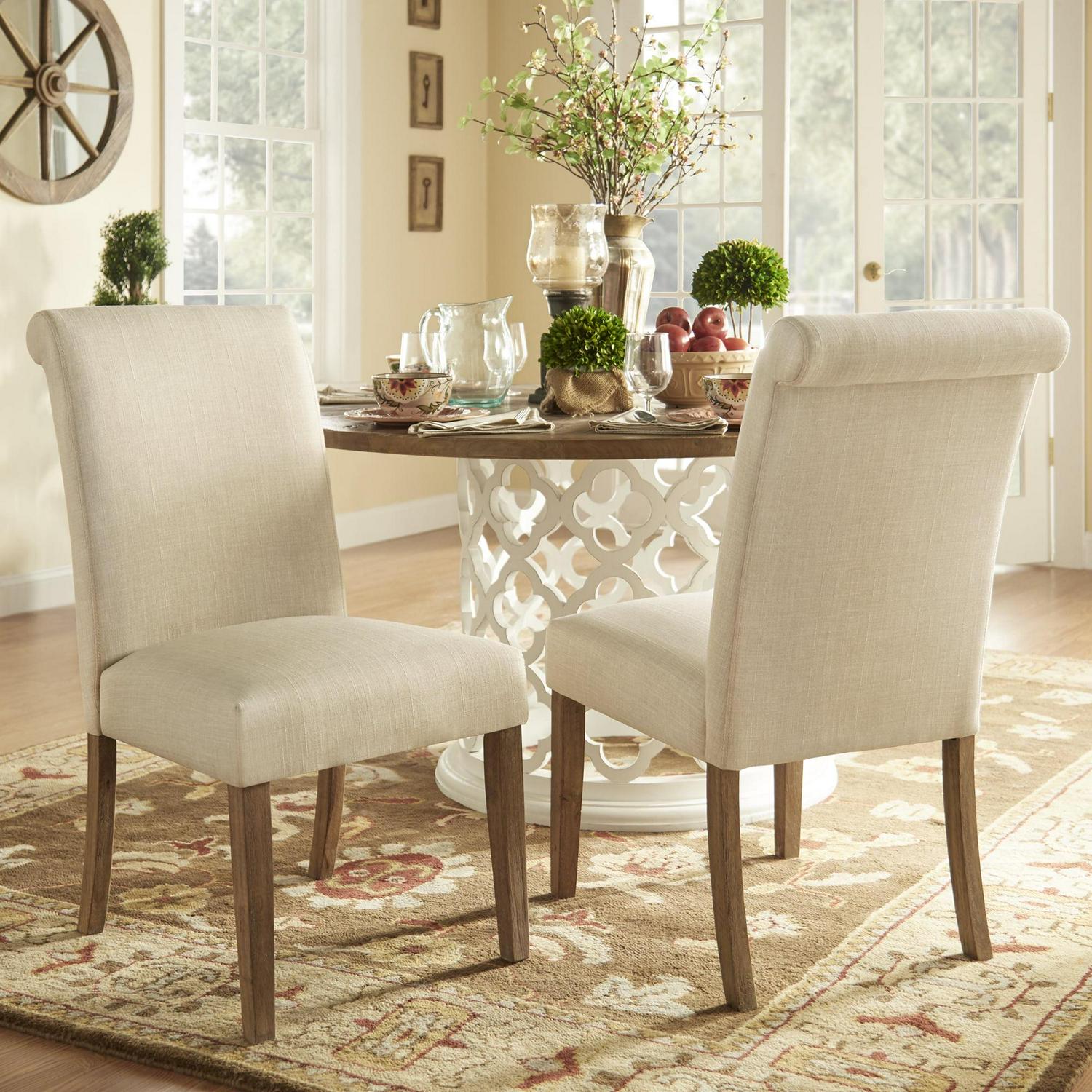 Invite friends and family over for your next dinner party with the Weston Home Josephine Slipcovered Rolled Back Parsons Chairs (Set of 2) as part of your dining ensemble. Crafted with durable rubber wood to withstand regular use, these chairs have foam-filled cushioning upholstered in soft beige linen for lasting comfort. The exposed, distressed natural finish on the legs add a slightly rustic touch while rolled chair backs and neutral-colored slipcovers add timeless grace and elegance.