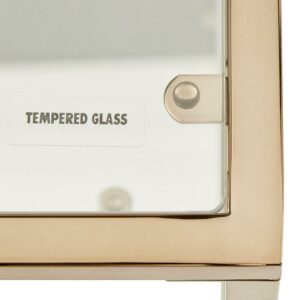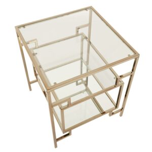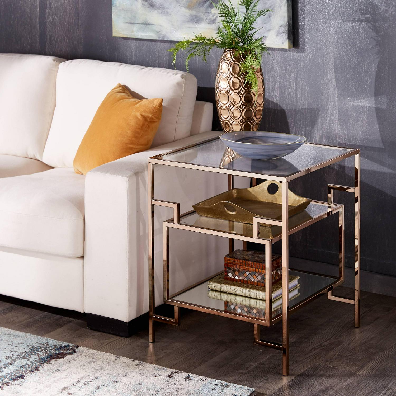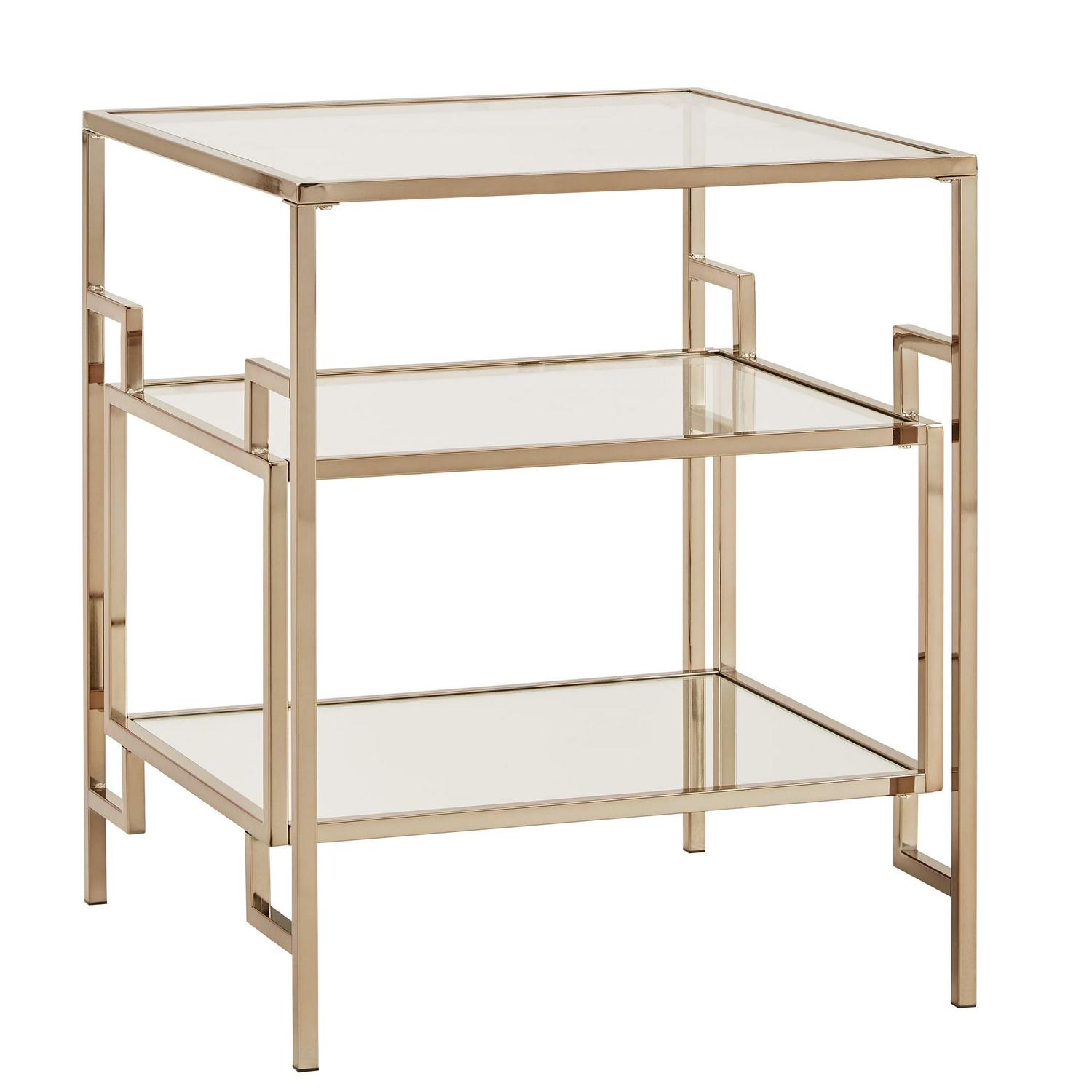 Don t settle for a dime-a-dozen, simple wood end table in your new living room. The Weston Home Katrien End Table provides ample space for your table lamp, casual reading materials, and more. Its square top is made from clear tempered glass with two mirrored lower shelves. Squared metal constructs the frame, featuring a floating box at the center and a bright champagne gold finish. The legs culminate in protective foot-caps.