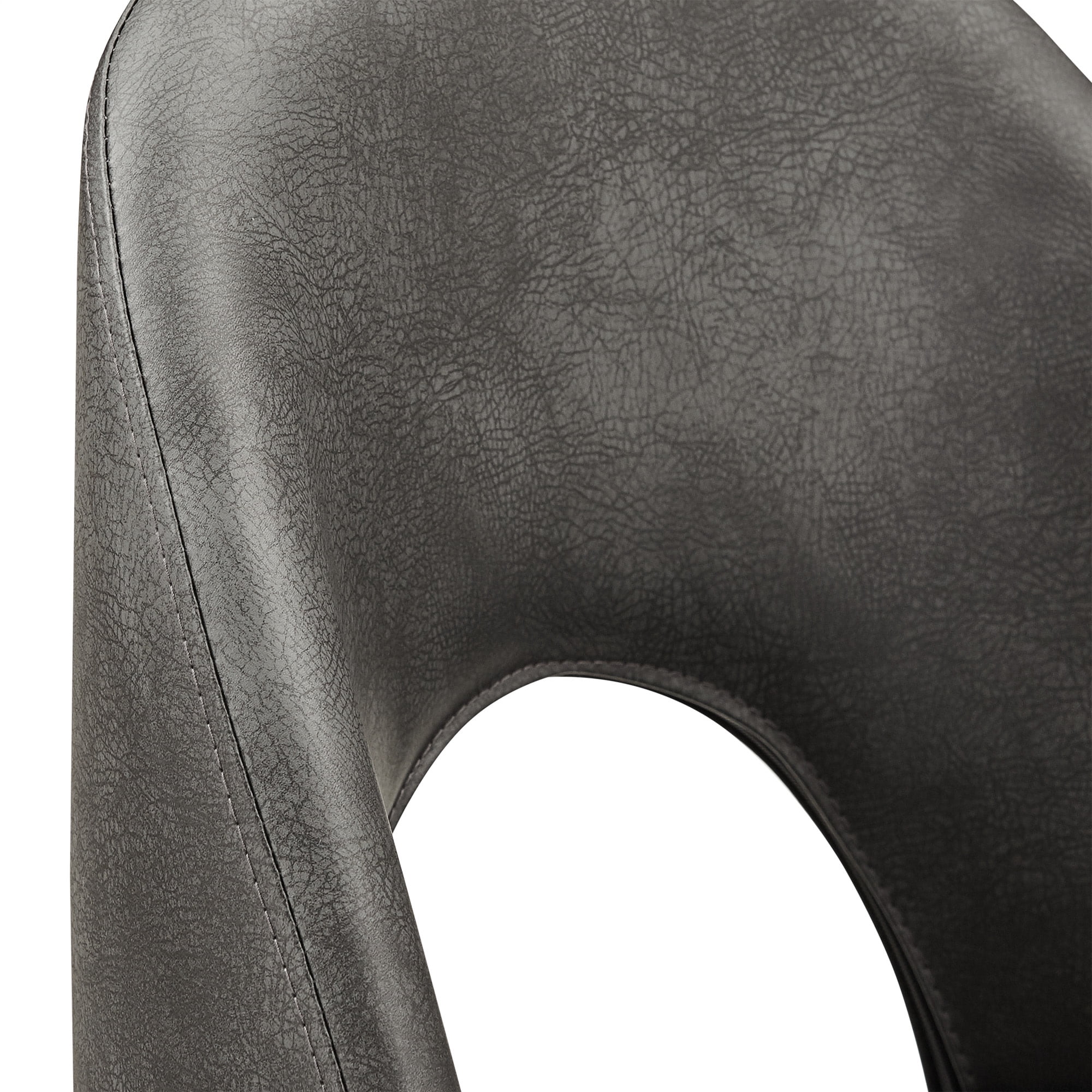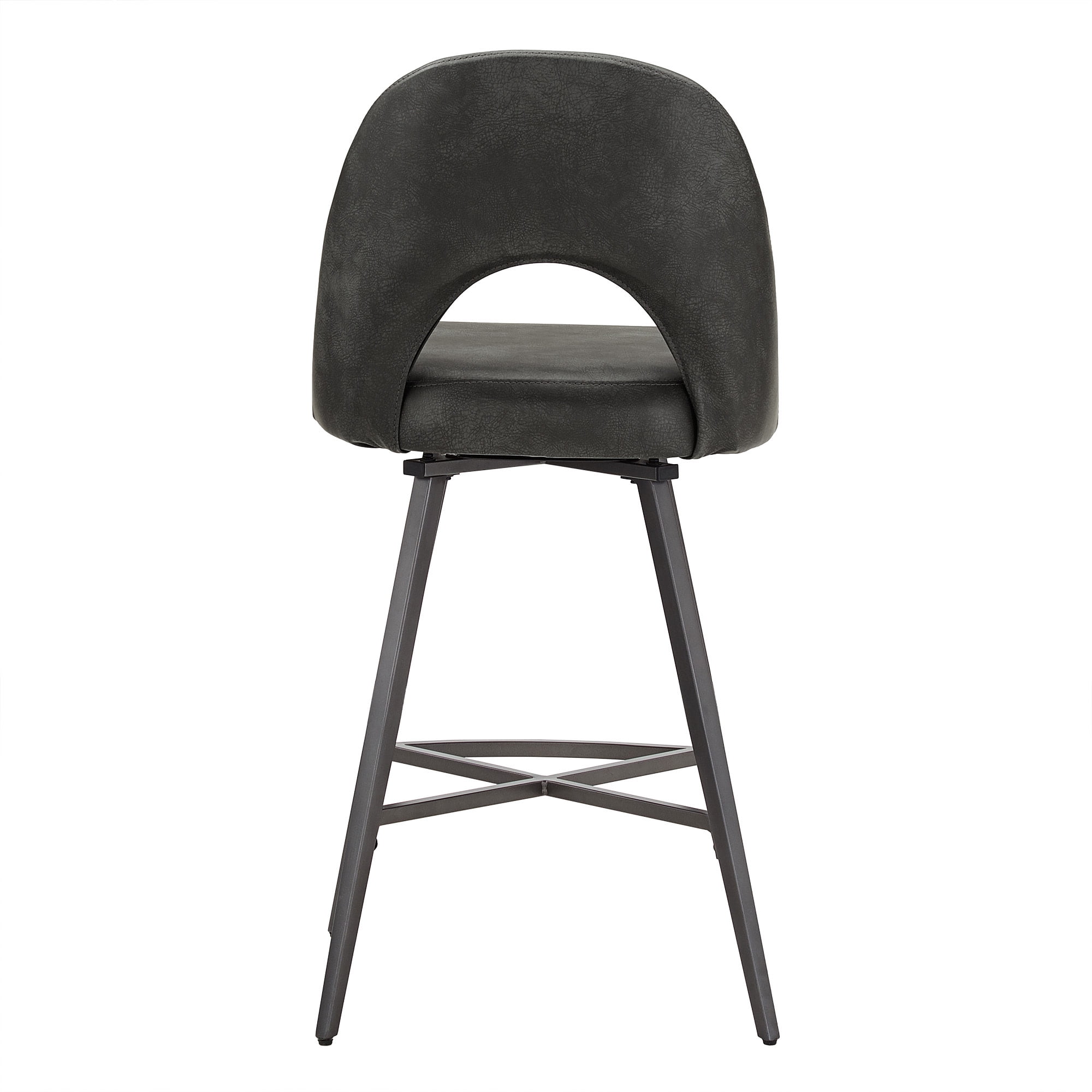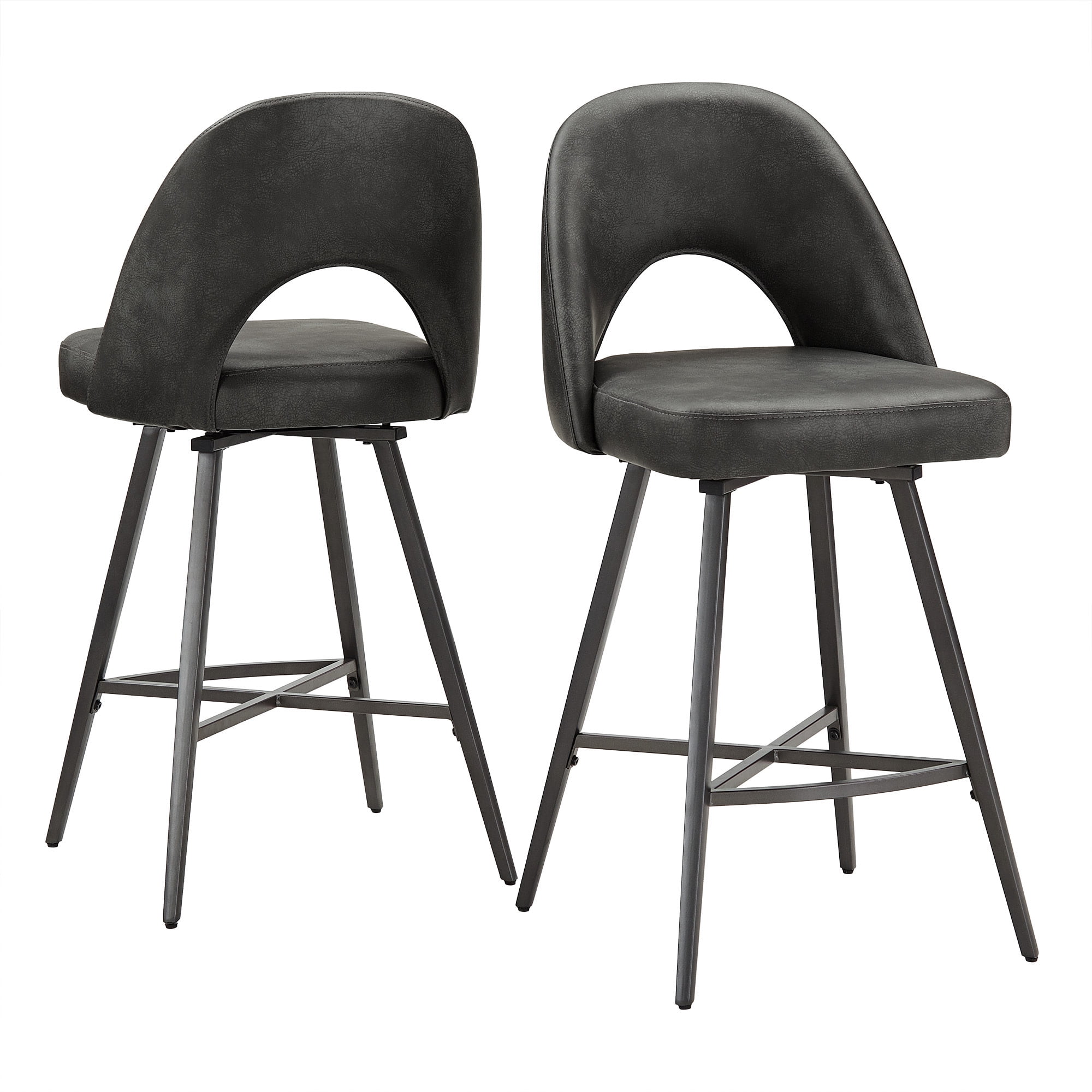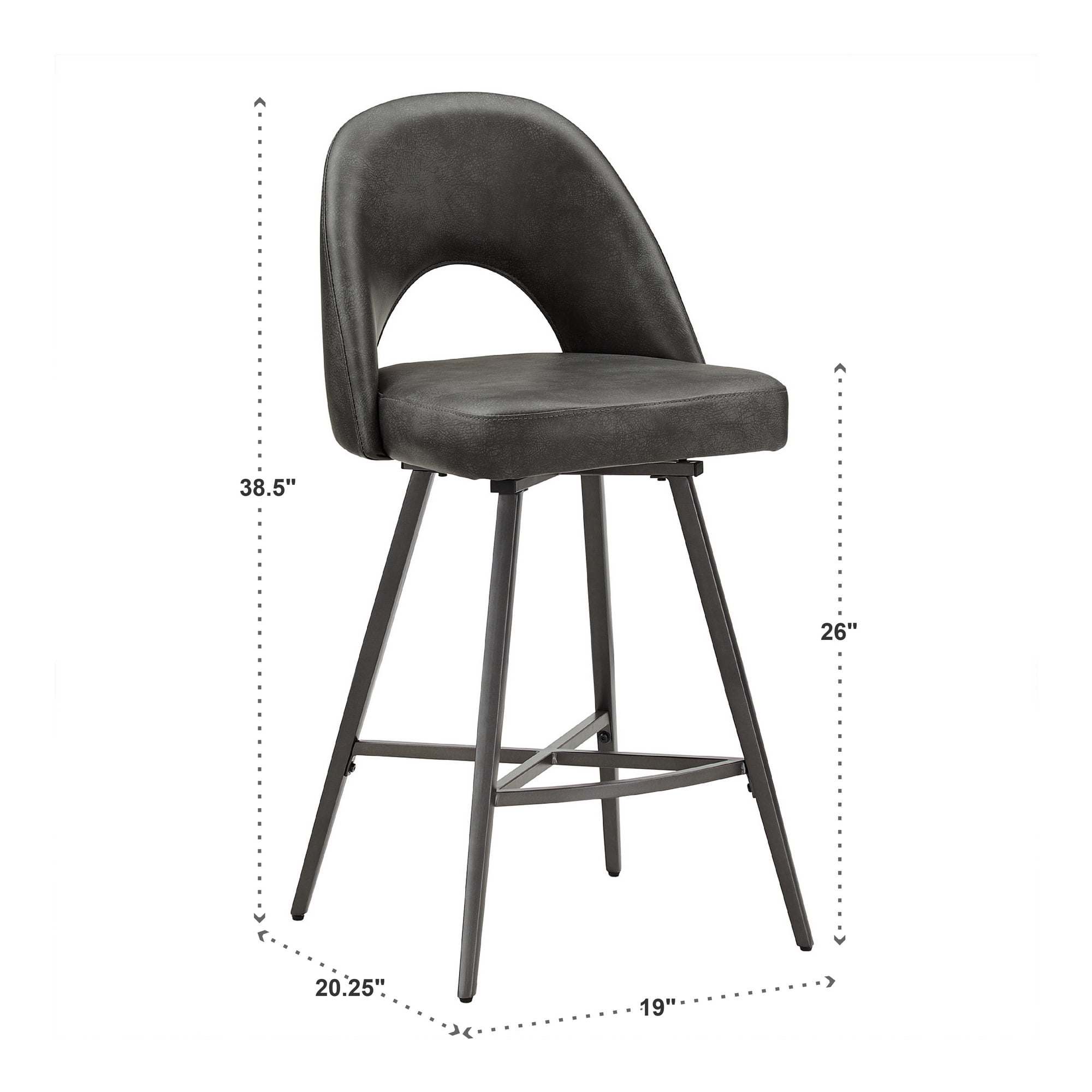 Set includes two (2) swivel stools Swivel feature for easy maneuverability Choice of soft fabric upholstery or PU leather Thin, black finish legs Half-circle cutout on chair backs for retro style Crafted with metal, MDF, foam, and fabric or PU leather Counter height stool overall dimensions: 19 in. width x 20.25 in. depth x 38.5 in. height Bar height stool overall dimensions: 19 in. width x 20.25 in. depth x 42.5 in. height Counter height stool seat height: 30 in. Bar height stool seat height: 26 in.