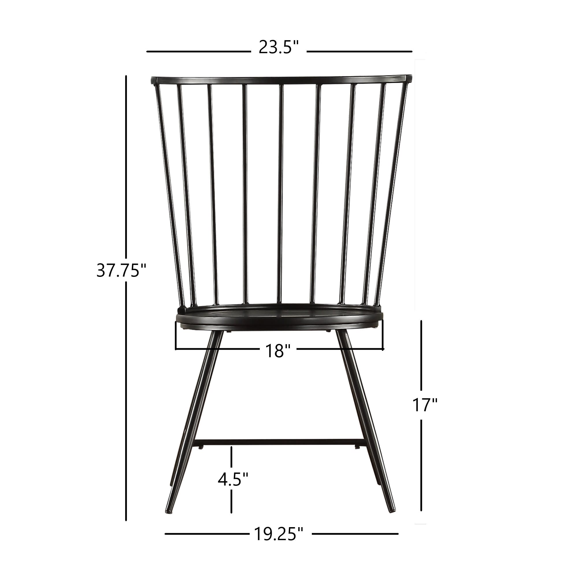 The set includes two (2) indoor chairs Overall dimensions: 21.5 in. width x 22.5 in. depth x 39 in. height Seat dimensions: 18 in. depth x 17 in. height Back height: 22 in. Windsor seat back style Mid-back MDF seat Metal back and legs High gloss black finish Built with MDF and metal Ships in one (1) box Assembly required