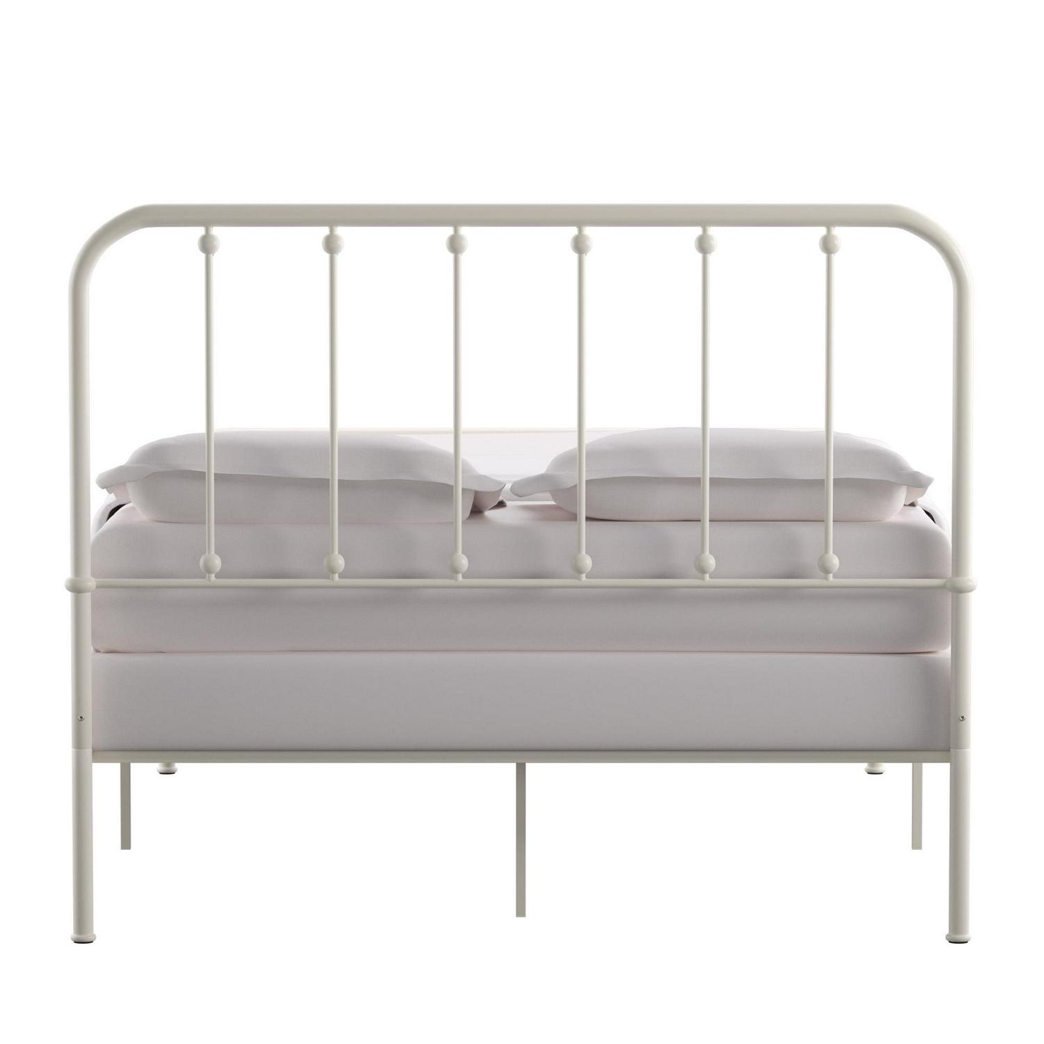 Classic and simple, the design of this Weston Home Full White Metal platform bed will have you recalling styles from years ago. The pointed spindle detail of the head and footboard provide the bed with an open, airy feel, while the bold powder-coated metal frame ensures quality and stability. Place this adult bed in any room in your home for a traditional aesthetic. The Montgomery Bed is shipped in one (1) box and does require a box spring.