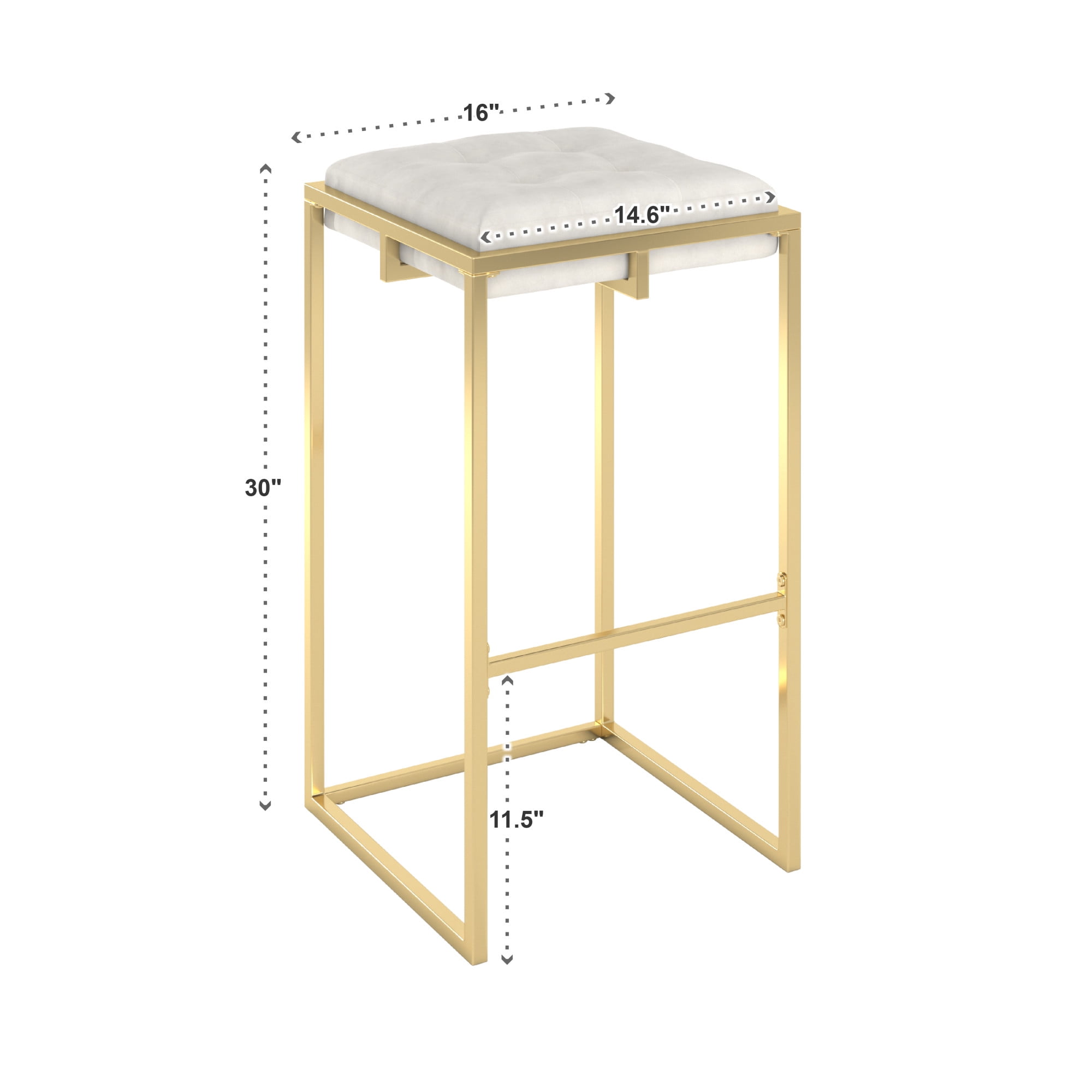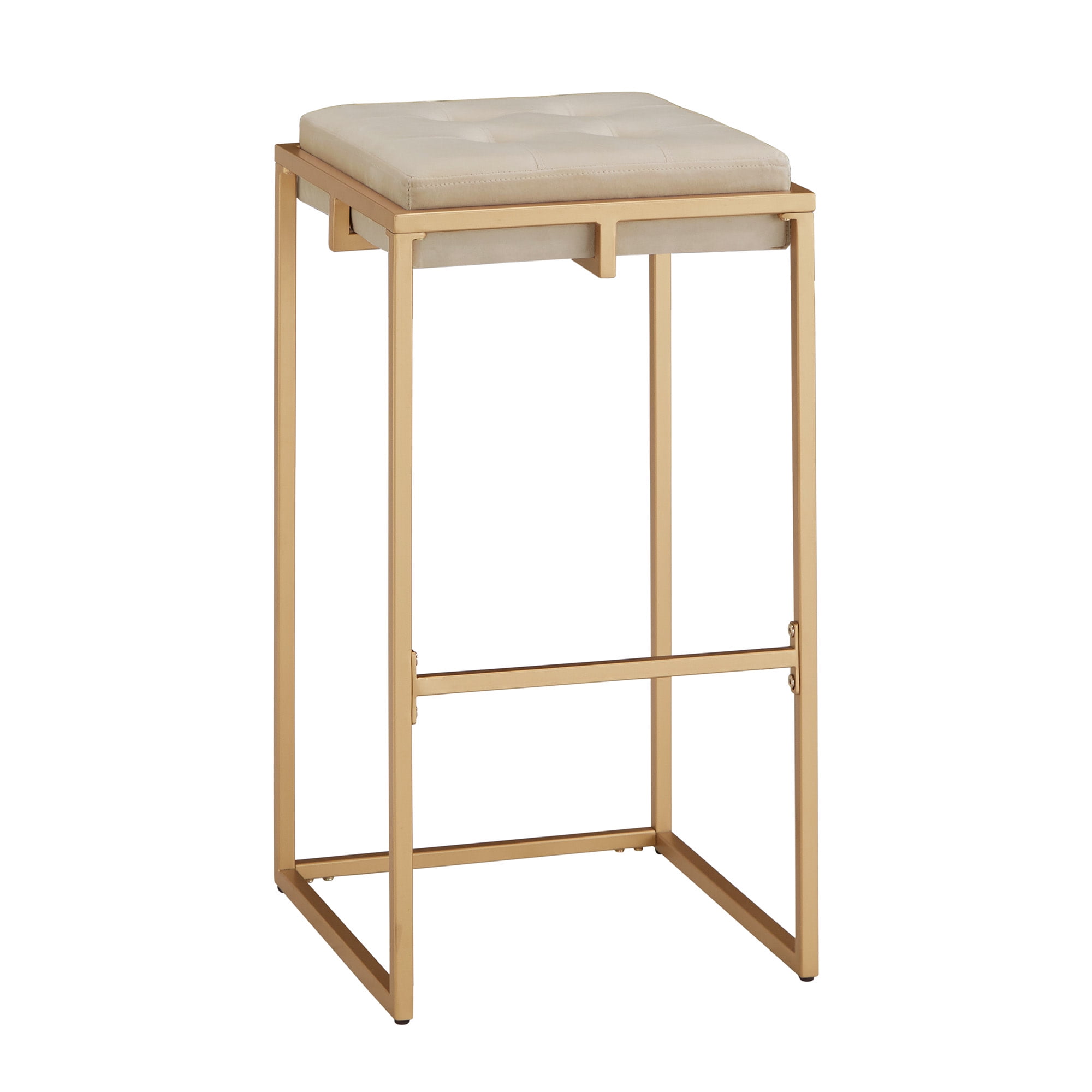 Features Gold-finished metal base Beige velvet upholstery Built with MDF, metal, velvet, and foam Backless style Built-in footrests for added comfort Bar height overall dimensions: 16 in. width x 16 in. depth x 30 in. height Button-tufted seats Ships in one (1) box Assembly required