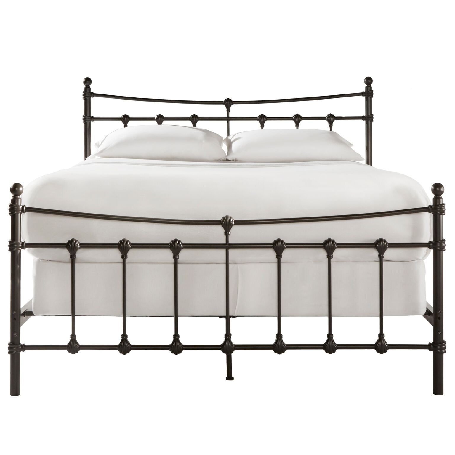 The Weston Home Ossett Shell Motif Metal Bed with Antique Brown finish is perfect for that antique farmhouse feels in your bedroom. Its low-profile design is supported by a solid steel frame, featuring a traditional metal shell and knot motif between classical ball-topped posts. The beautiful antique brown finish of the frame emphasizes the natural metalwork and design. Dress with favorite linens, quilts, and accent pieces to create custom comfort in your bedroom or guest room. Several standard-size options are offered to suit your needs.