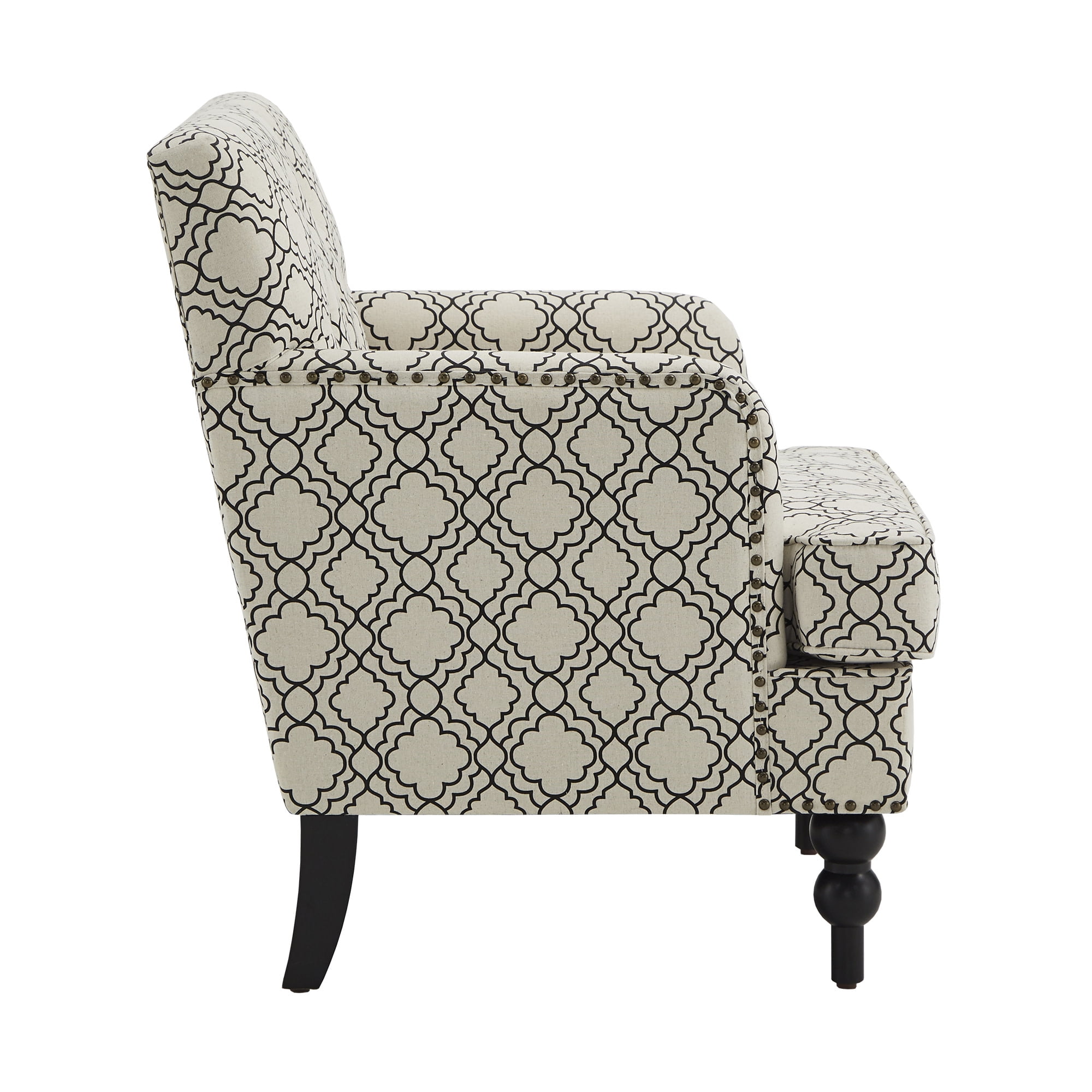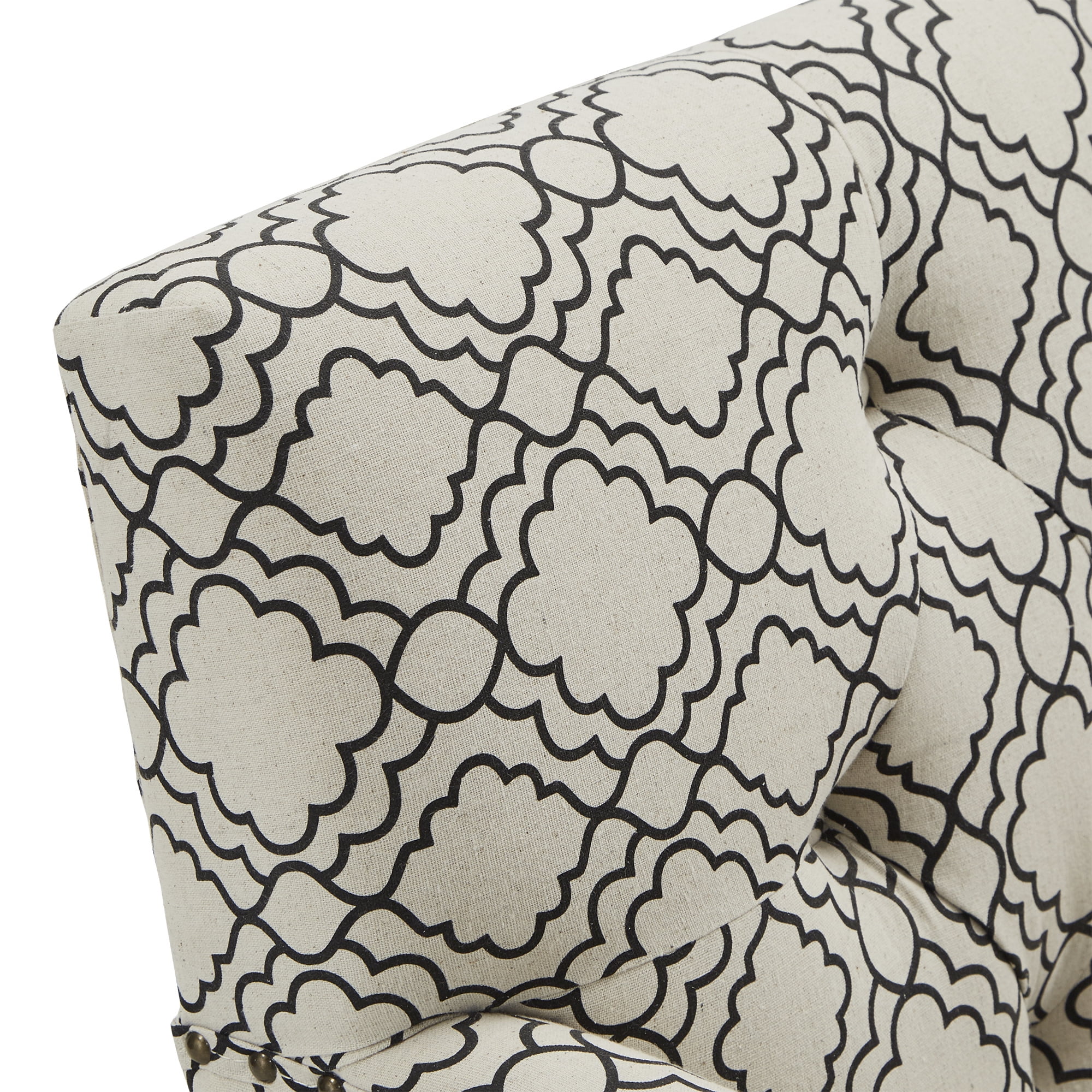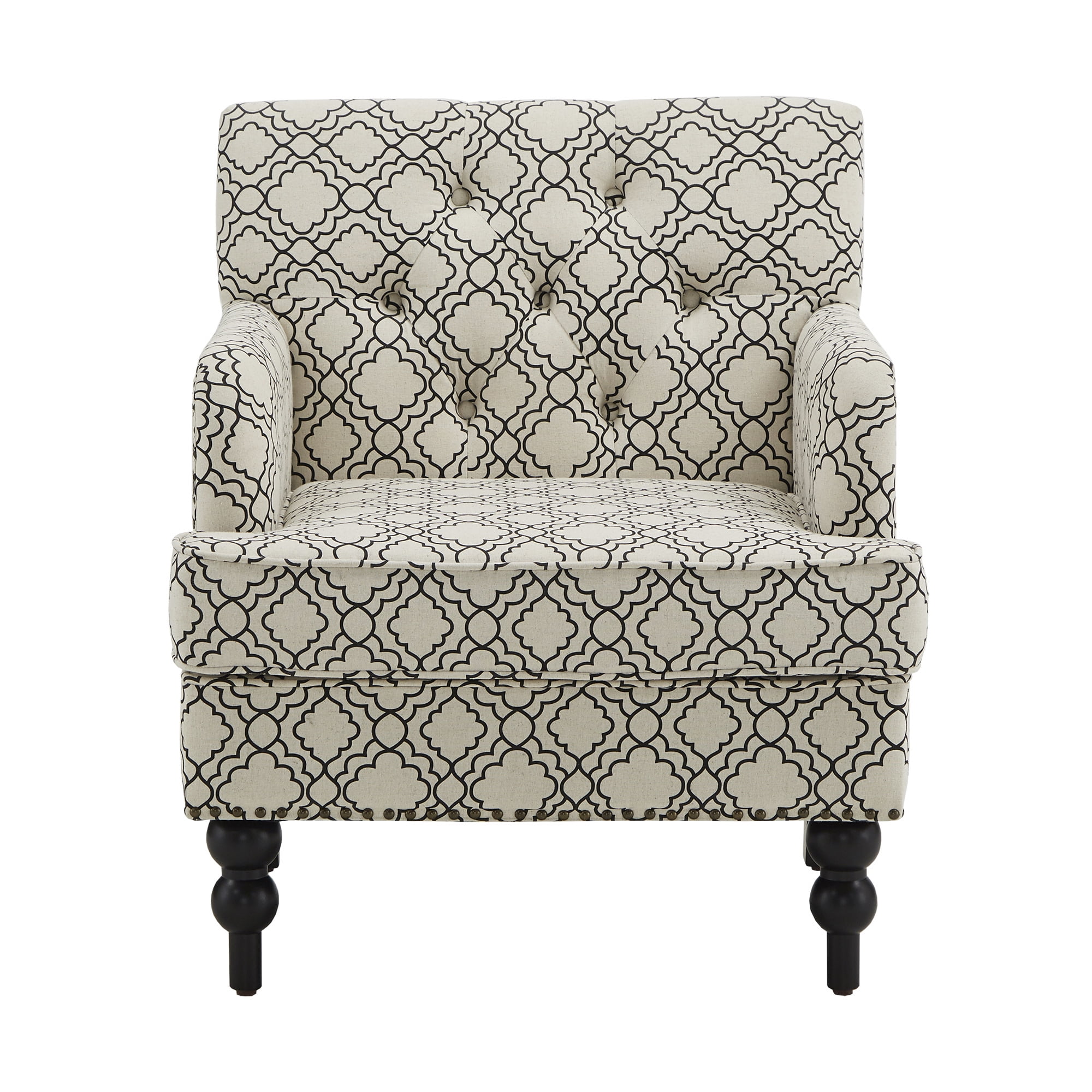 Overall dimensions: 28 in. width x 29.5 in. depth x 33.75 in. height Seat dimensions: 21.75 in. width x 21.5 in. depth x 25 in. height Cushion thickness: 5 in. Includes one (1) club chair Soft fabric Moroccan pattern upholstery Plush button tufting Delicate nailhead trim Black finished feet Loose seat cushion Made with birch, hardwood, plywood, foam, and fabric Ships in one (1) box Assembly required