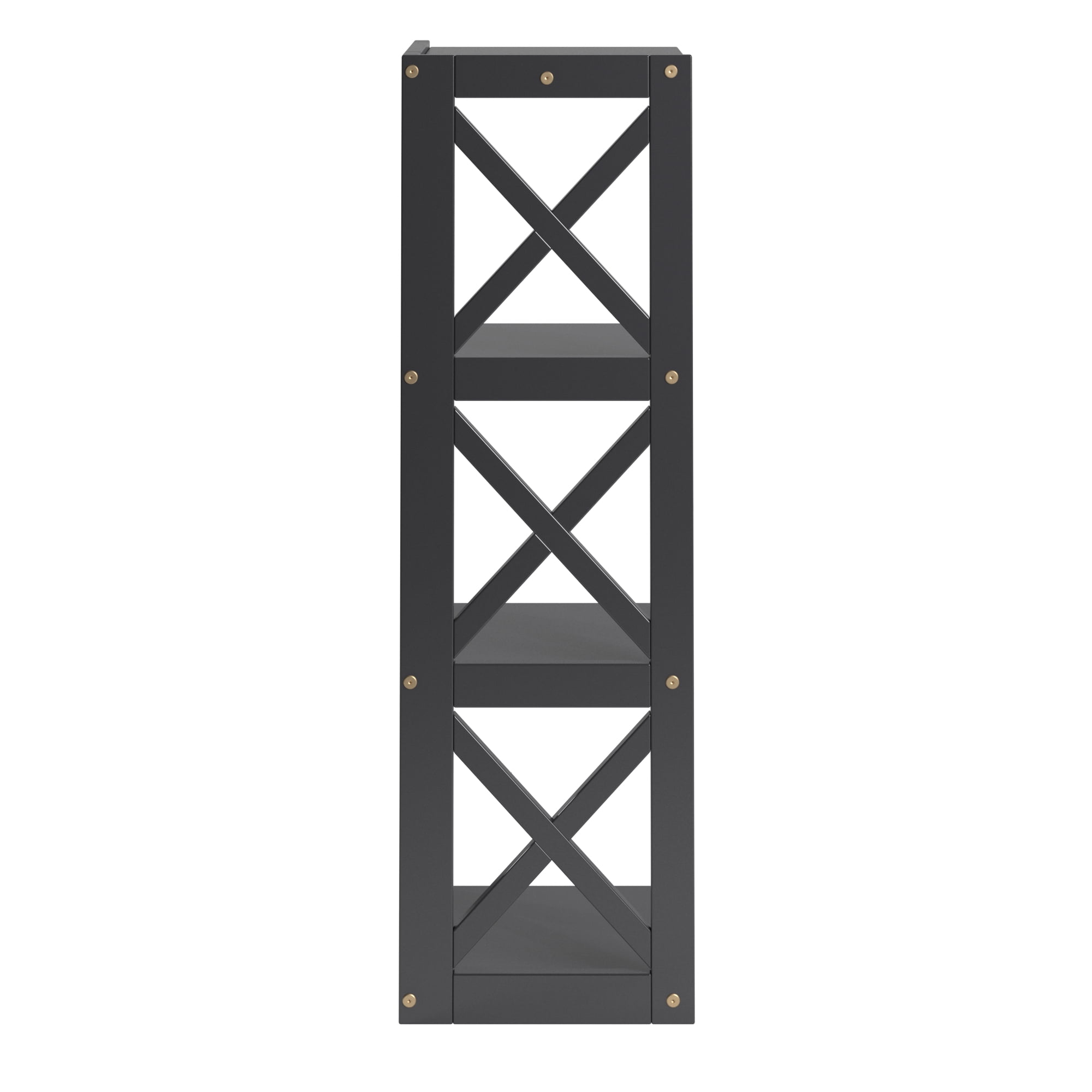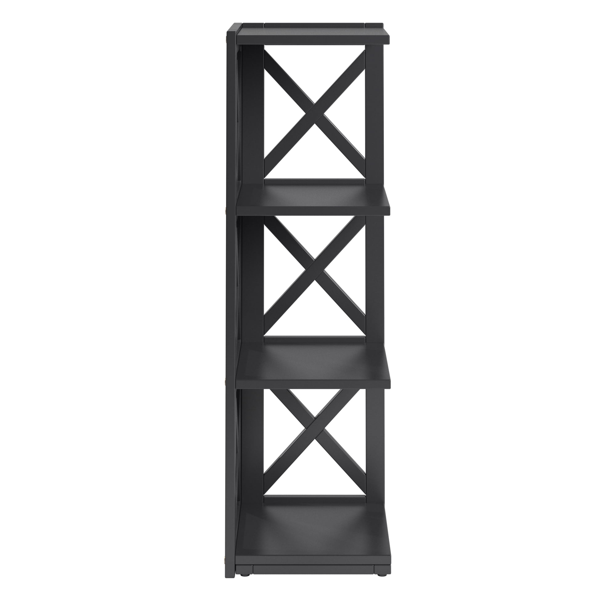 Includes one (1) corner bookcase Overall dimensions: 12.04 in. width x 12.02 in. depth x 38.66 in. height Made with solid wood and rubberwood Sleek frame featuring X-cross pattern Comes with three (3) shelves for ample storage space Assembly required Ships in one (1) box