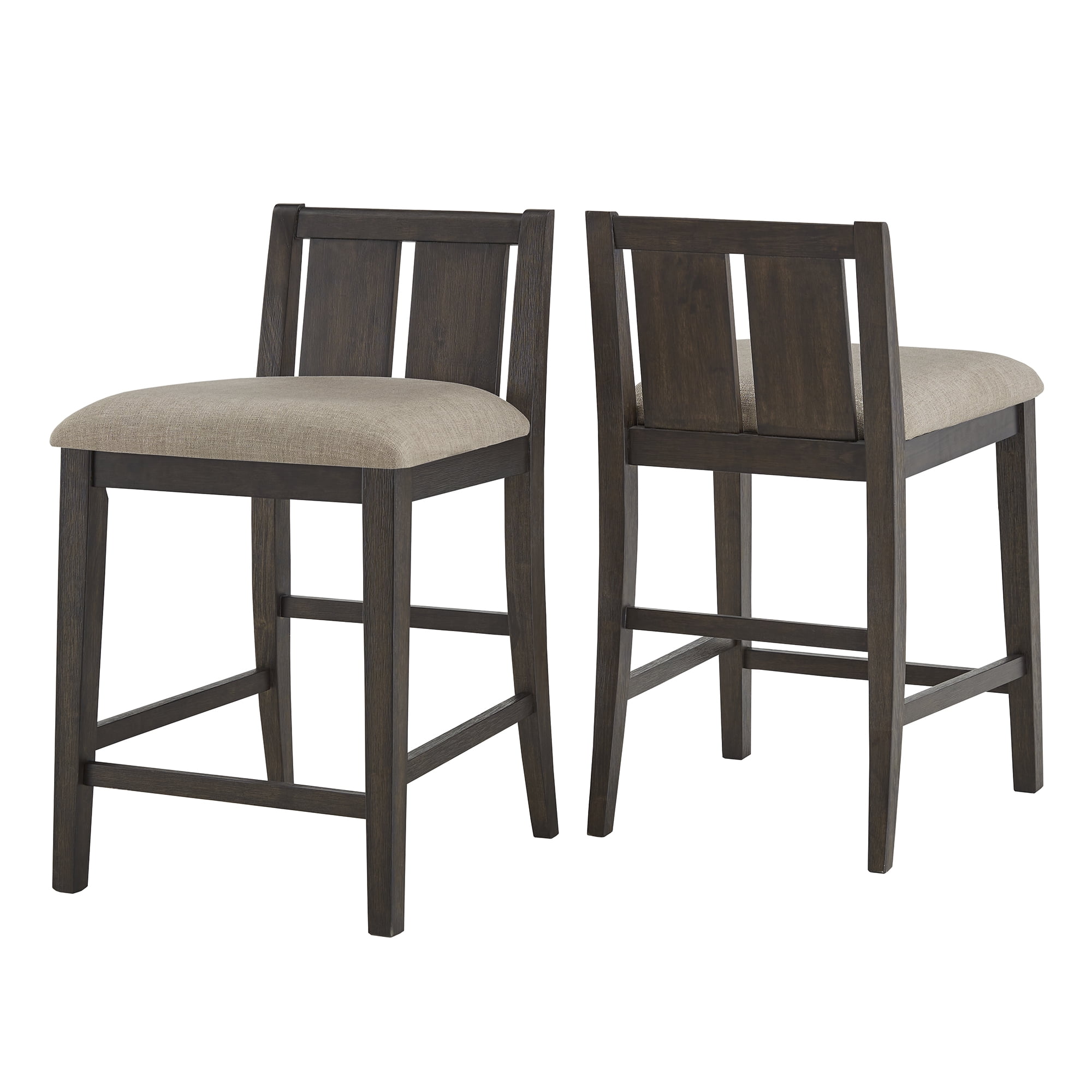 Includes two (2) counter height chairs Low backrest Fabric upholstered seats Multiple finish options available Made with MDF, Mindy veneer, rubber wood, foam, and fabric Overall dimensions: 20 in. x 21.25 in. x 34 in. Seat dimensions: 20 in. width x 18 in. depth x 25 in. height Assembly required Ships in one (1) box