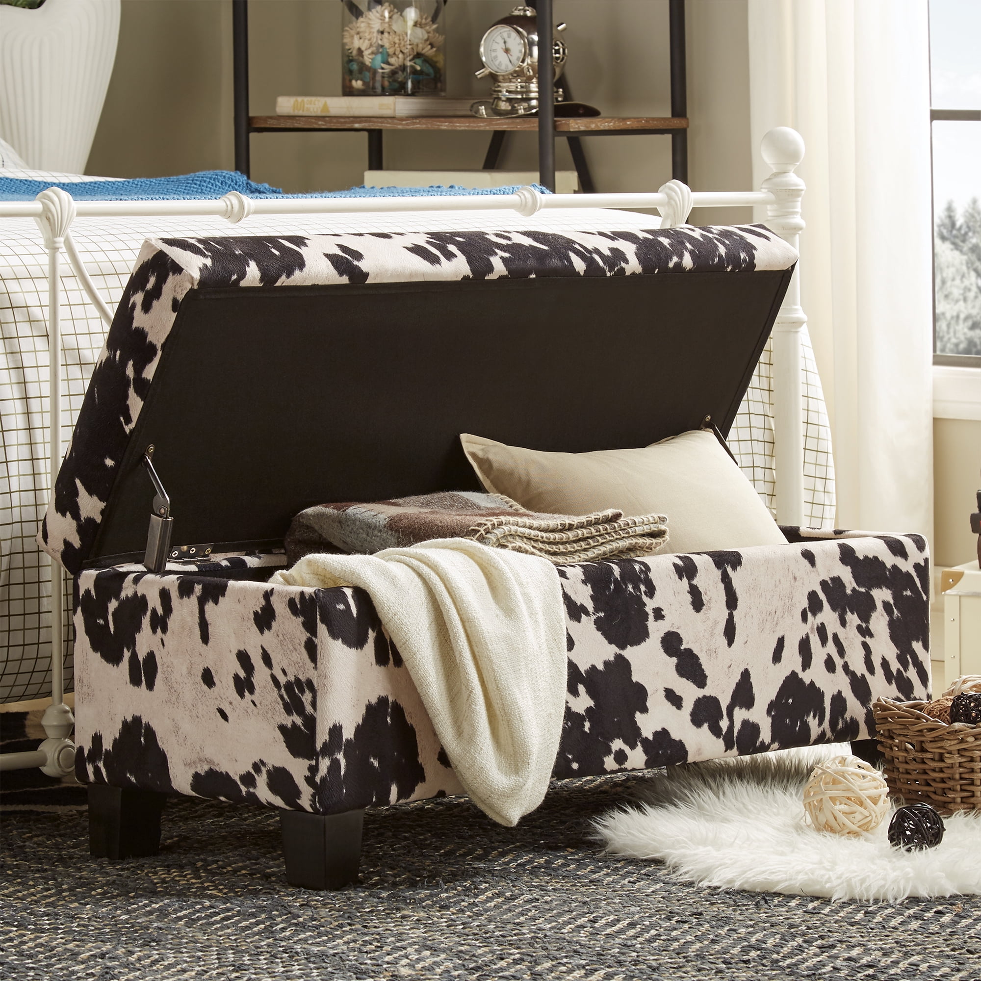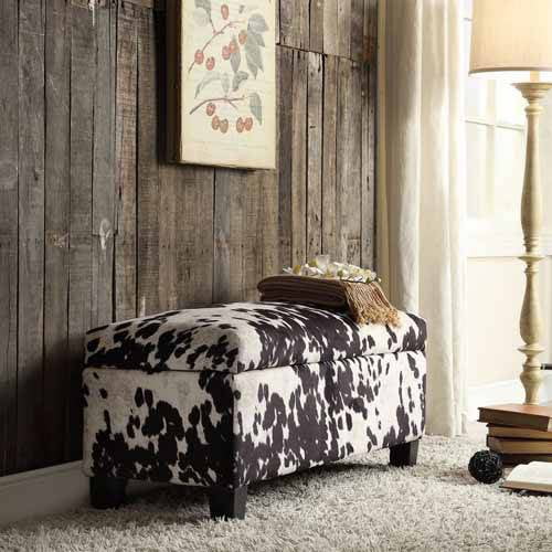 Durable hardwood construction Foam-padded lid and generous storage Upholstered in luxuriously plush cow hide fabric Rustic/contemporary style Dimensions: 43W x 17D x 18H inches