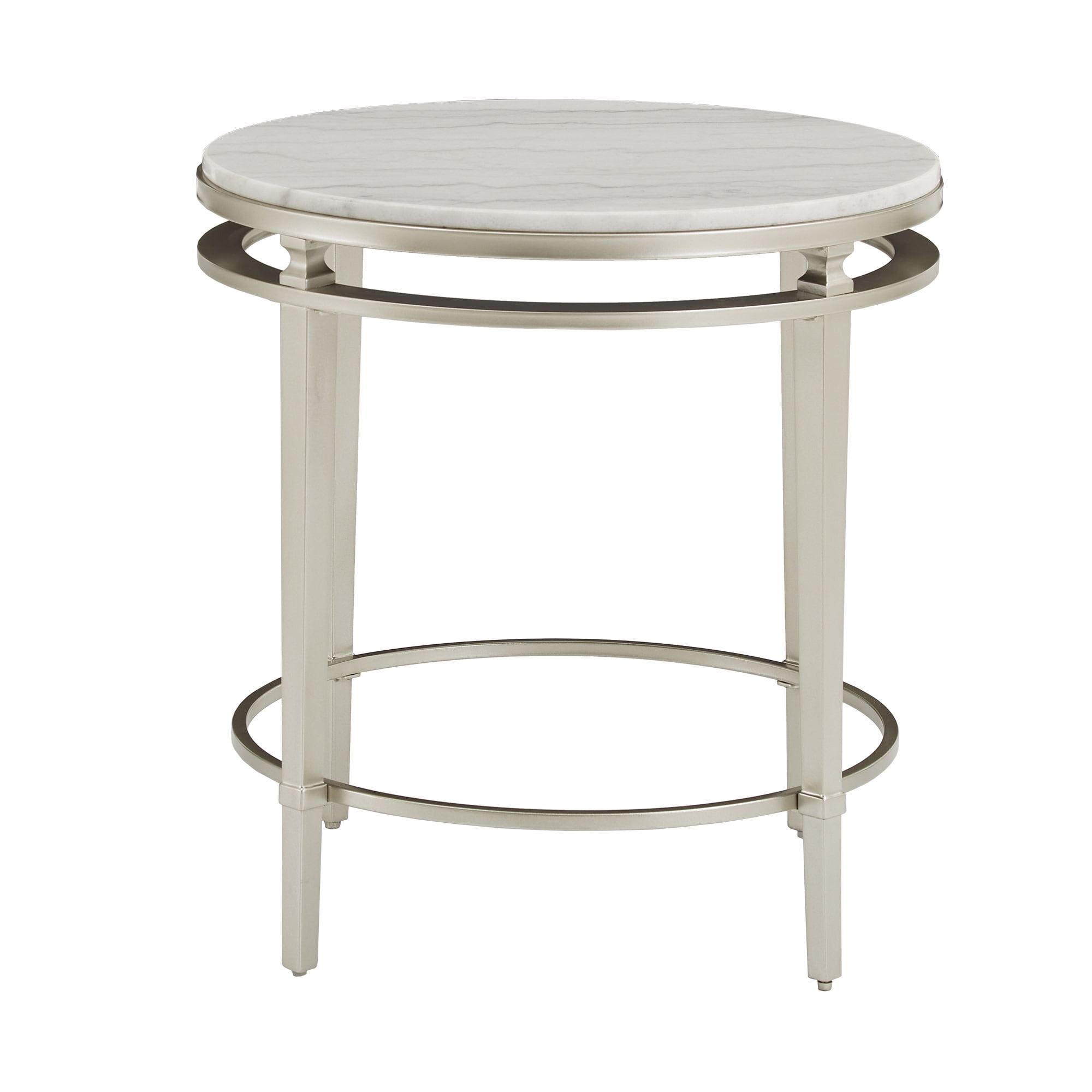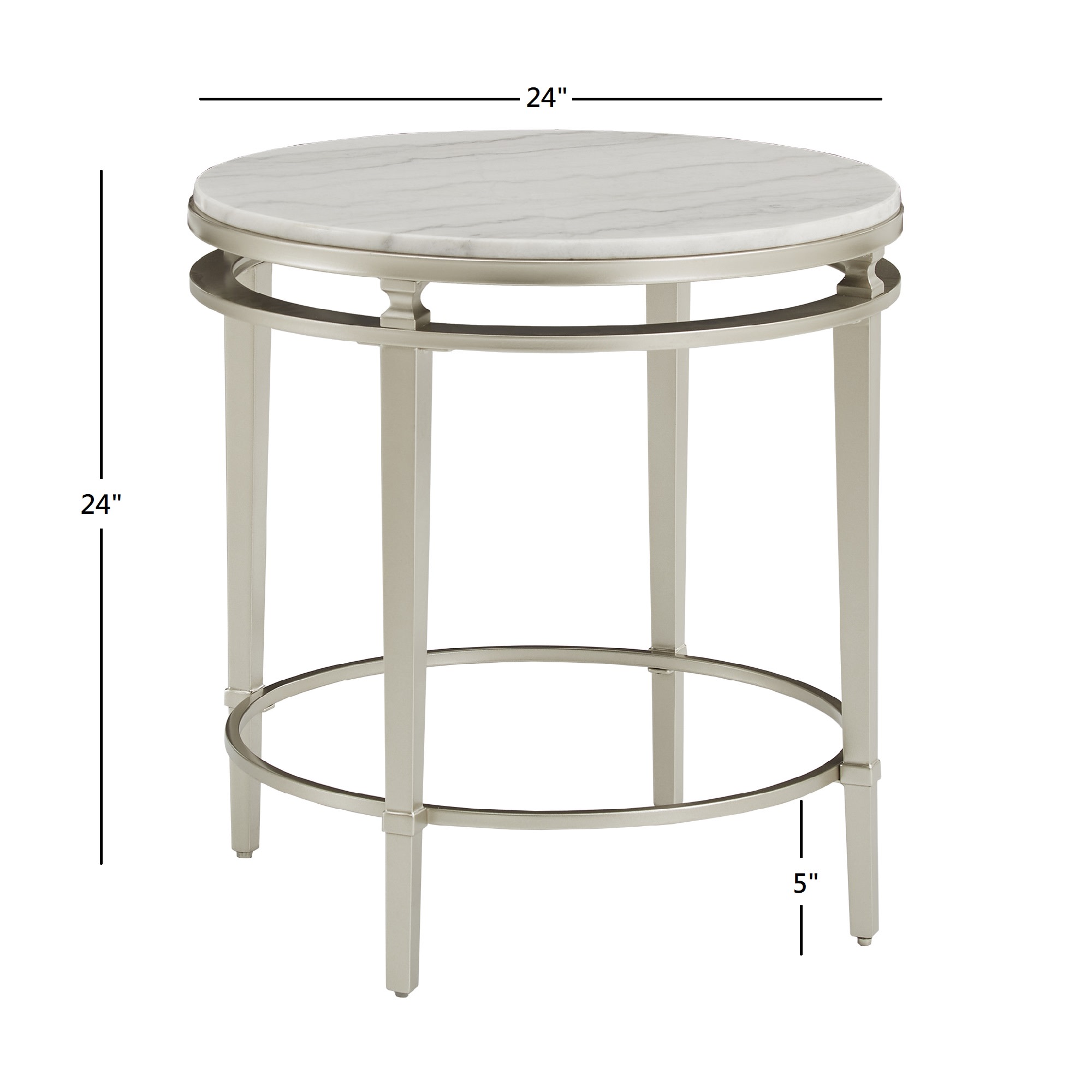 Set includes one (1) end table Dimensions: 24 in. diameter x 24 in. height Champagne silver metal frame Marble table top Made with metal tube, MDF, and marble Assembly required Ships in one (1) box