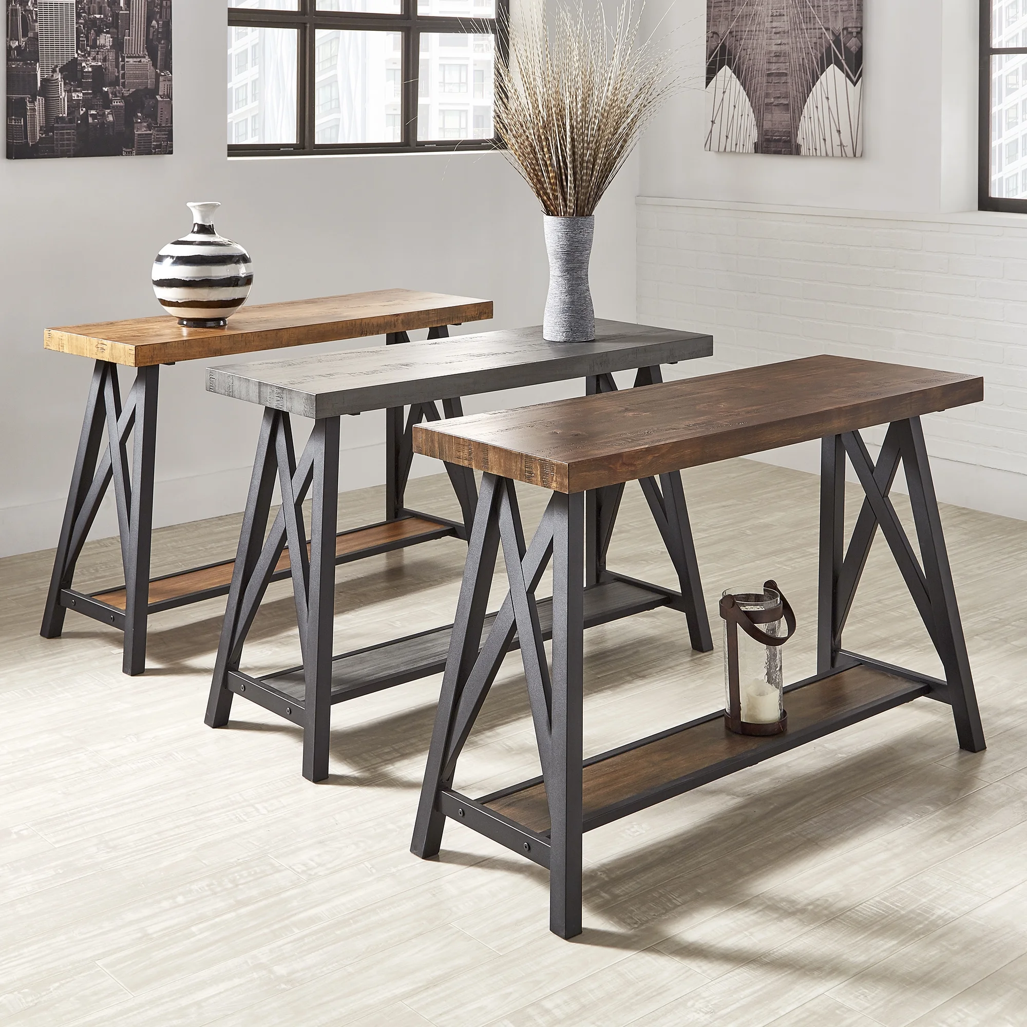Display rustic, yet modern charm in your living room with the Weston Home Westyn Console Table. With ample surface to double as a Media Console, this table is a perfect mix of industrial and natural elements. A weathered wood table top complements the sharp features of the metal X-cross base to display a unique, contemporary look for your home. The open bottom shelf offers just enough space to display treasured items, while multiple wood finishes make coordinating this table with your existing color scheme a breeze. Pair with the Westyn Coffee Table and Westyn End Table to complete the look.