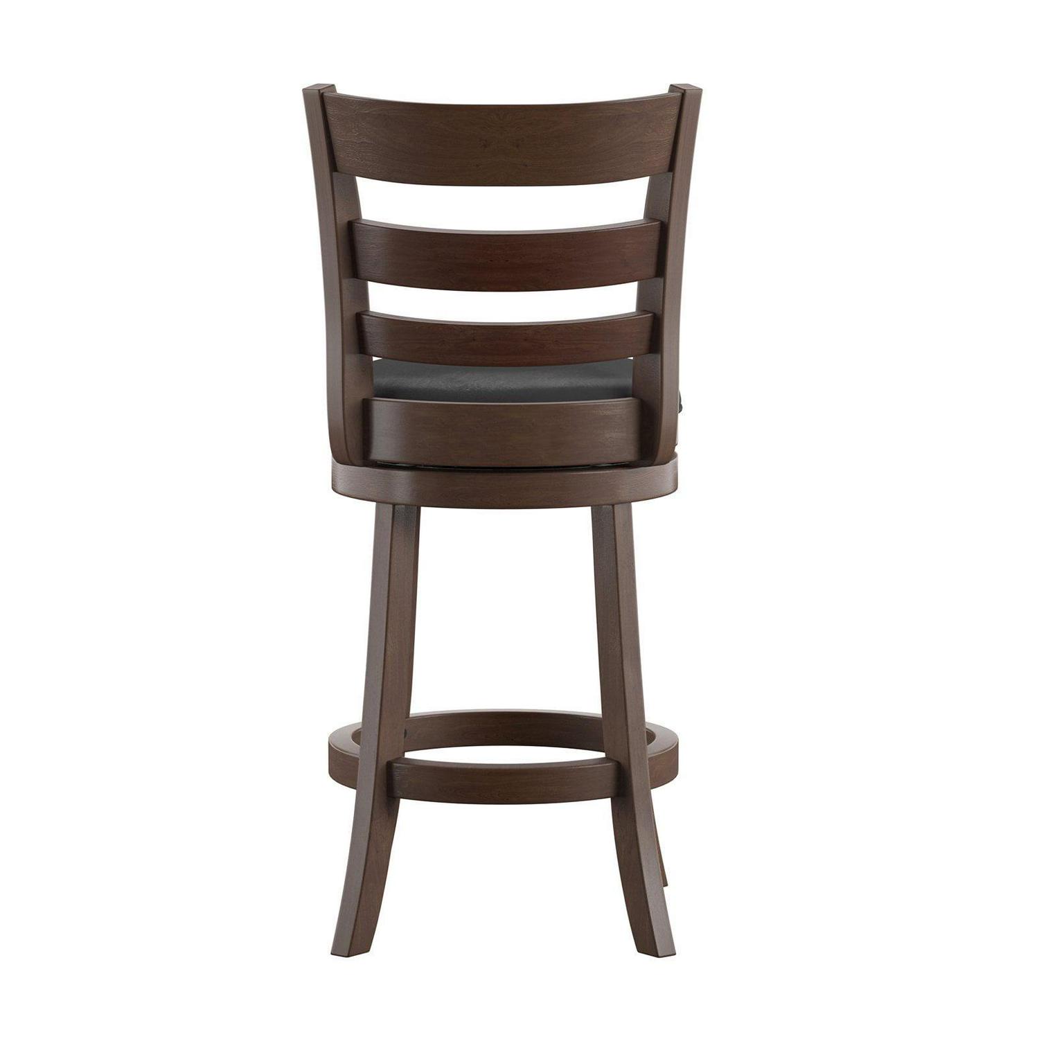 A stylish counterpart for your countertop, the Woodhaven Hill Ladder-Back Swivel Counter Stool takes your kitchen from mundane to marvelous. The sturdy rubberwood frame is finished in a versatile dark cherry, while the ladder-style back and curved legs add a fashionable yet down-to-earth aesthetic. The seat is upholstered in comfy black bi-cast leather, and the seat s swivel function puts a fresh spin on things. Some simple assembly is required. Please note: This item is not intended for commercial use. Warranty applies to residential use only.