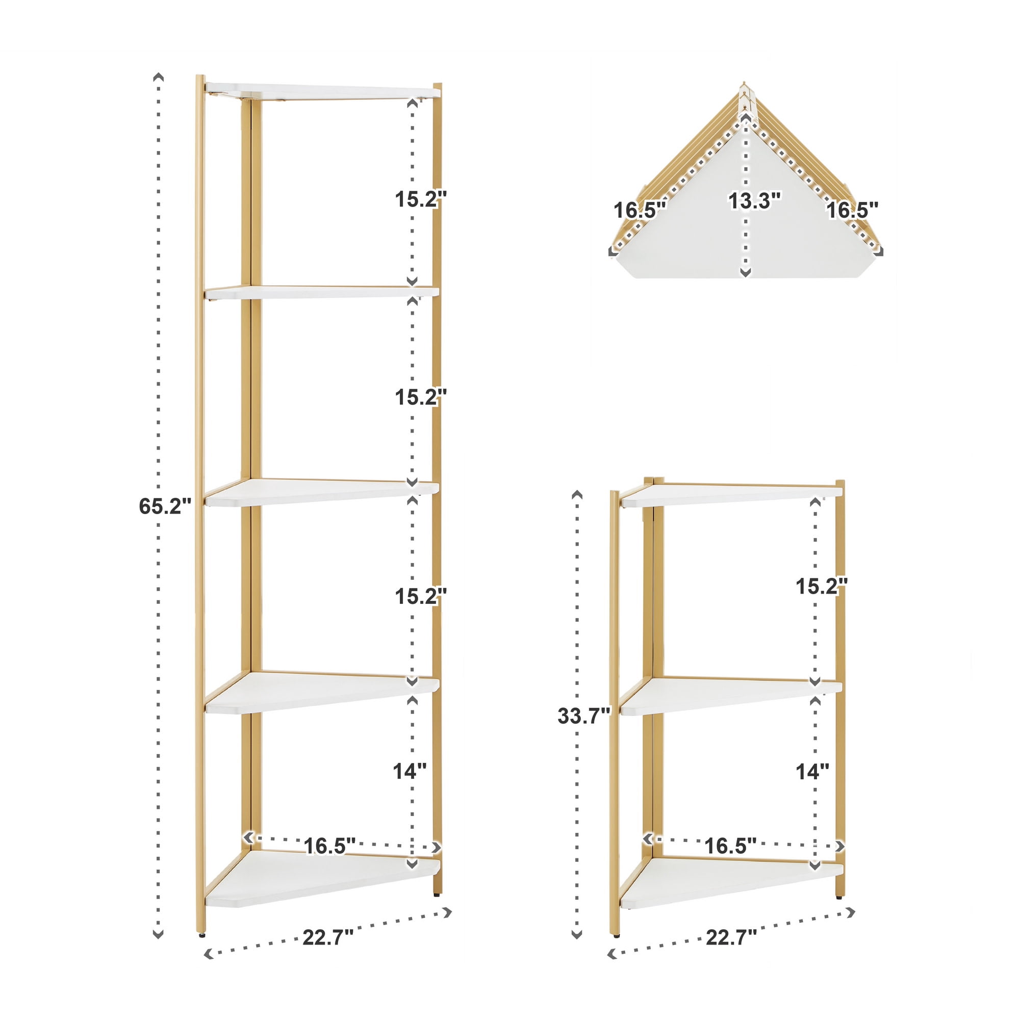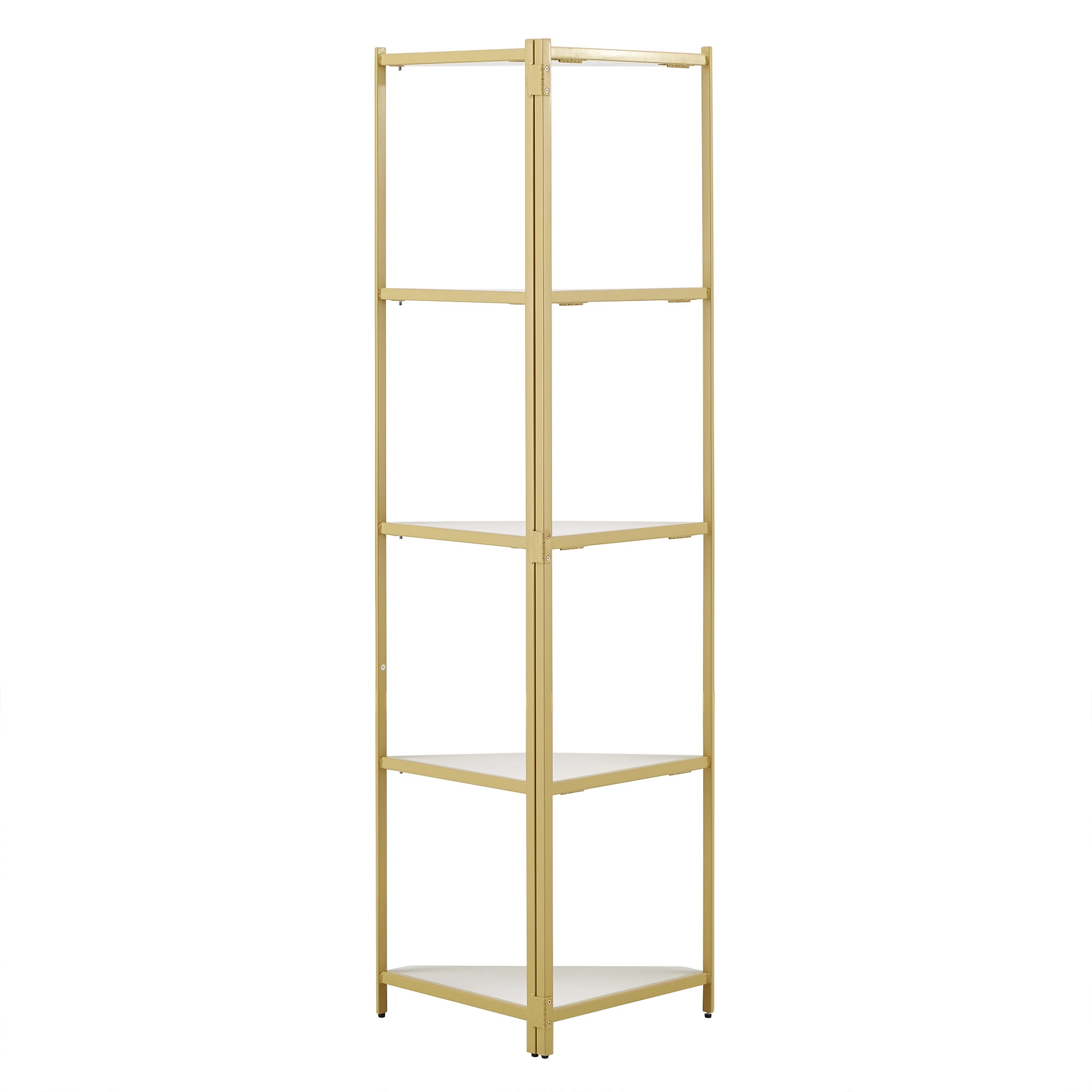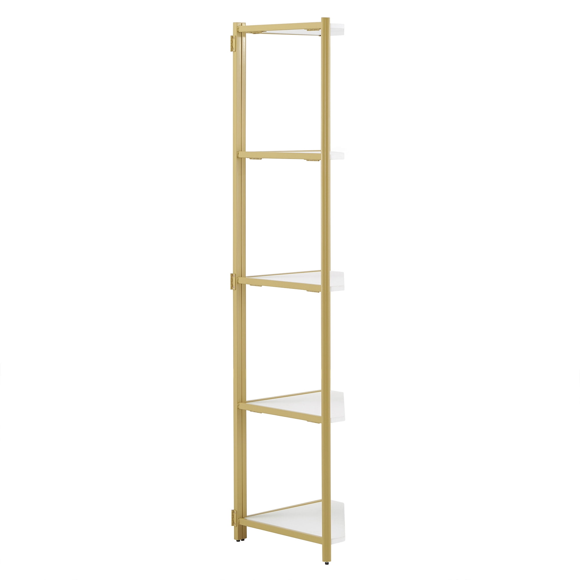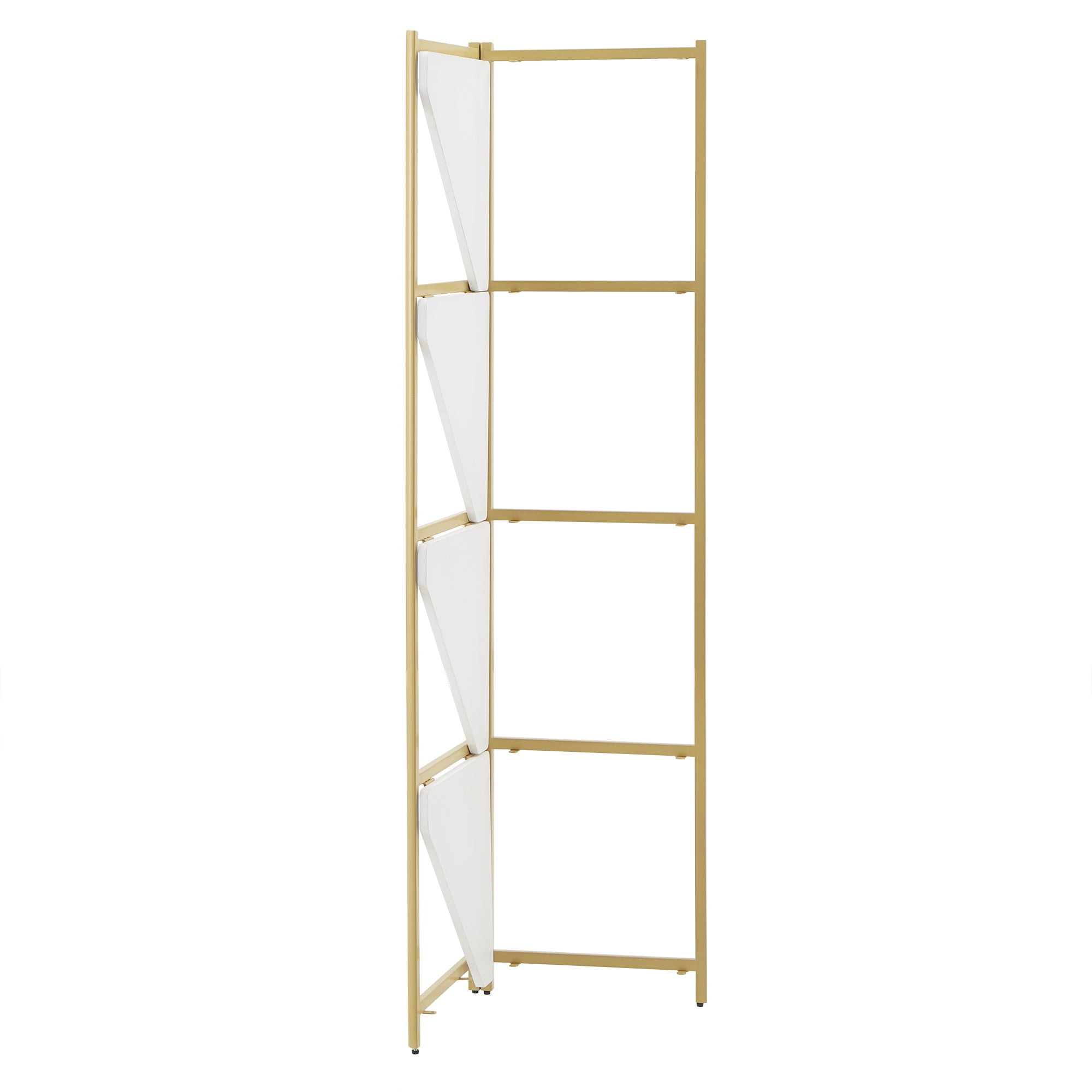 Includes one (1) folding bookcase Triangular design to easily fit into the nooks and crannies of your home Gold, powder-coated finish on a metal frame Four (4) white-finished shelves Shelf dimensions: 16.5 in. width x 16.5 in. depth x 15.2 in. height Constructed with iron, PVC, and 15 mm MDF board Ships in one (1) box Assembly required