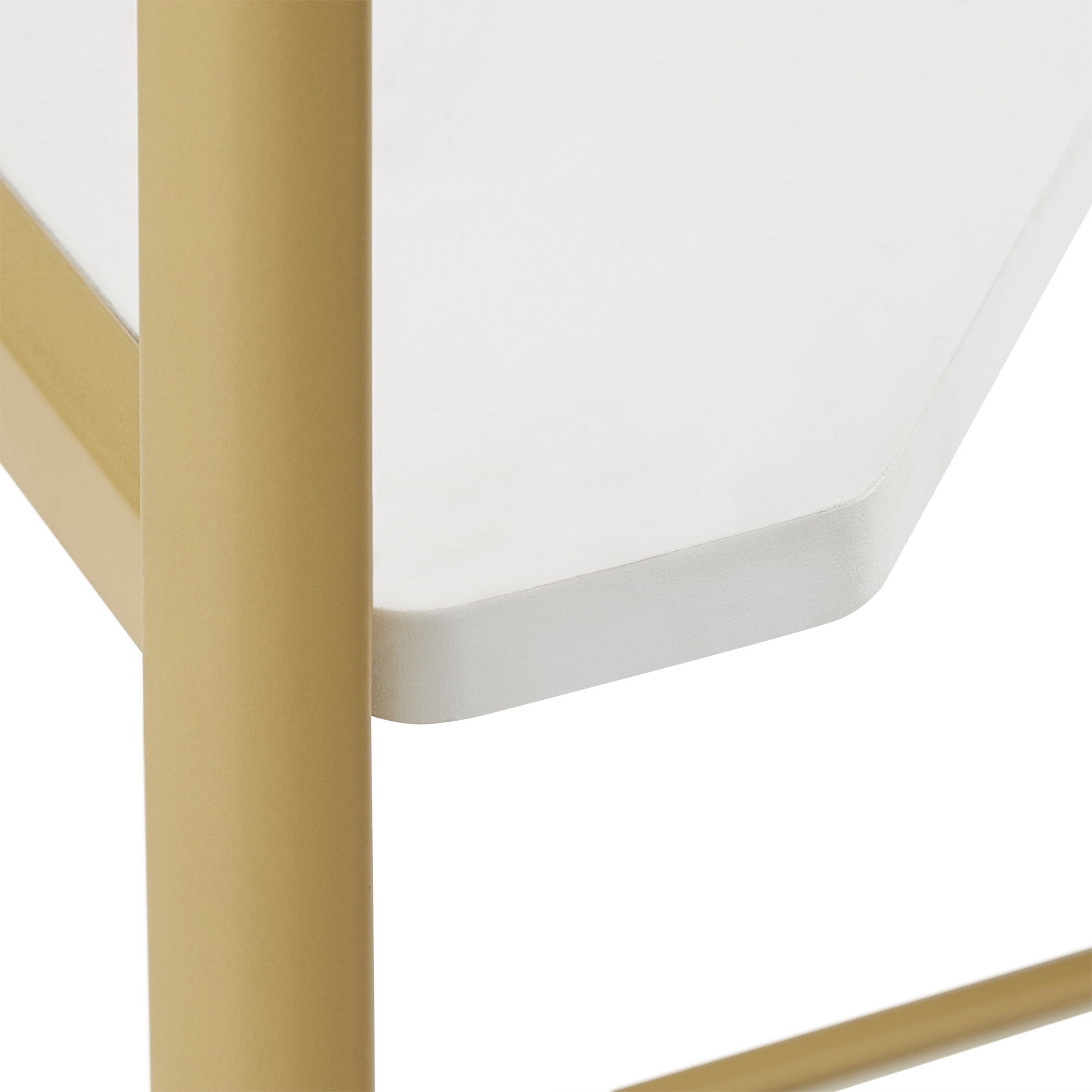 Weston Home: Crisp, clean, and convenient, this Two-Tone Corner Bookcase rounds out any modern ensemble. Minimalist by design, this chic bookcase features a triangular shape to easily fit into any corner of any room in your home. A sturdy, gold-finished metal frame reliably supports the smooth, white-finished shelves. With an open design like this, your treasures and trinkets will be put on full display for all to admire.