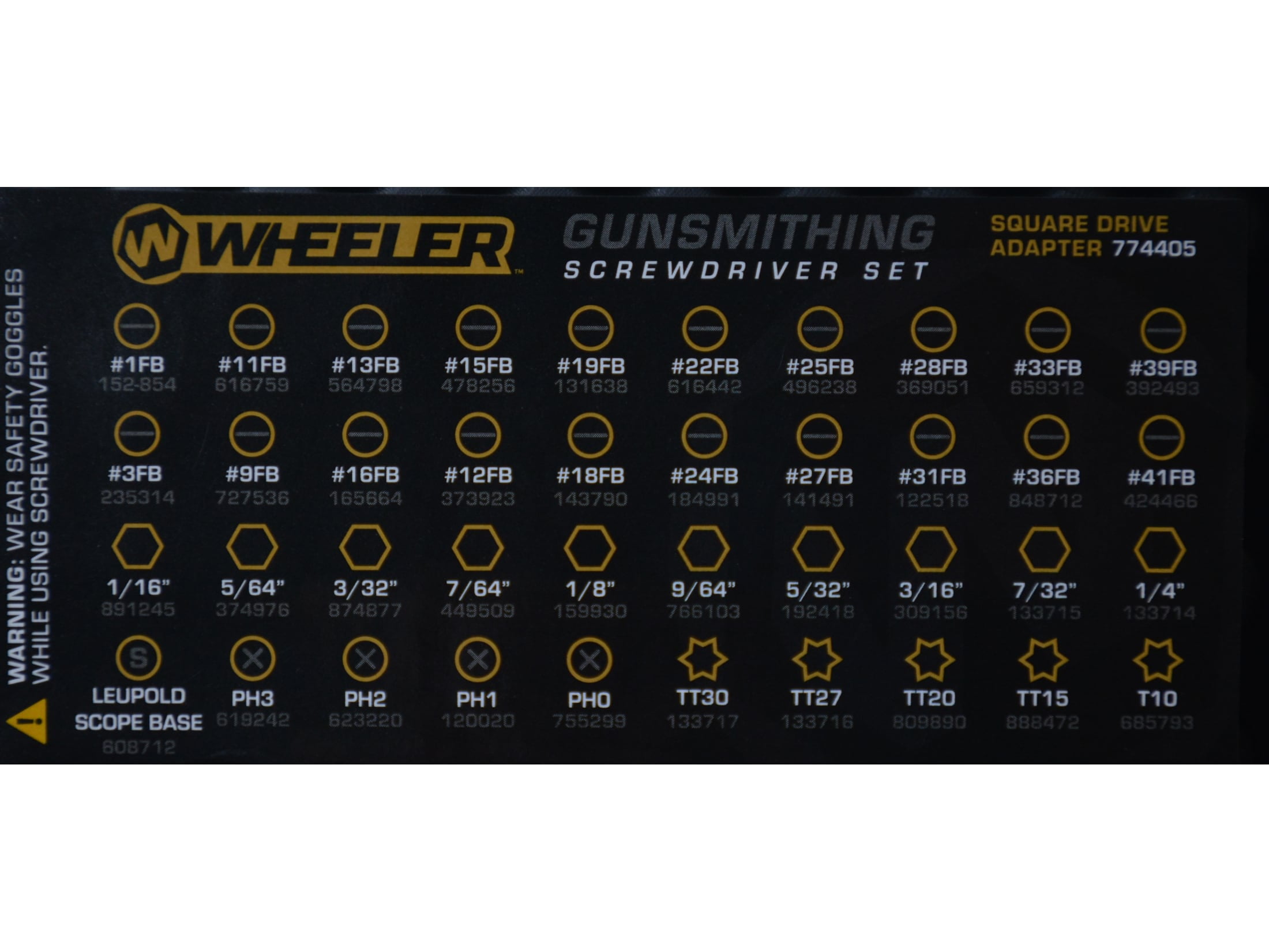 661120546214 WH 954621 Features:Hollow-ground bitsDurable S2 tool steelNo-slip handleMost popular bits for gunsmithingConvenient storage caseMagnetic bit retention in driverWheeler Professional Gunsmith 43 Piece Screwdriver Set Screwdrivers are the most important and most-used gunsmithing tools. Wheelers Professional Gunsmith 43 Piece Screwdriver Set is a kit that belongs on every gunsmiths bench. The well thought-out bit selection will put an end to burred buggered busted up screw slots on any gun that comes your way. The bits make up the heart of any screwdriver set and Wheelers are the finest available. They’re made from S2 tool steel and hardened to 56-58 Rockwell C. The hollow-ground bits are gently curved as it reaches the tip instead of being straight to protect the fit and finish of the screw. The hollow-ground shape spread forces equally along the sides of the screw slot resulting in no damage. The 43 Piece Screwdriver Set features a very comfortable overmolded screwdriver handle to ease all of your work. Never lose a bit with the durable custom box that?s ready for the bench or your range kit.WH 954621 661120546214