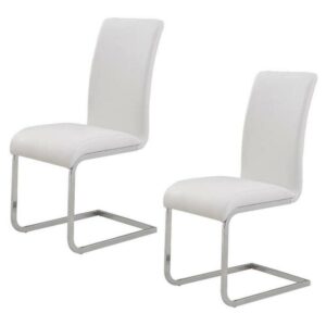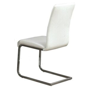 The metal frames of the WHI Faux Leather/Chrome Dining Side Chair – Set of 2 offer a touch of flex for support and comfort. The c-shaped frame of each side chair is finished in chrome. This set showcases two armless chairs that are upholstered on the seats and backs in faux leather material.