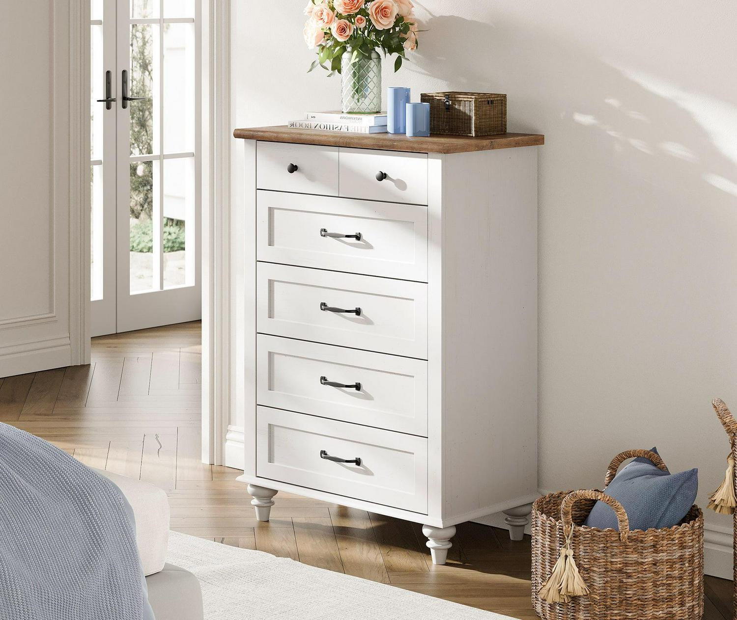 Sufficient 5 Storage Space This white dresser only takes up small space while still provide plenty of storage space. Designed with 5 deep drawers and a wide tabletop provide ample space for sorting and organizing of daily necessities.