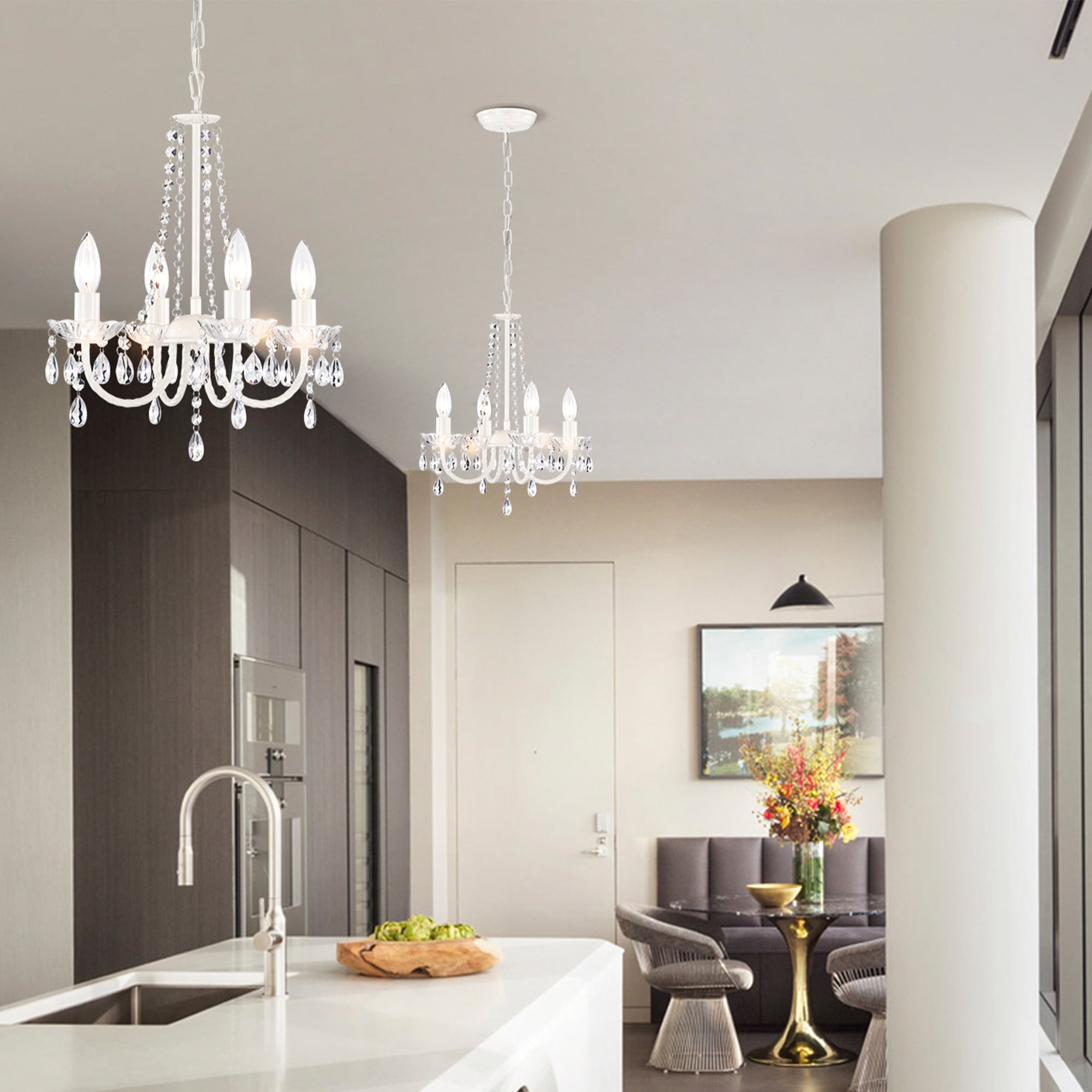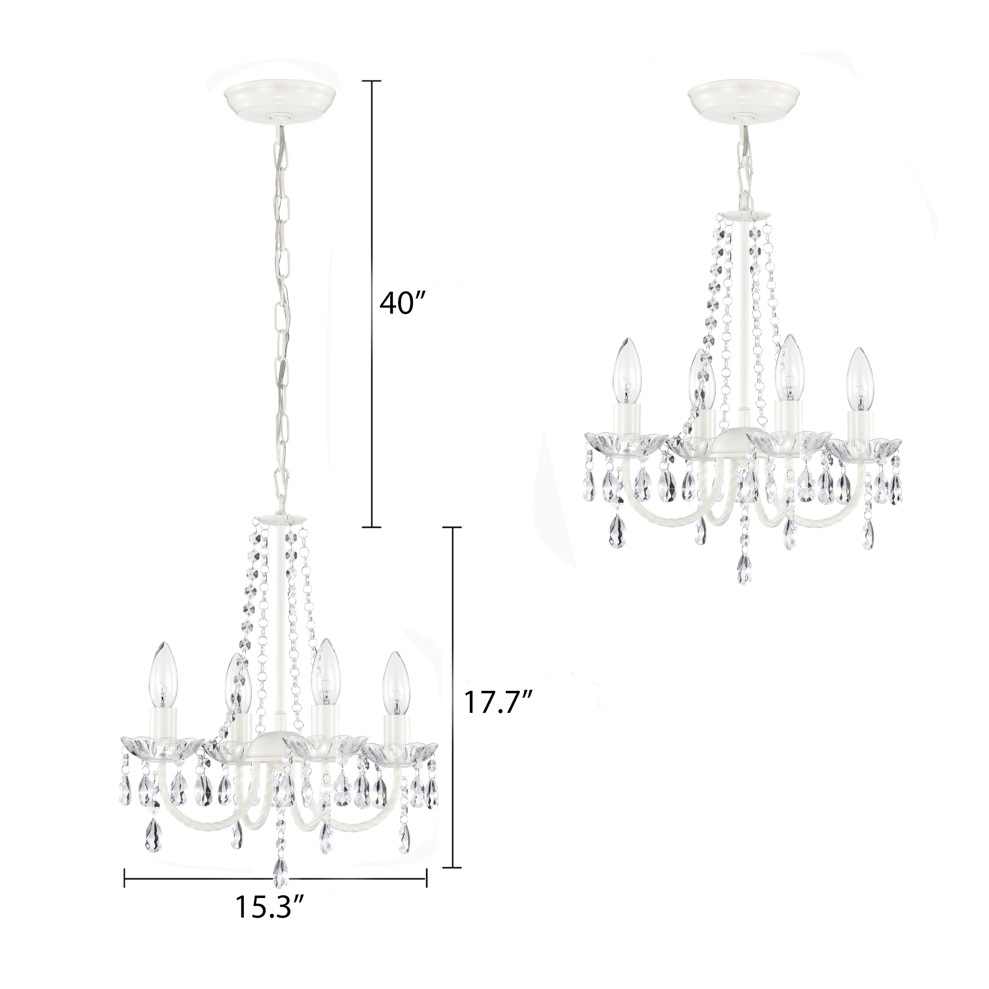 Height Adjustable: Includes 39.4 inches of chain. Light Source: Uses four 60 watts candelabra base E12 bulbs (Not Included) Dimmable: Capable of being dimmed when used with a dimmable bulb and compatible dimmer switch. Wide Application: Installed as a hardwire. Sloped ceiling adaptable. Perfect for dining room. living room. bedroom and more. Finish and Material: White finish, acrylic crystals and metal construction. Easy Installation: Detailed instructions and all mounting hardware are included.