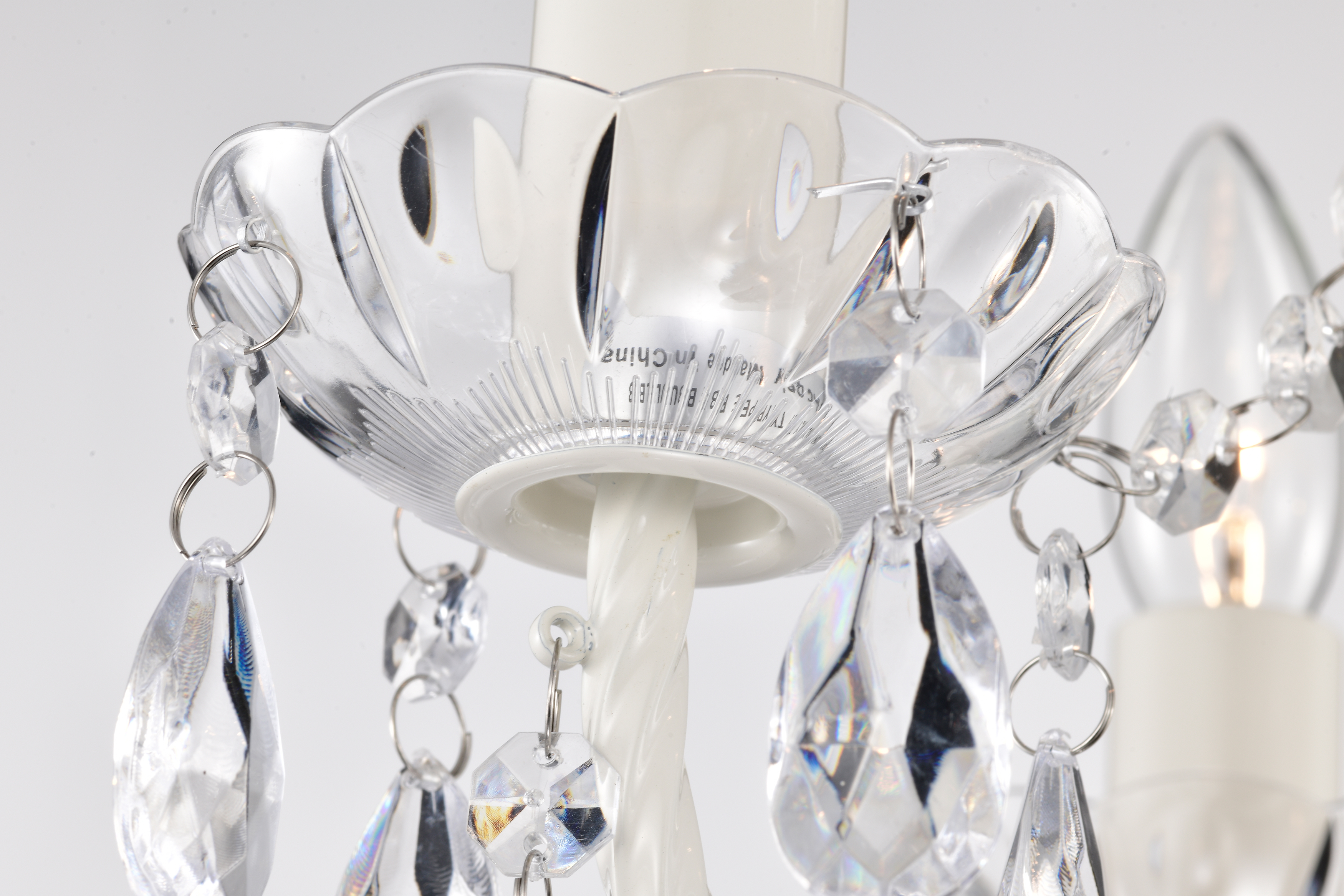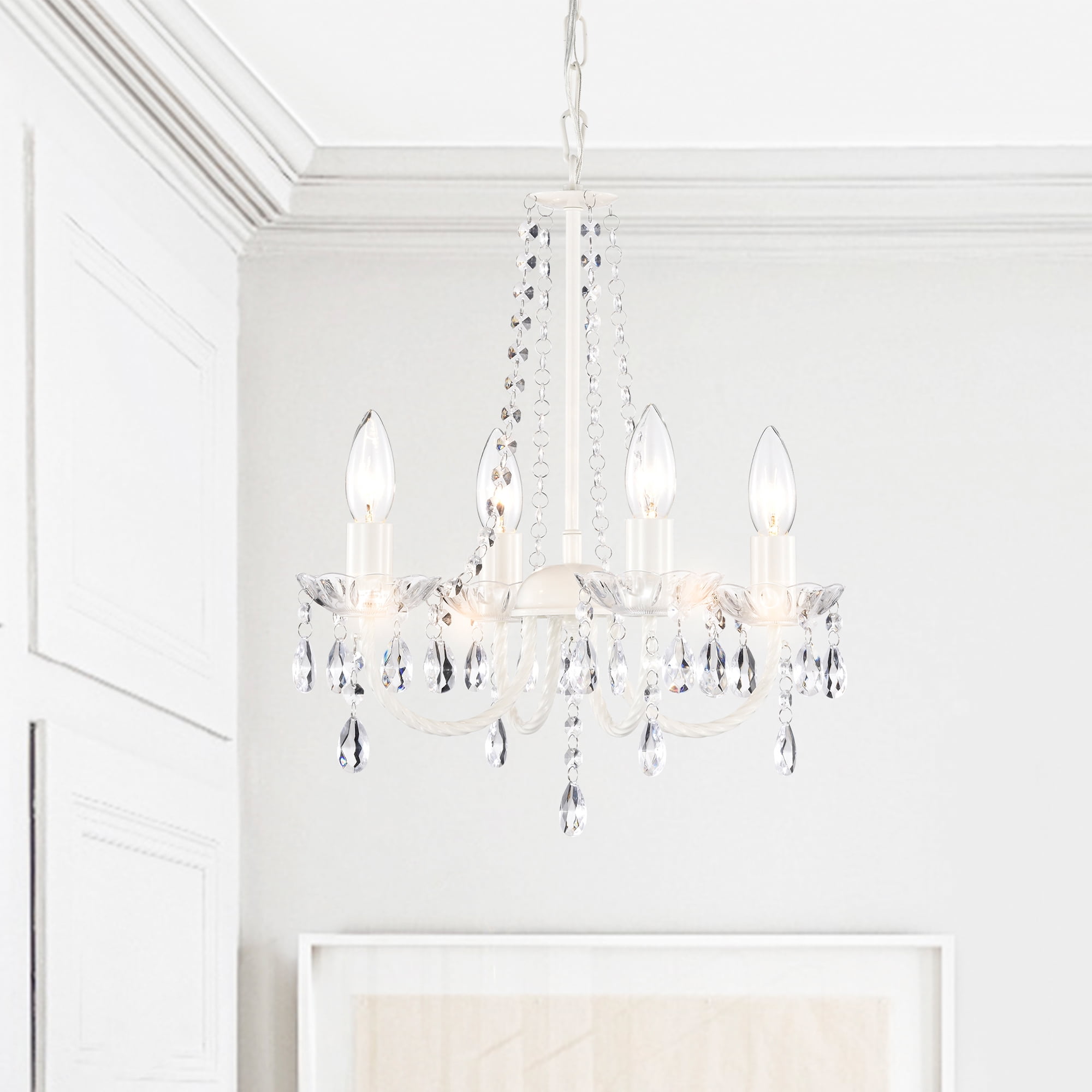 Mini Crystal chandeliers features a 4-light design and is decorated and draped with clear acrylic crystals that capture and reflect the light of the bulbs. white crystal chandelier combines a sophisticated white structure with sparkling crystals in several different shapes. White bedroom light fixture is perfect for your main living room or bedroom.
