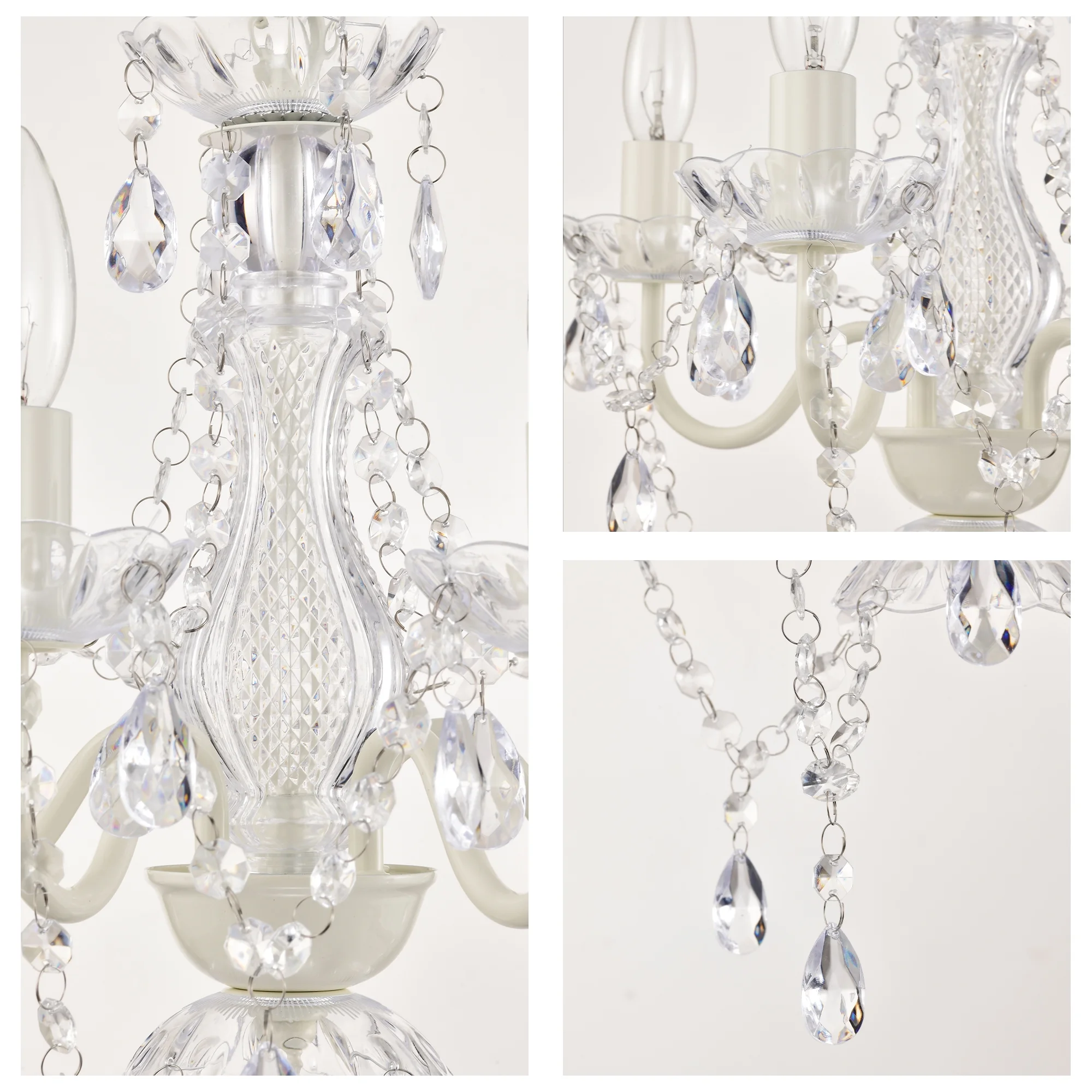 Production Dimensions: 15.7 inches in diameter x 16.5 inches high,. Weight 4.4 lbs. Height Adjustable: Includes 39.37 inches of chain and 236 inches length of cord. Light Source: Uses four 40 watts candelabra base E12 bulbs (Not Included) Dimmable: Capable of being dimmed when used with a dimmable bulb and compatible dimmer switch. Wide Application: Sloped ceiling adaptable. Perfect for dining room. living room. bedroom and more. Finish and Material: White finish, acrylic crystals and metal construction.