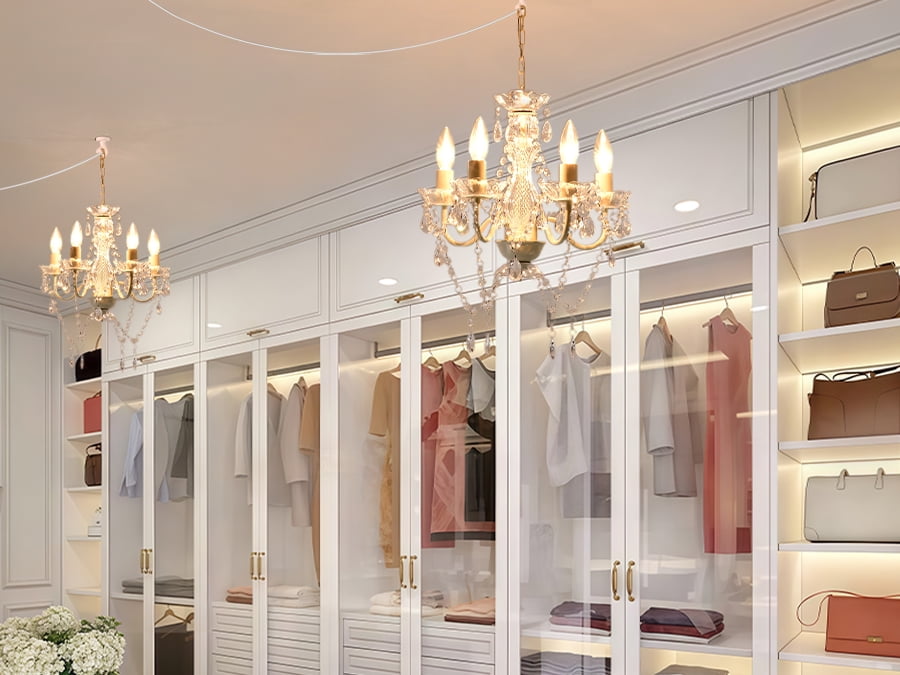 Plug in chandelier light with long cord length 236 inches. You can place this small white chandelier anywhere you want. Even if a wall socket is far away. Add glamour to your home with this White Crystal Chandelier. The vintage-look traditional design provides sparkle for dining rooms and entry areas. Plug in Chandelier comes in a scroll arm frame and is adorned with clear crystal strands and droplets. Four candelabra style lights are arranged on a single tier around the clear glass center column. This modern chandelier adds sparkle and sophistication to any space.