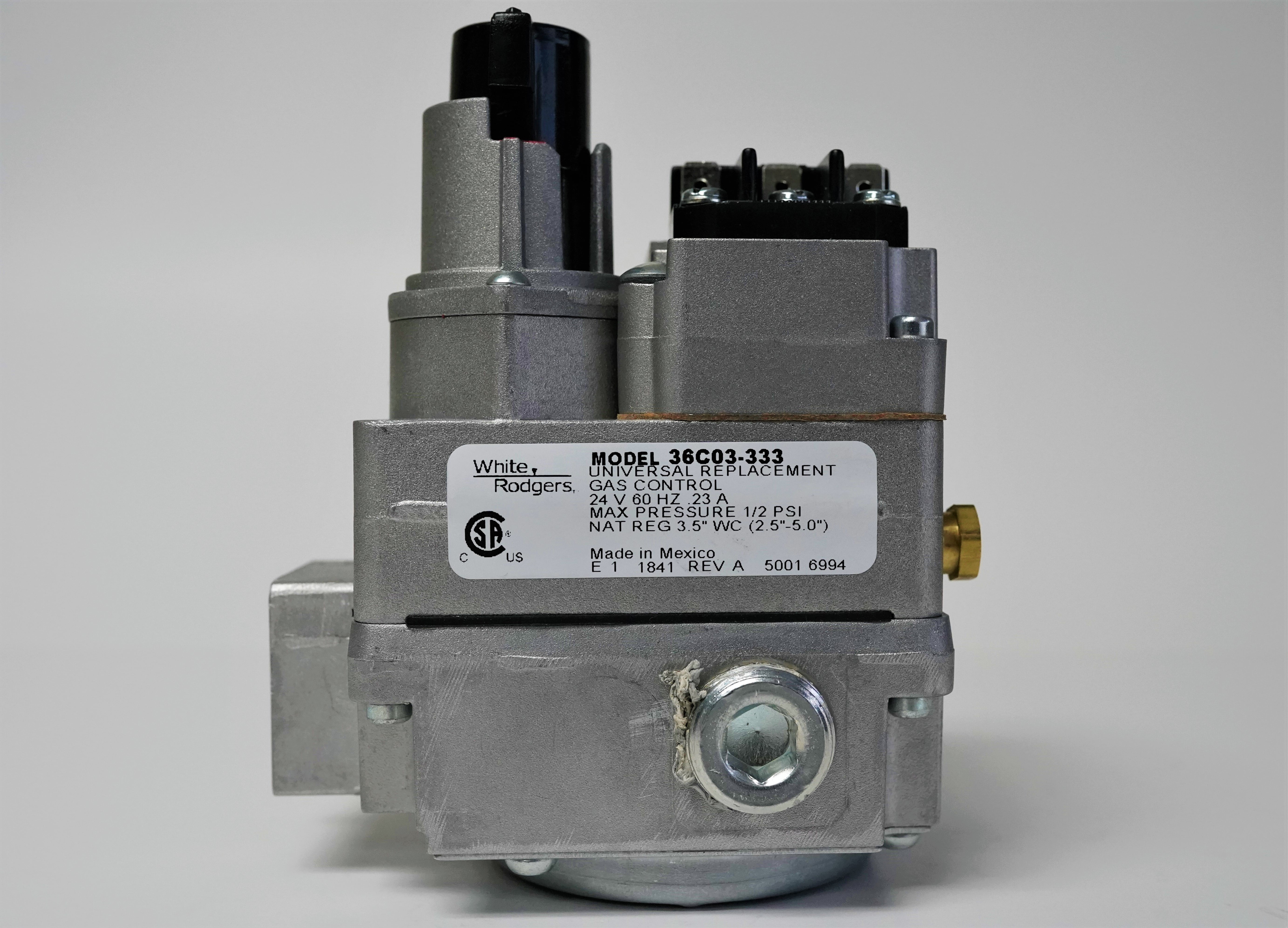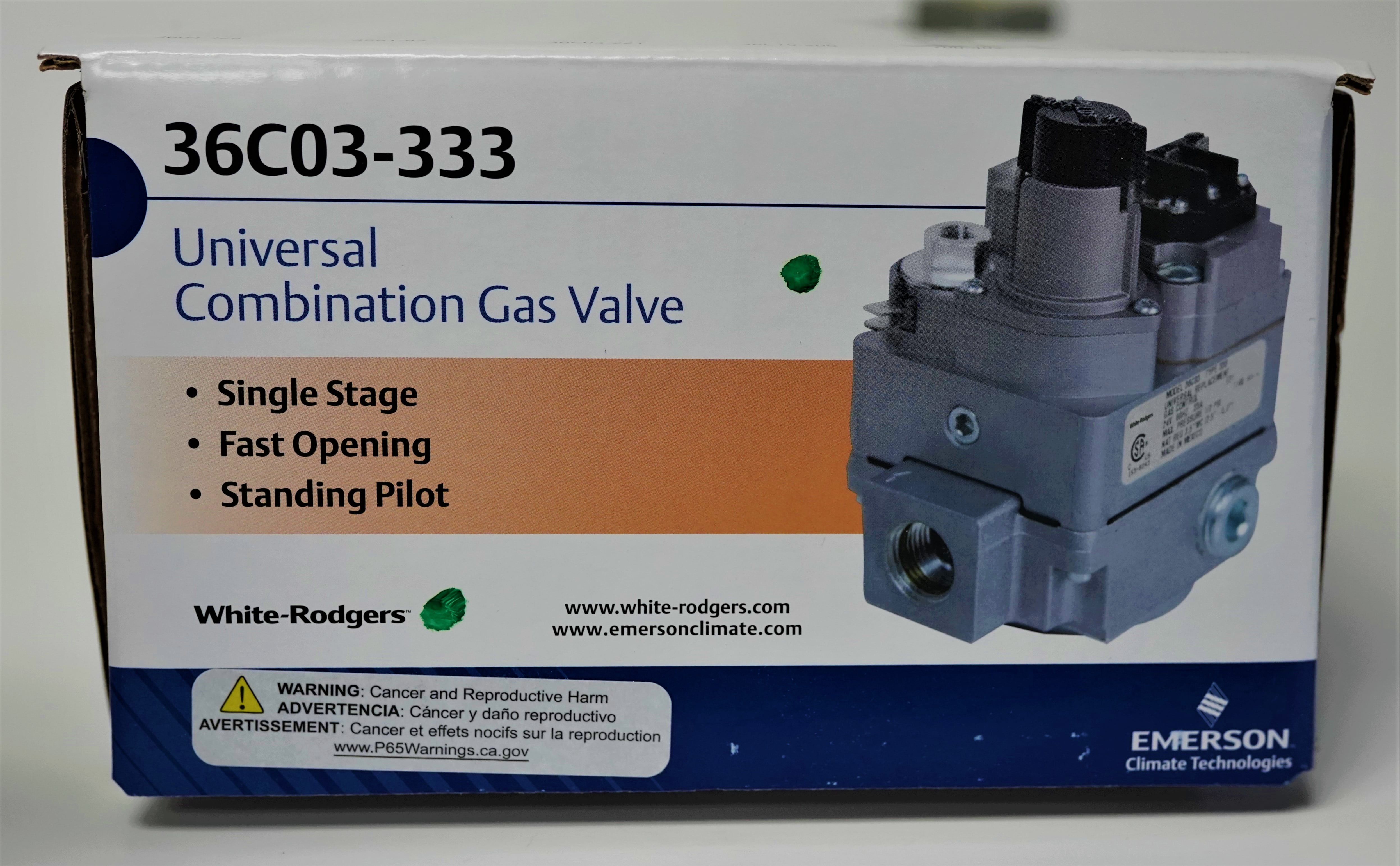 Universal standing pilot gas valve, 24 VAC, straight thru, 1/2″ x 3/4″ NPT, two reducer bushings 3/4″ to 1/2″ and 1/2″ to 3/8″ NPT. Includes LP conversion kit, eco terminals. Can also be replaced by 36C03-333 and 36C03-433.