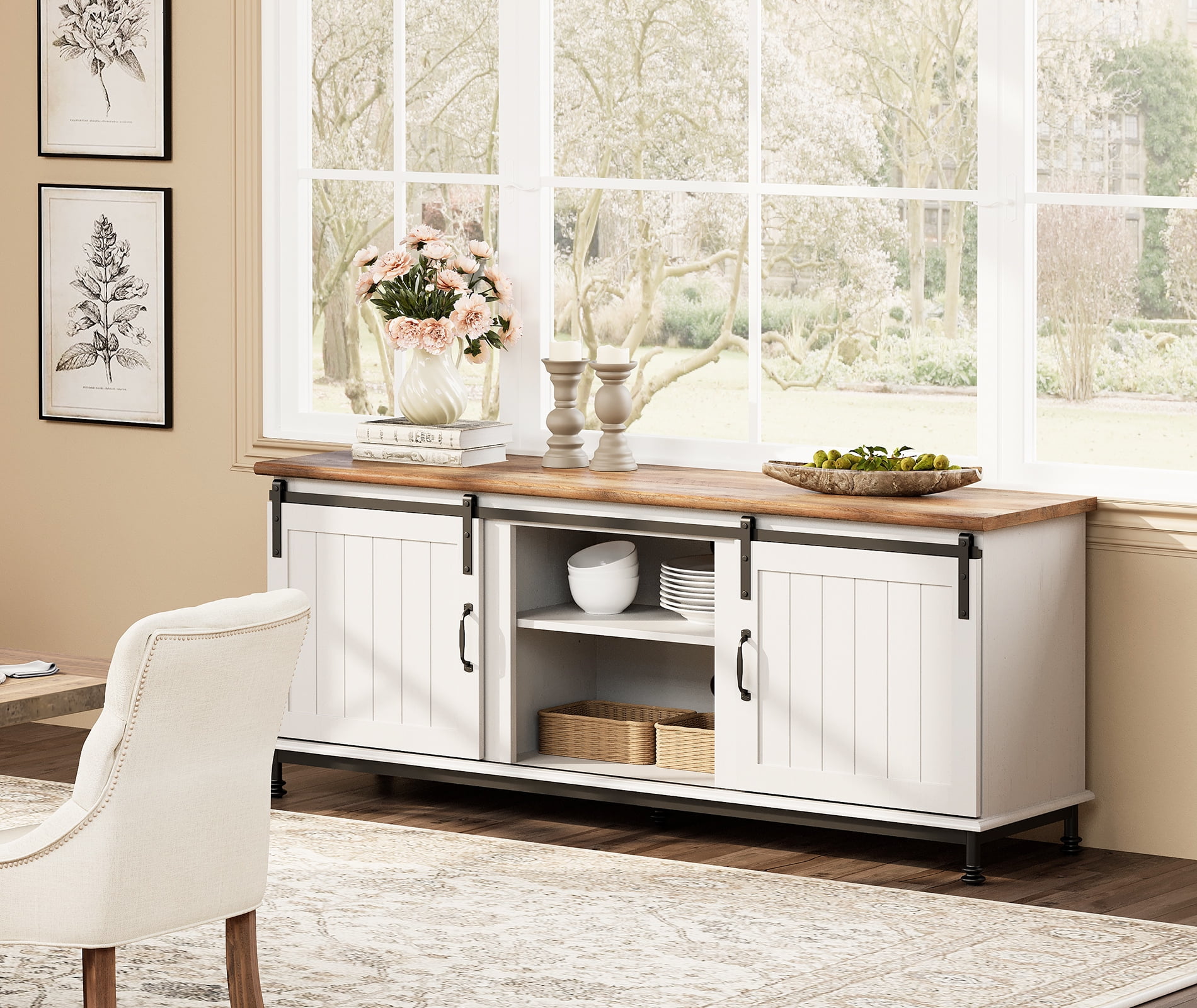 【Farmhouse Classic Style】 The tv stand for 70 inch tv features a perfect blend of modern and rustic farmhouse design, a great way to add personality and charm to your room,suitable for all the decor style and increase aesthetic for the living room or bedroom. 【Sturdy and Durable Structure】Made of environmentally premium MDF board. 4 metal legs plus extra support under bottom shelf makes this tv console table quite stable and durable and increases the weight capacity a lot. 【Cable Holes and Anti-tip Design】The back of the white TV stand is designed with a drilling hole and furniture anchors. Cable management features easy organization and hiding wires. 【Sufficient Storage Space】This 65 inch TV stand comes with 2 storage cabinets and 2 open shelves with 3 levels of adjustable and removable shelves. It can help you to store different shape of goods, easy to store your DVDs, X-box, high speakers, and game consoles. It will be a good partner for you to save space in your daily life. 【Sliding Barn Doors】The sliding barn doors are designed with wood barn surface. Easy access to cabinets and shelves via metal track,,slide smoothly and quietly.