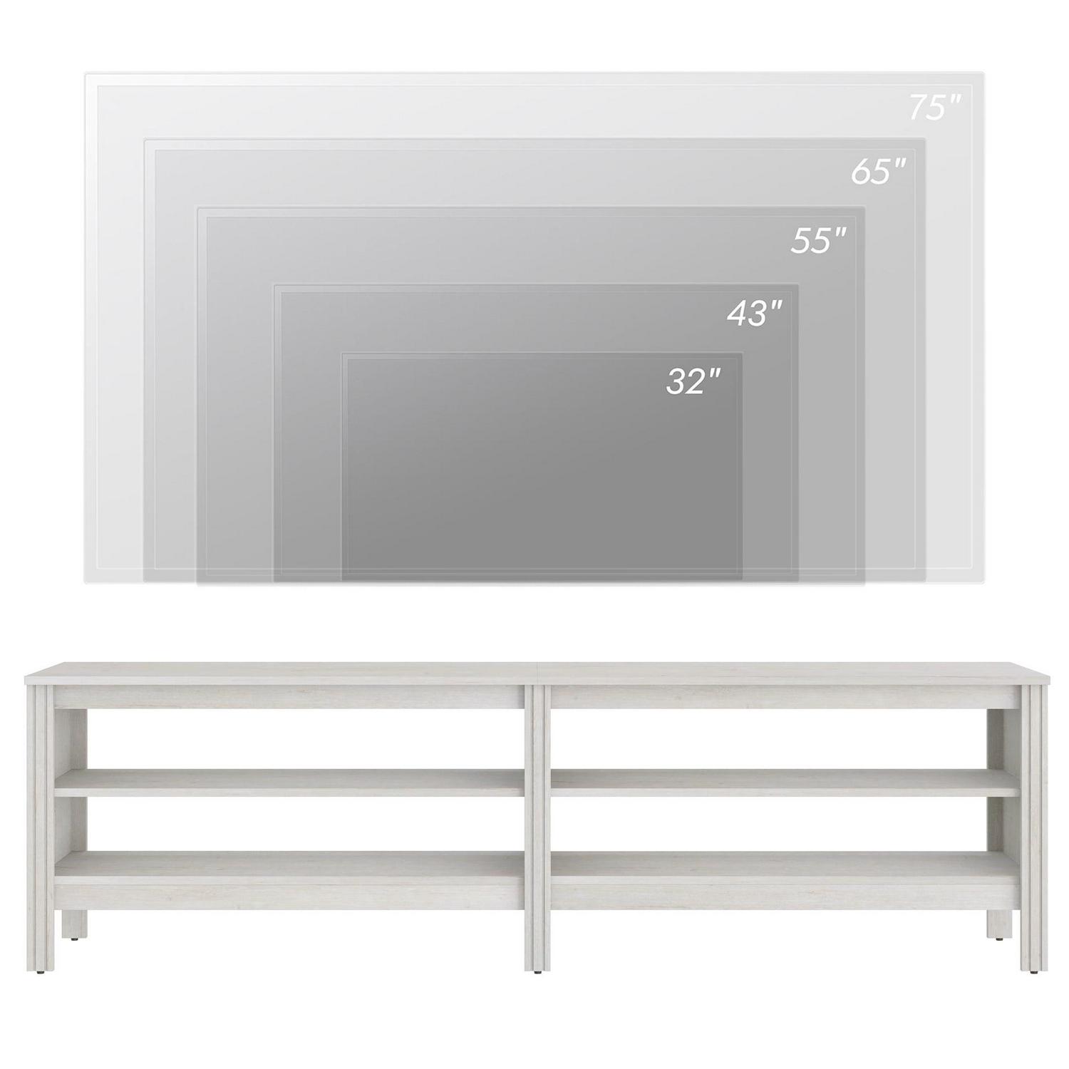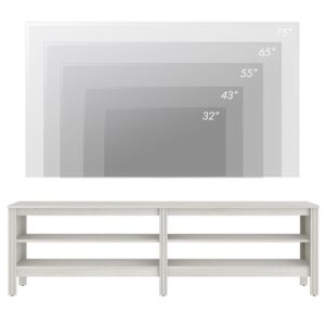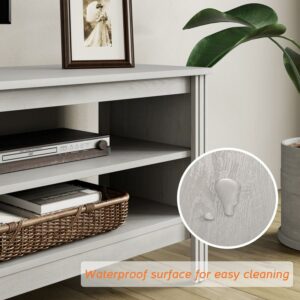 The white wood grain and simple lines on this tv stand make it look classic and elegant. It can be not only used as televison stands, also perfect for sofa table, entertainment center, media stand, storage console table, tv console etc. This TV stand is perfect for TVs up to 75 inch TV.4 open shelves with big capacity allow you to storage the books, magazines, CDs and any other media or gaming devices. The media console table made of high quality MDF which is durable and sturdy enough to be used for a long time. Plus, four wooden legs further enhance stability, preventing the TV stand from wobbling. Max load capacity: 260 lbs. The white entertainmen center for 75 inch tv with smooth surface is waterproof and easy to keep clean with a damp cloth. The tv table is 3.9 in high height off the ground which adequate for robot vacuum cleaner can passing freely. No more headaches from dust under the cabinet.