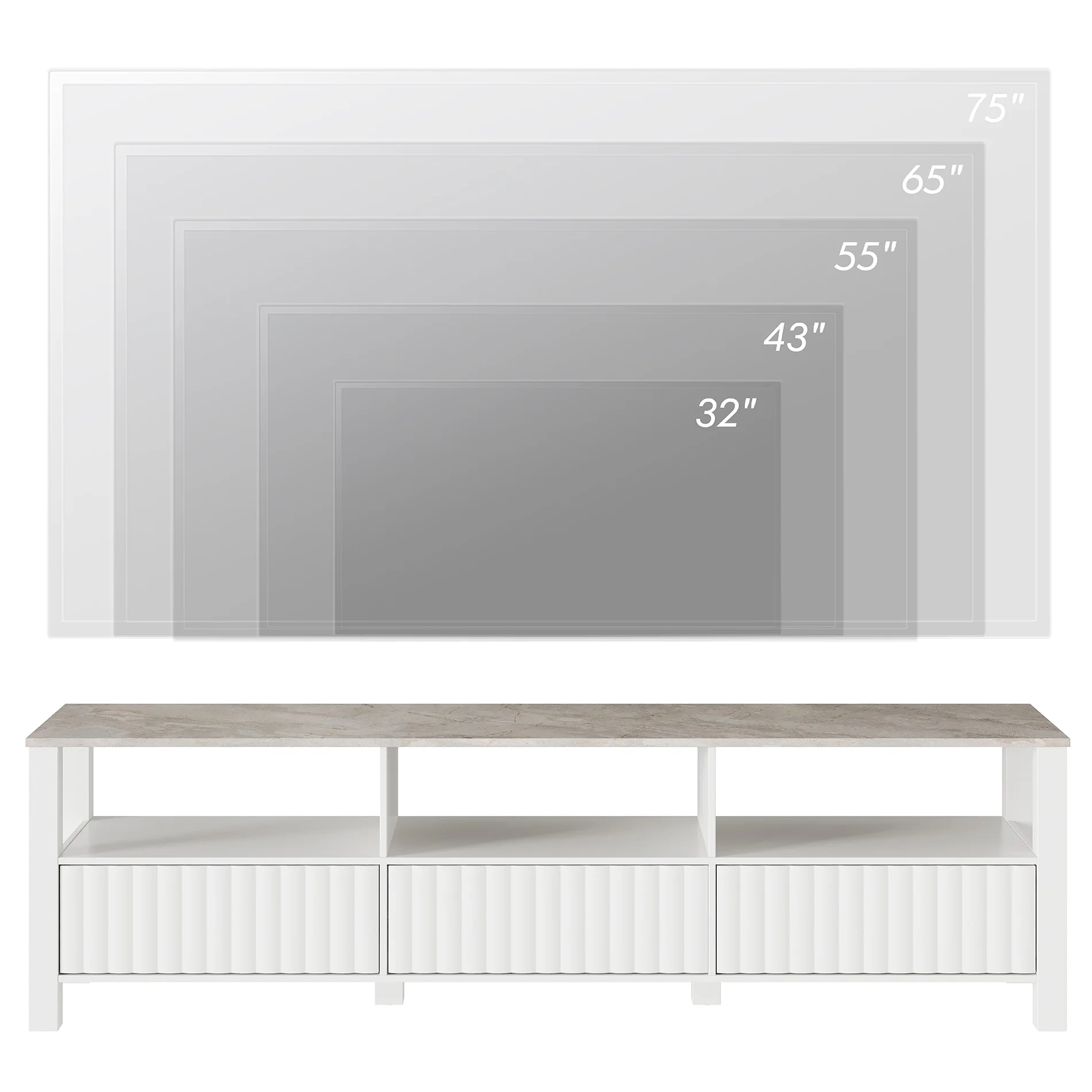 Note: The item is sent in two packages, so you may receive three packages at different timesFeaturing custom stone pattern tabletop and handmade fluted wood door, the elegant tv cabinet will be the most eye-catching piece of furniture in the room. Coming with a warm white LED light strip will create amazing lighting effect.The tv stand can be used together as a large tv stand for 85+ inch tv. And it also can be used separately as one 70 inch tv stand and one small side table suitable for living room, bedroom, lounge, office and many other places.Overall Dimension: 87.6”×15.6”×19.7”(L×W×H)