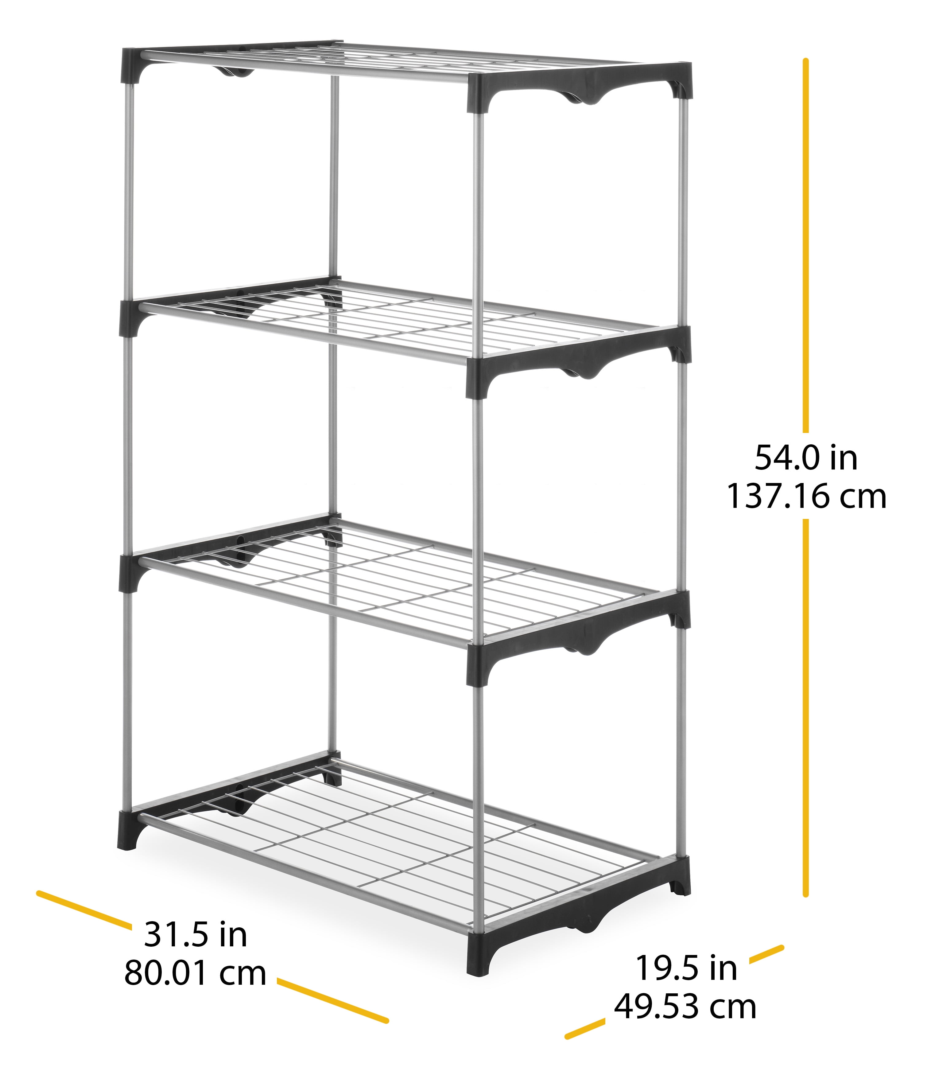 Add extra shelf storage quickly with Whitmor’s 4 Tier Closet Shelves. These extra strong wire shelves are held together with heavy-duty resin end connectors. The coated metal silver-colored frame creates a sturdy shelving unit suitable for use in the closet, basement, laundry room or any place you need some organized storage space. Easy to care for, just wipe with a clean damp cloth to keep it looking as good as new for years to come. Easy no tool required assembly.