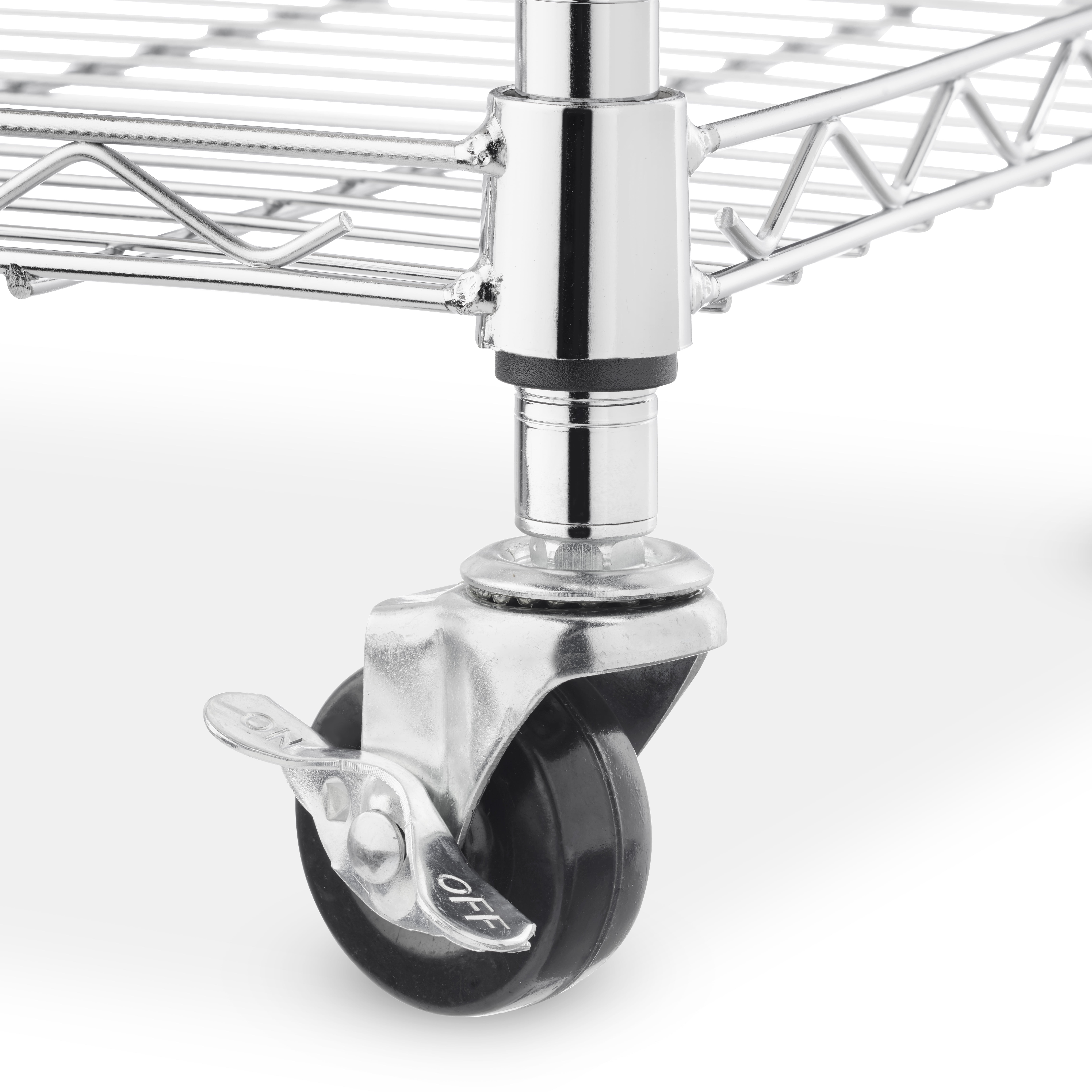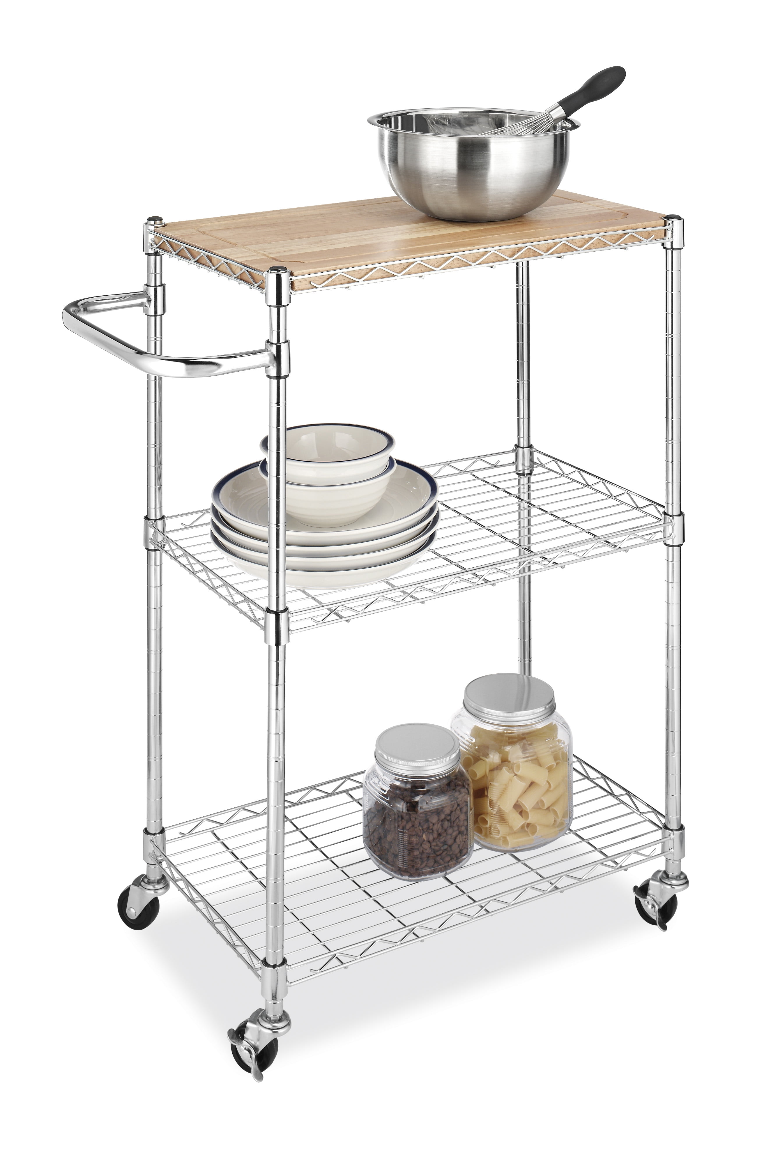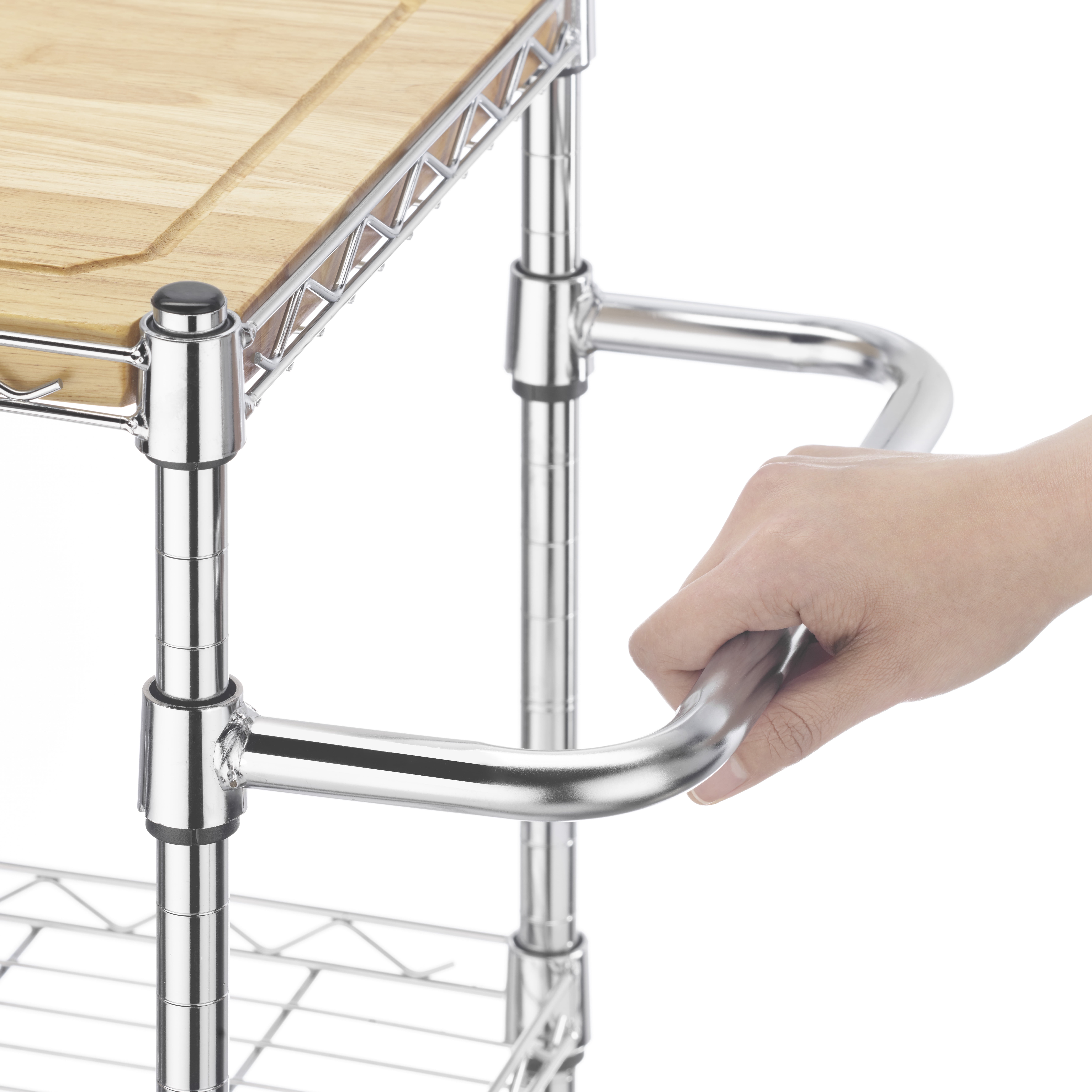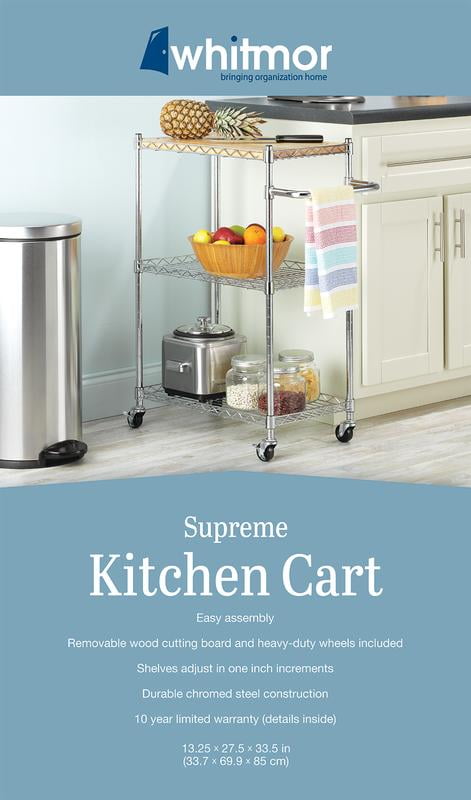 Kitchen and Microwave Cart Storage and Microwave Cart A food-safe wooden cutting board is easily removed for cleaning Shelves adjust in one-inch increments to accommodate items of different heights Chrome handle and commercial-grade locking wheels for easy transportation Assembled Dimensions: 13.25 L x 27.5 W x 33.5 H inches Easy assembly with no tools required Made with a heavy-duty, chromed steel frame and shelves Includes a 10-year limited warranty Style# 6056-37, Supreme Kitchen Storage and Microwave Cart – Wood & Chrome ‘
