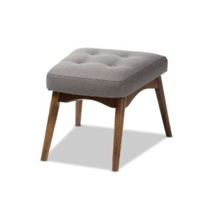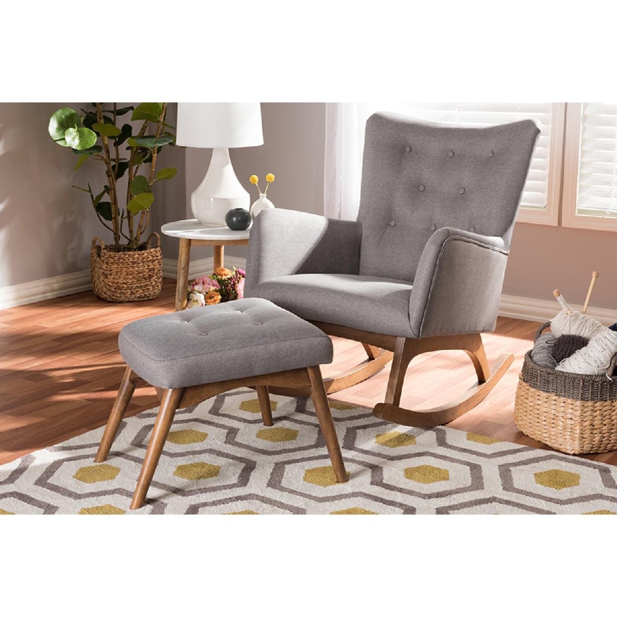 Baxton Studio Waldmann Mid-Century Modern Grey Fabric Upholstered Rocking Chair and Ottoman Set The Waldmann rocking chair and ottoman set embodies elegance, sophistication, and comfort. This mid-century modern-inspired rocking chair set is upholstered in grey fabric, resting stylishly on solid, walnut-finished rubberwood legs. The Waldmann features a tasteful, button-tufted wingback, and comes with a matching ottoman. Both the rocking chair and the ottoman are foam-padded, making it easy to get comfortable. This fashionable chair will look right at home in your livingroom, nursery, or any shared space, as the subtle design makes it easy to coordinate with your decor. Complete the clean, polished look with other pieces available in the Waldmann range. Made in Malaysia, the Waldmann requires assembly.